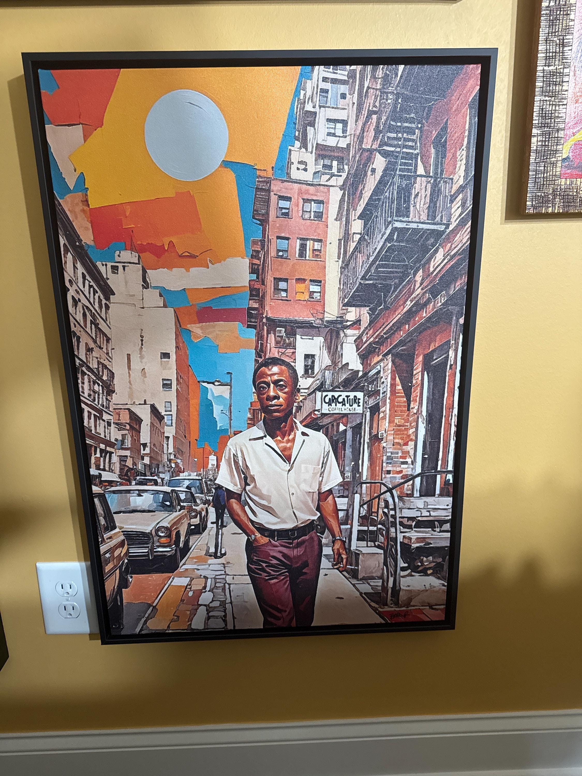 "Baldwin, Harlem Sun" is a vivid and evocative portrayal of James Baldwin, the renowned writer, and activist, set against the vibrant backdrop of Harlem, New York. The painting captures Baldwin in a moment of contemplative stride down a city street, his expression reflecting the depth of his thoughts and the weight of his experiences. The urban landscape around him blends realism and abstraction, with towering buildings and bustling streets depicted in rich, textured layers. Above, the sky is a brilliant collage of warm oranges and blues, dominated by a large, glowing sun—symbolizing the intensity and passion of Baldwin’s work in illuminating the struggles and triumphs of Black life in America. This piece celebrates Baldwin’s enduring legacy as a voice of truth and a beacon of intellectual and social progress.