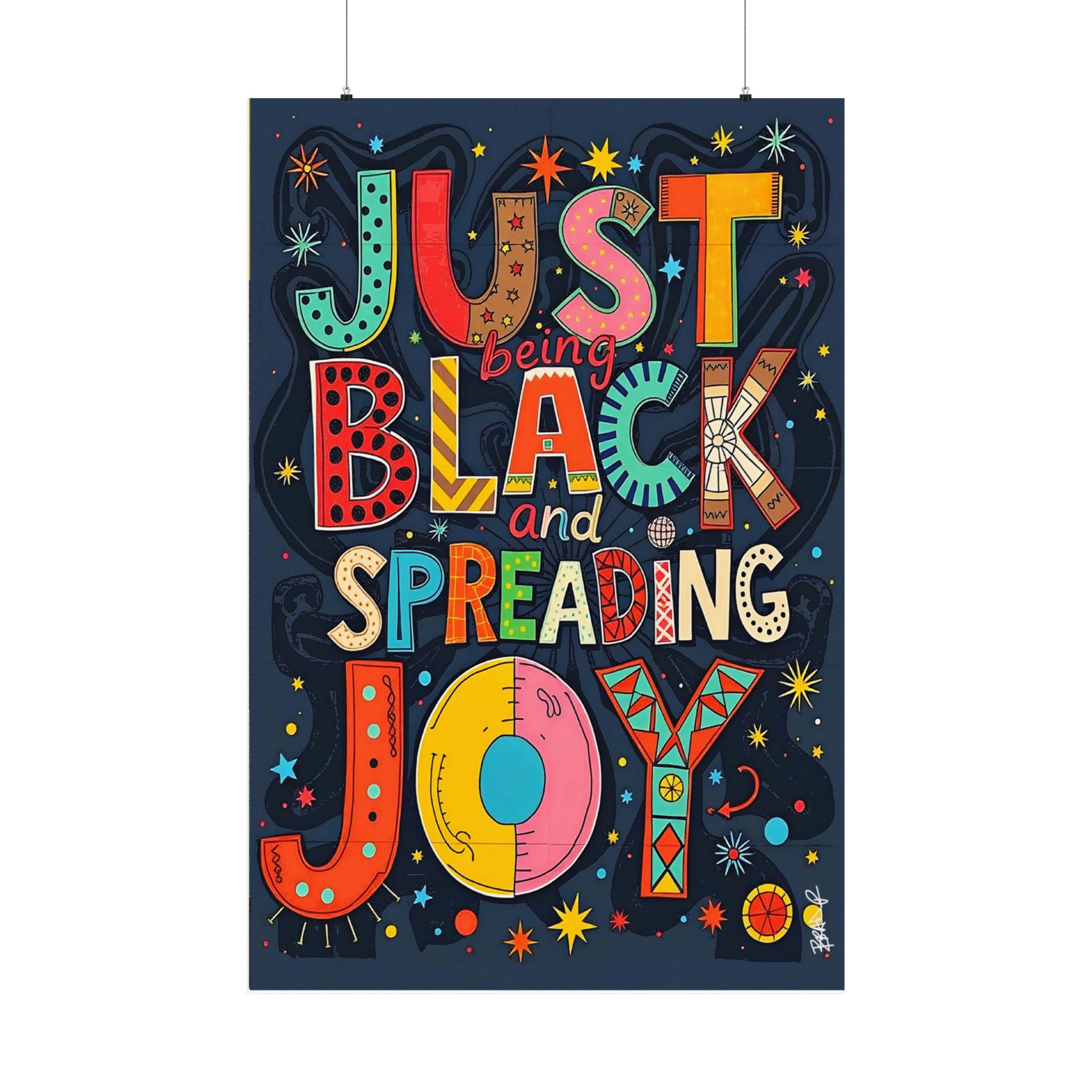 This playful and uplifting digital art poster, Just Being Black and Spreading Joy, radiates positivity, pride, and celebration. The message is brought to life through bold, colorful typography, where each letter bursts with personality, featuring patterns such as polka dots, stripes, stars, and geometric designs. The vibrant colors—reds, yellows, blues, and greens—create an energetic and joyous atmosphere.