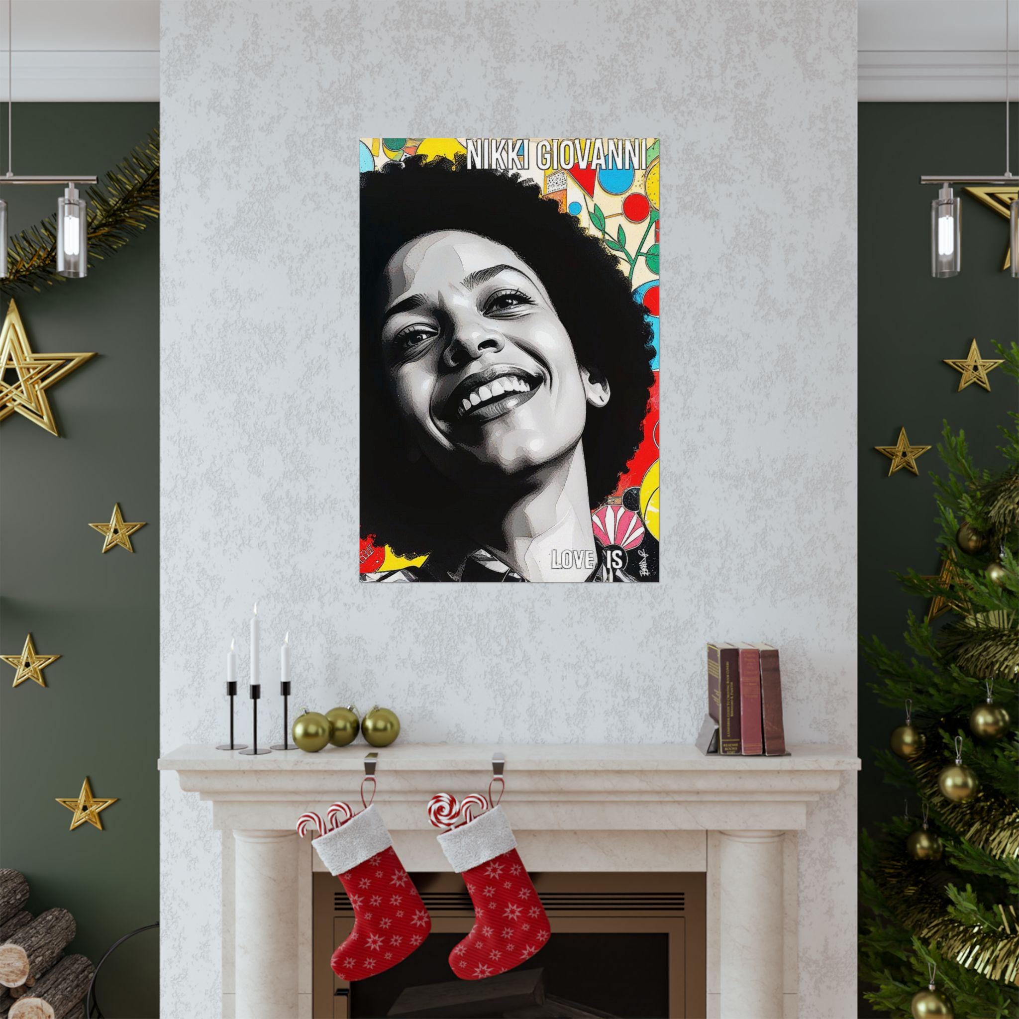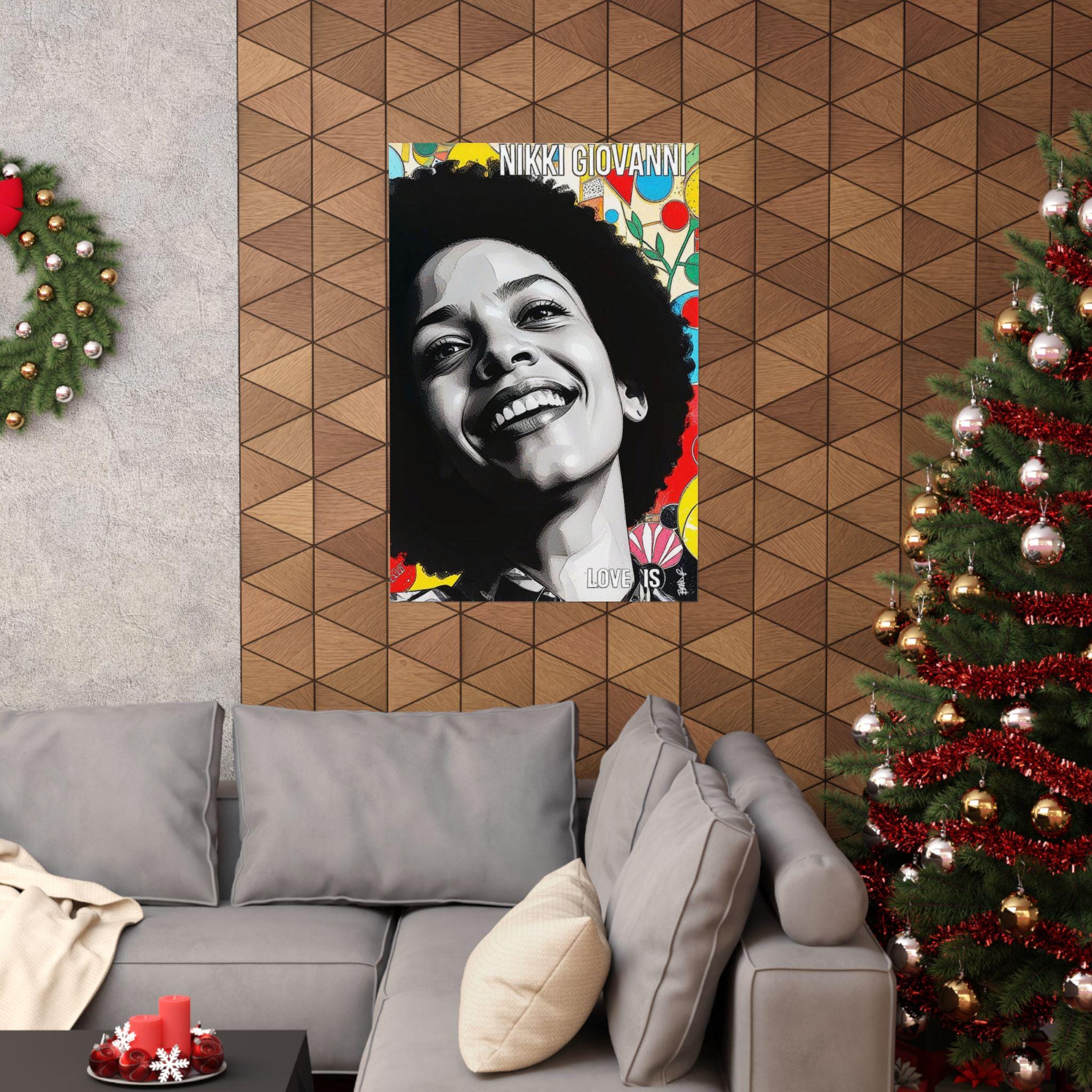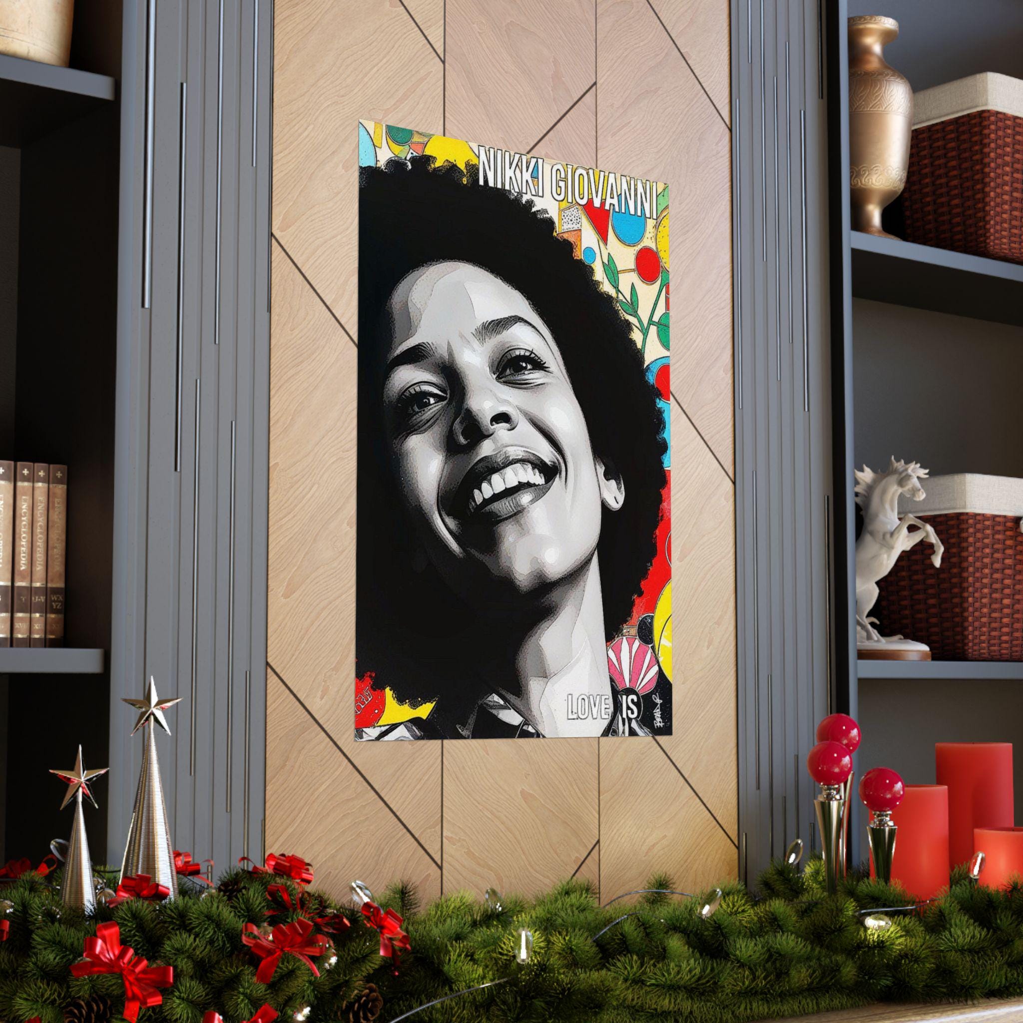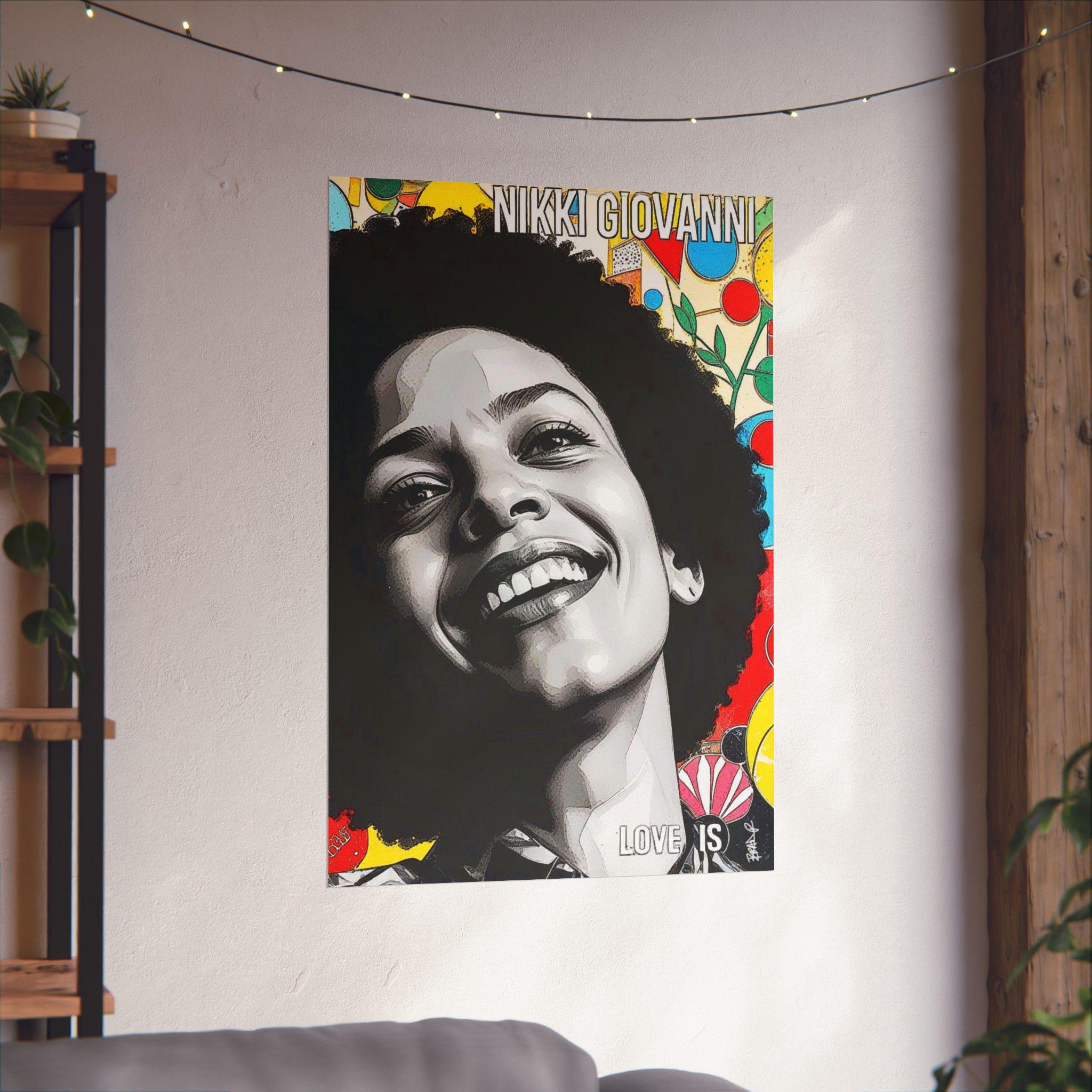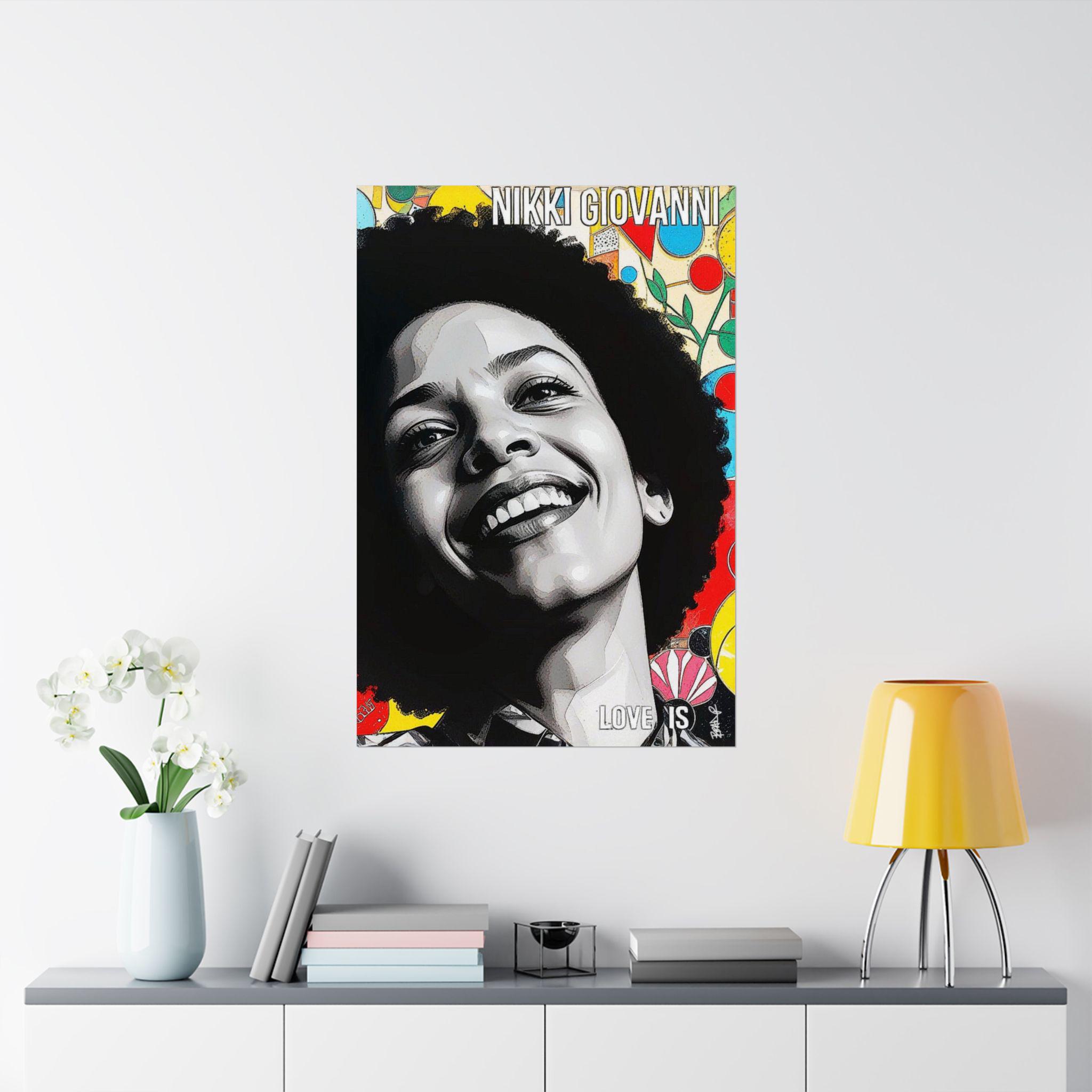 "Nikki’s Sunburst Smile" is a vibrant digital portrait celebrating Nikki Giovanni’s radiant joy and literary legacy. Her beaming smile and natural afro contrast with a dynamic, colorful background of abstract shapes and floral elements, symbolizing creativity and resilience. The mixed-media style blends photorealism with pop-art energy, making her presence feel larger than life. The bold text “LOVE IS” reinforces the central theme of her work, love as resistance, survival, and power. This piece captures not just her likeness but the essence of her brilliance and unapologetic Blackness.