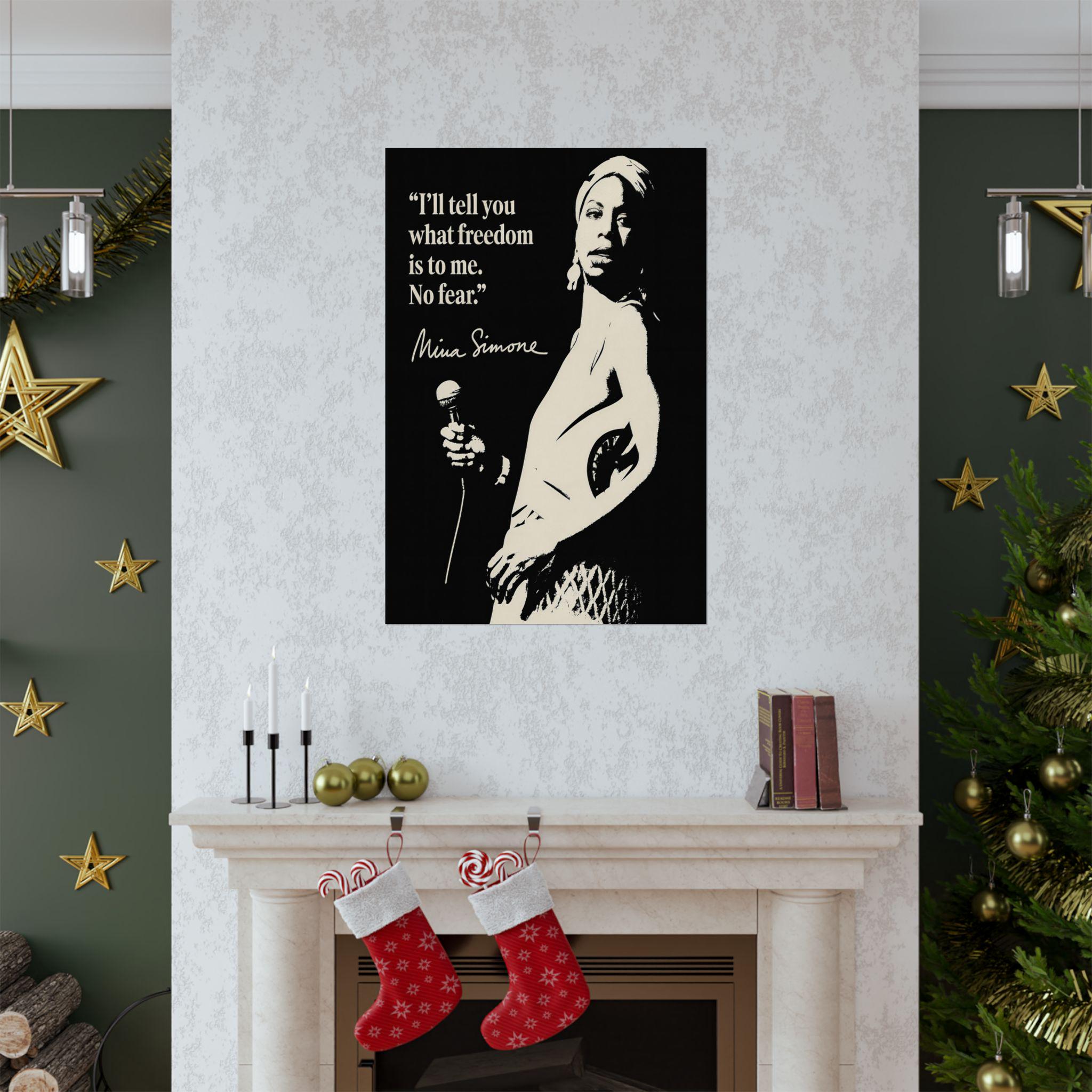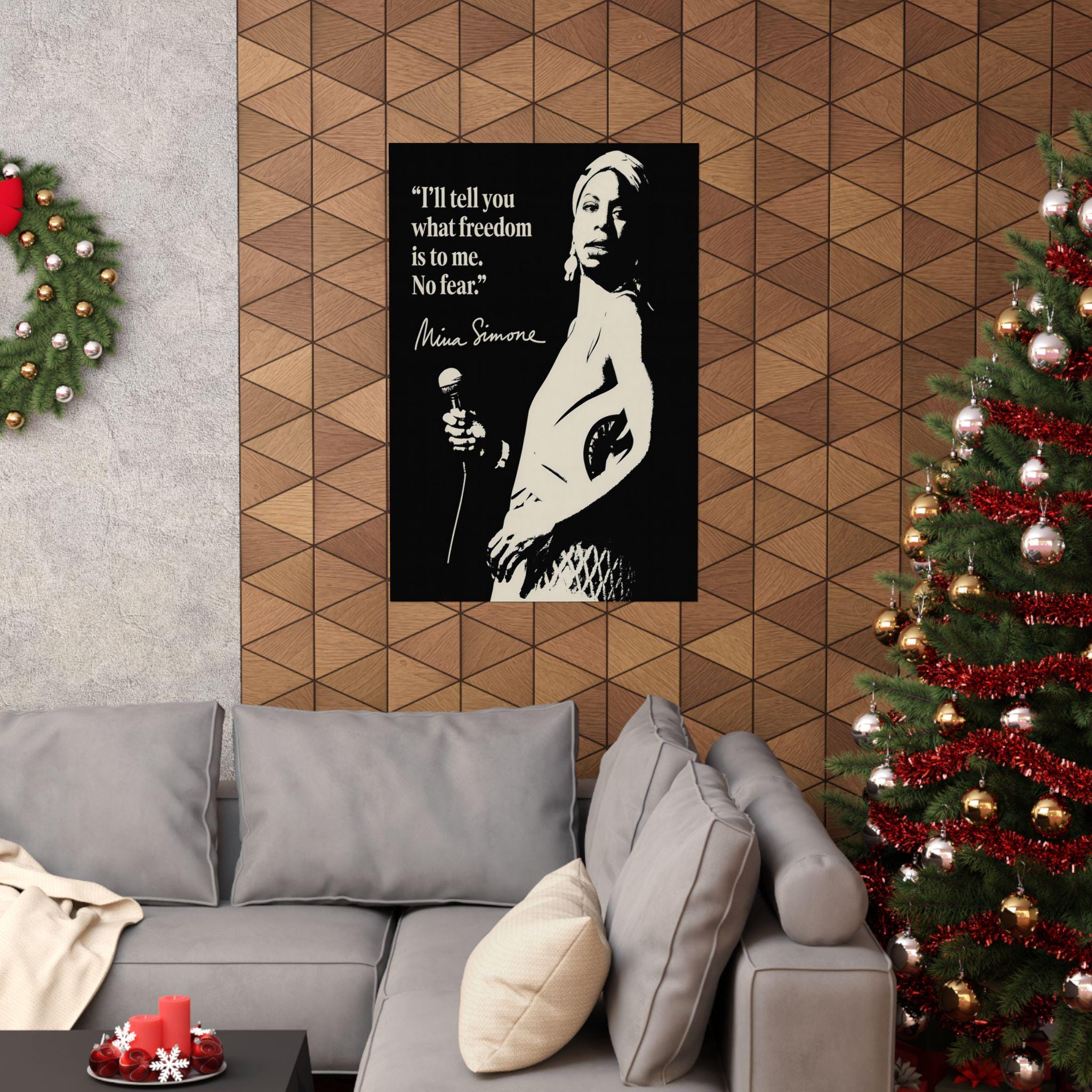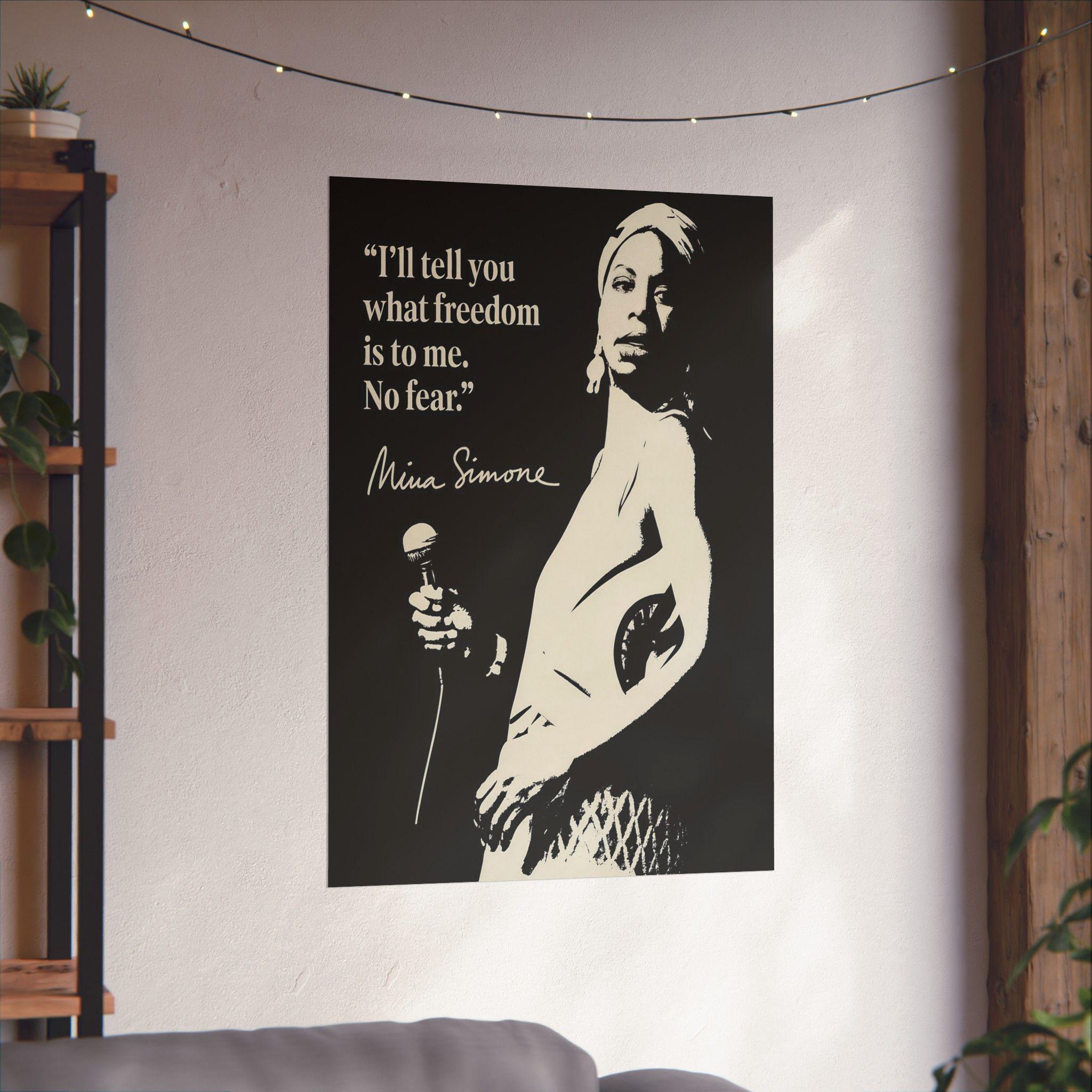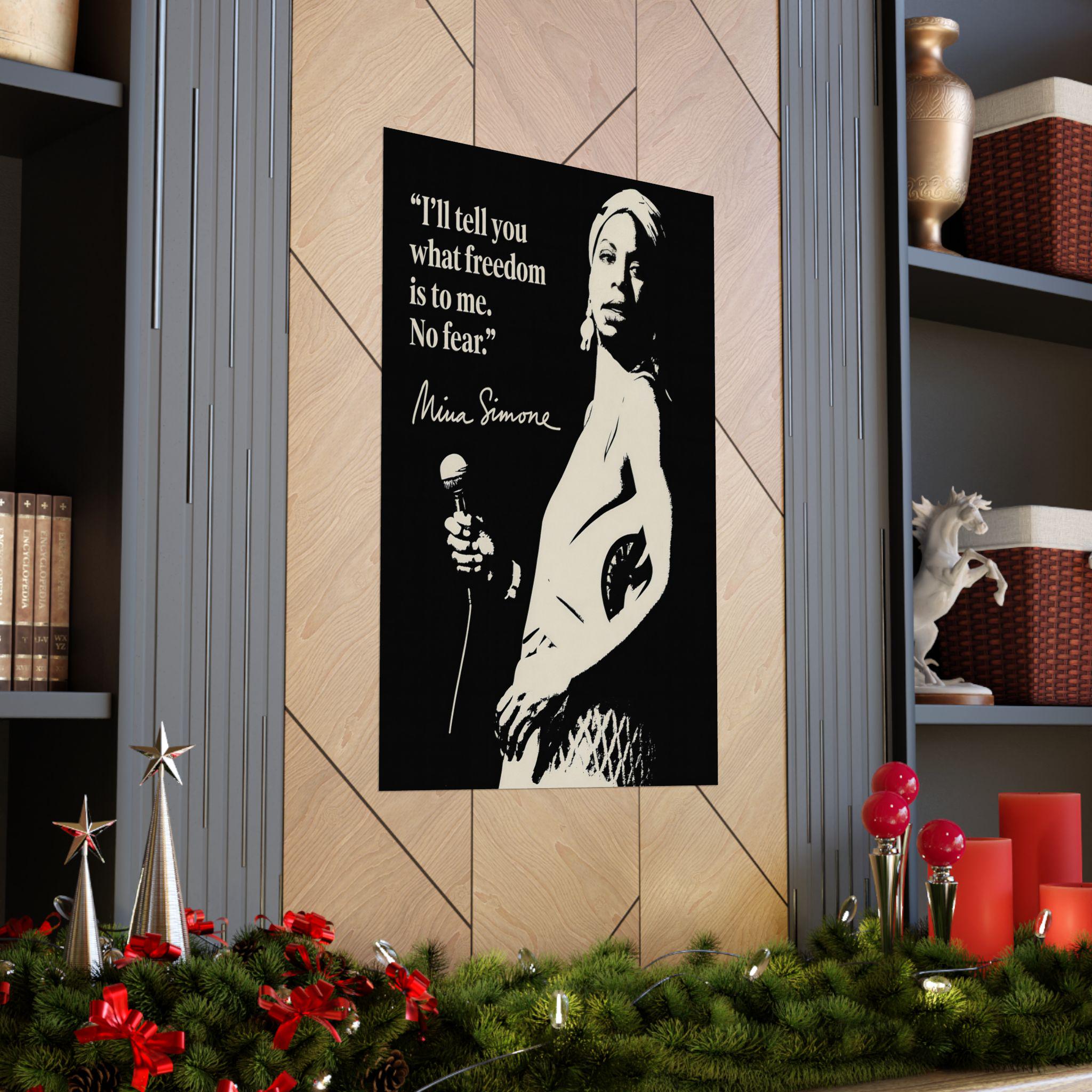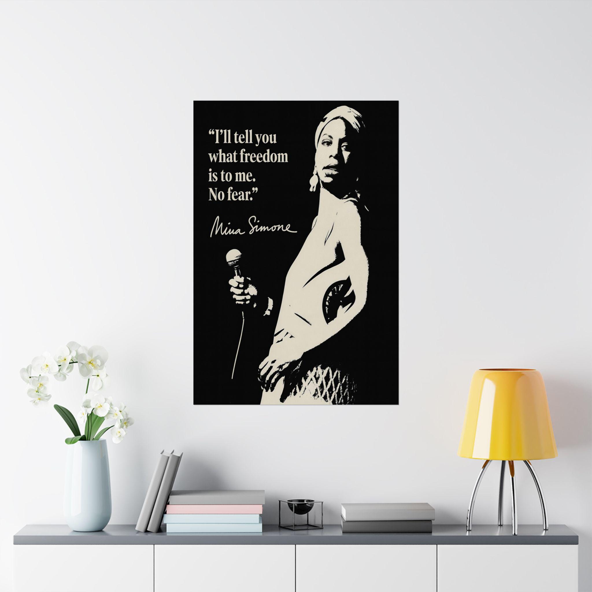 A striking matte poster of Nina Simone rendered in sharp black-and-white contrast. She stands poised with a microphone, embodying defiance and grace. The powerful quote, “I’ll tell you what freedom is to me. No fear,” sits beside her, signed with her name, making this piece both an artistic portrait and a declaration of liberation.