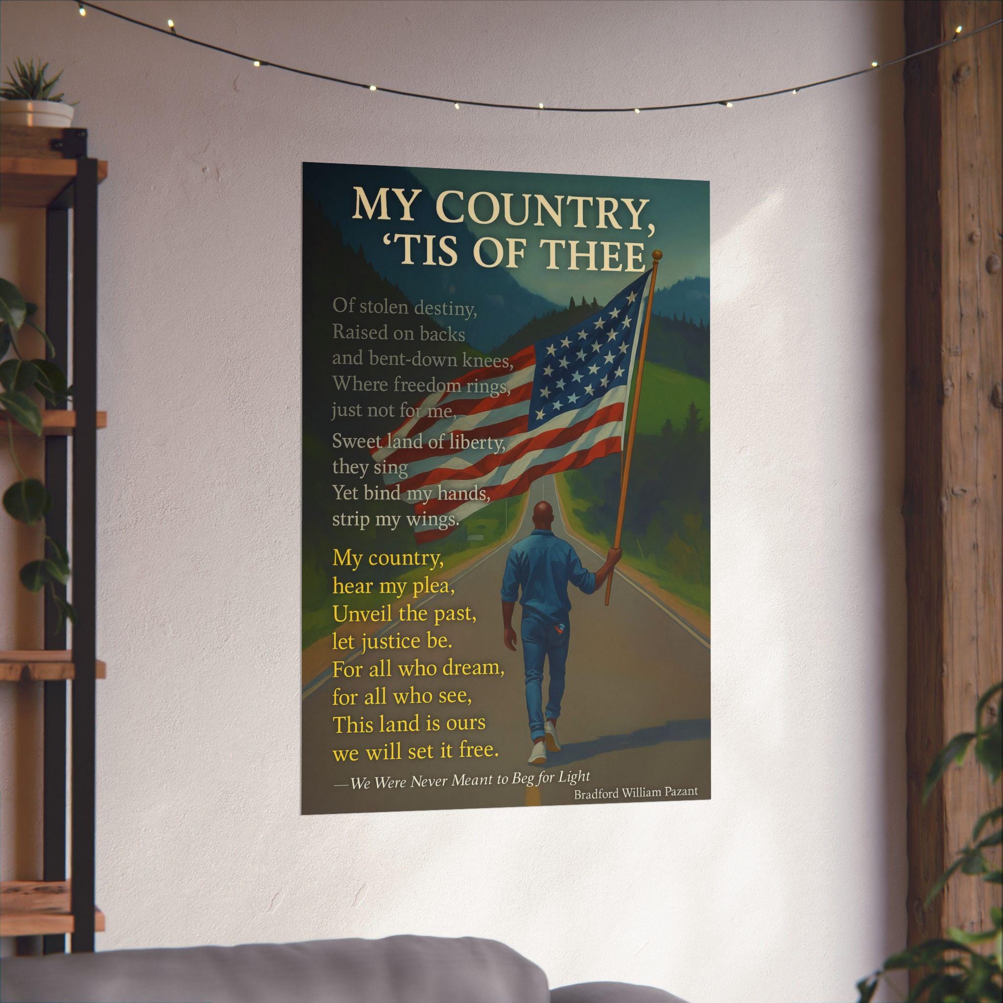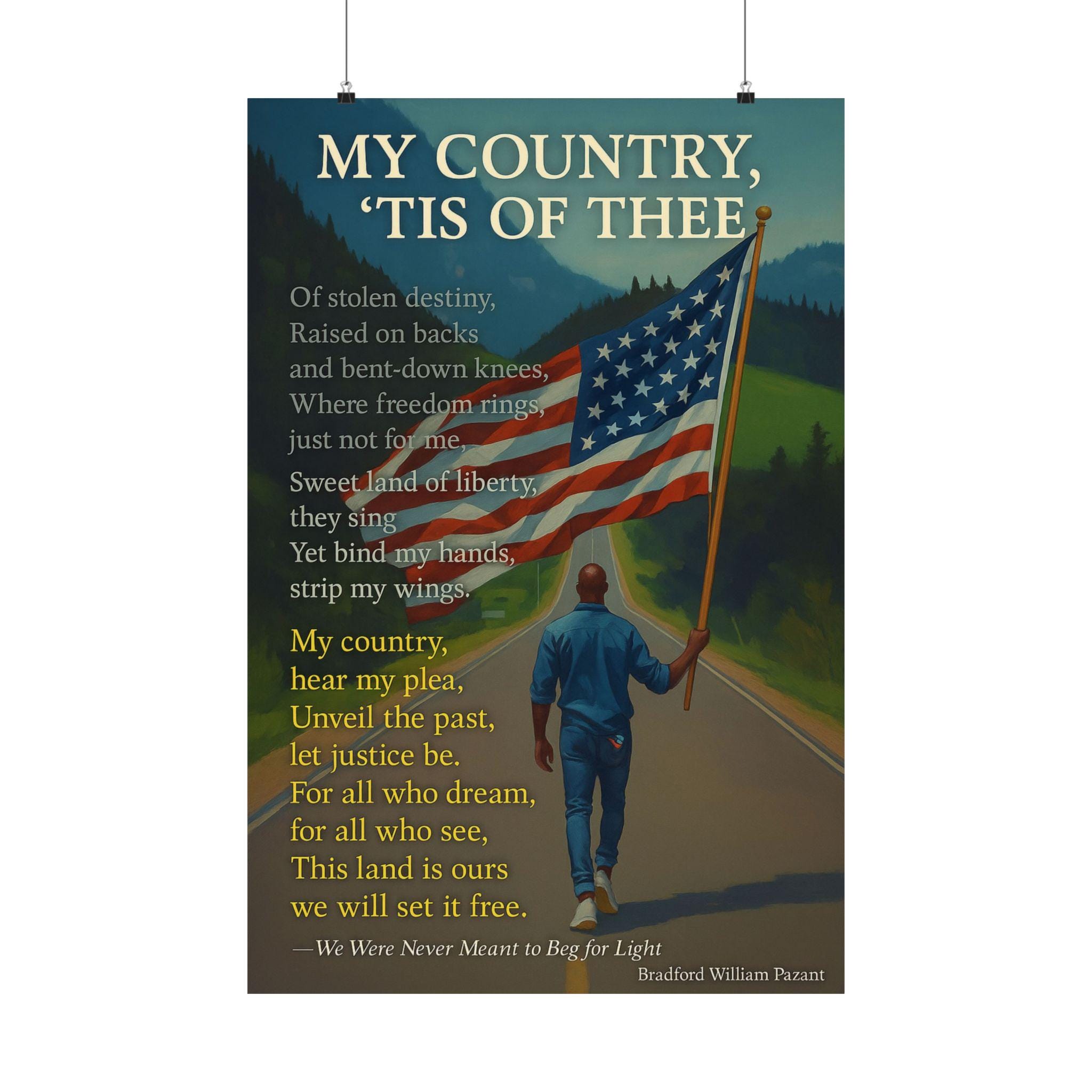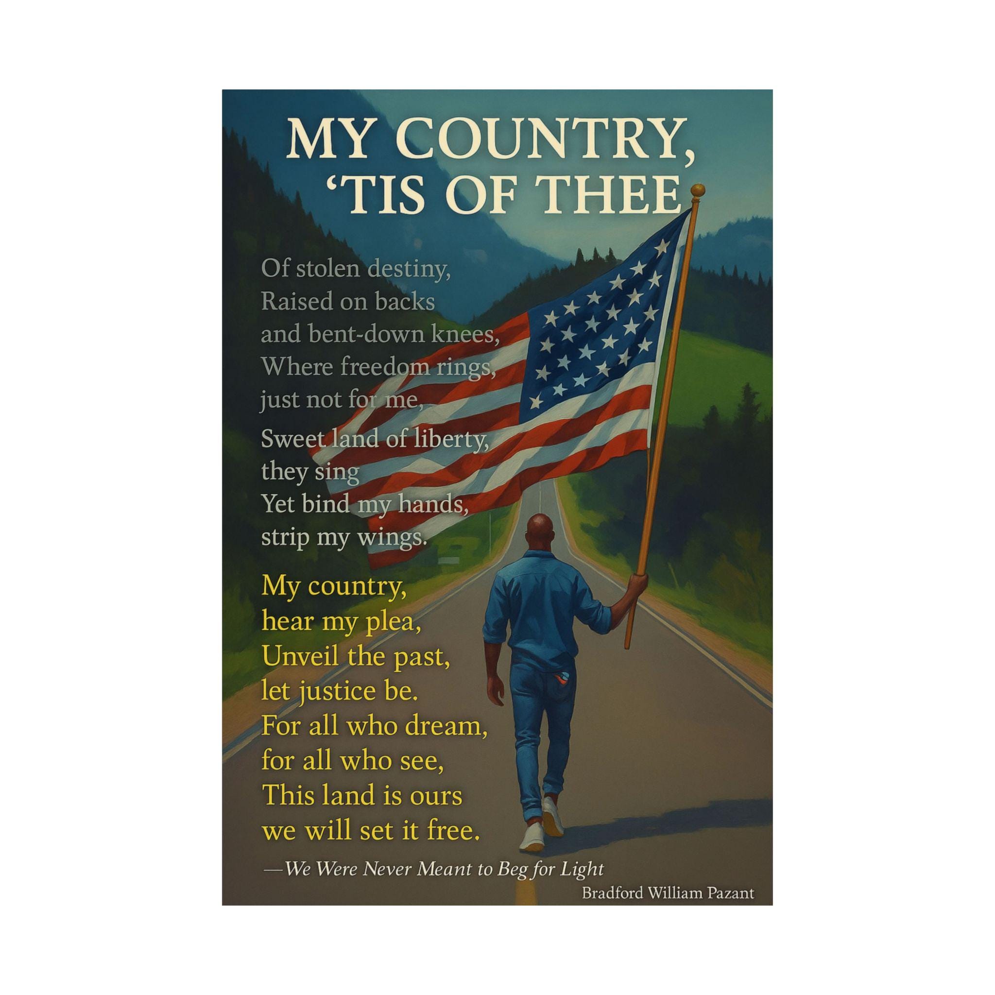 This powerful poster features a lone Black man walking boldly down an open road, carrying an oversized American flag on his shoulder. The backdrop of rolling green hills and distant mountains contrasts with the weight of the imagery, symbolizing both burden and resilience. Across the flag, verses from We Were Never Meant to Beg for Light are overlaid, reframing the patriotic hymn “My Country, ’Tis of Thee” into a plea for justice, truth, and freedom. The text shifts from somber tones in gray to urgent, impassioned lines in bright yellow, emphasizing the demand for liberation and collective justice. At the bottom, the author’s name, Bradford William Pazant, anchors the piece, asserting authorship and legacy.