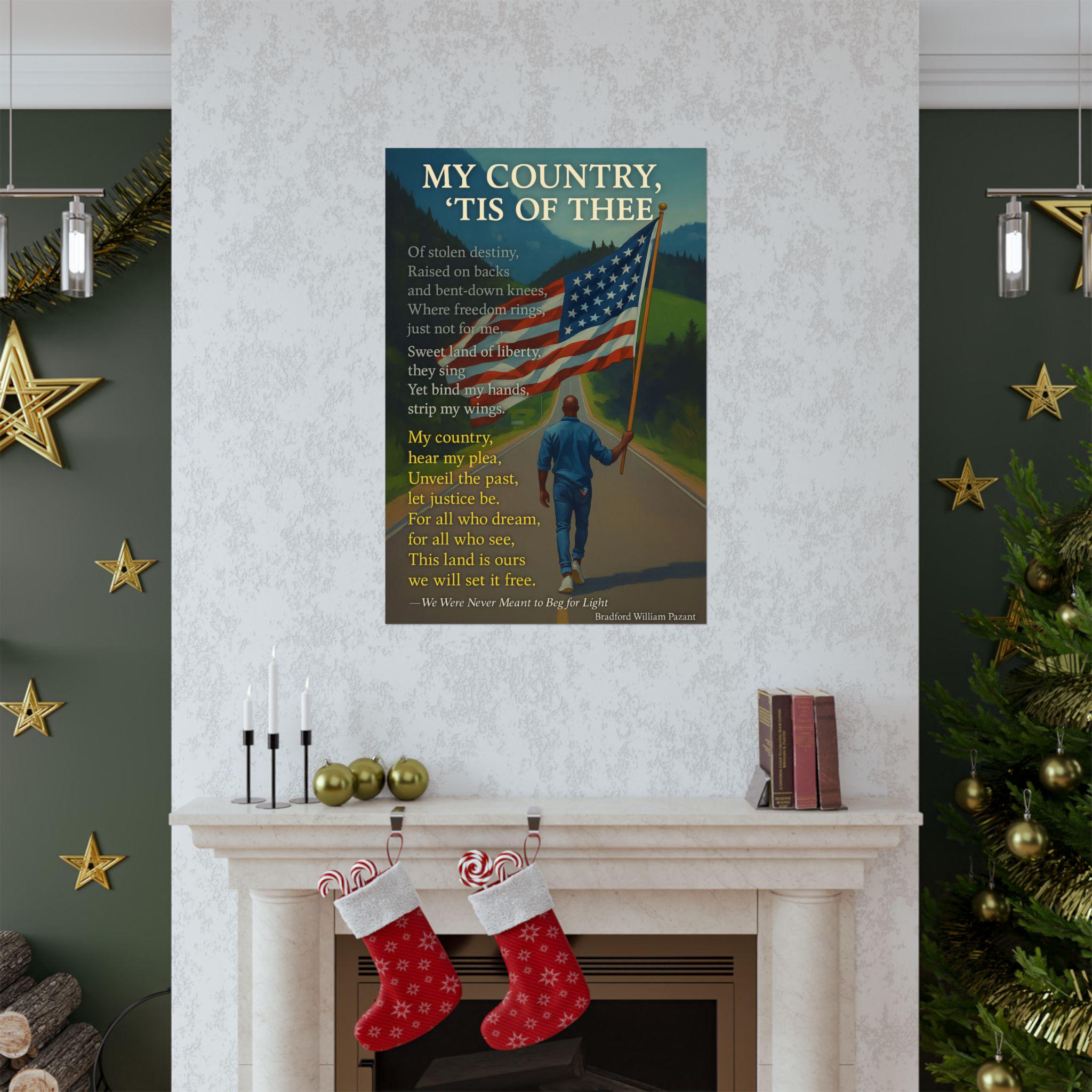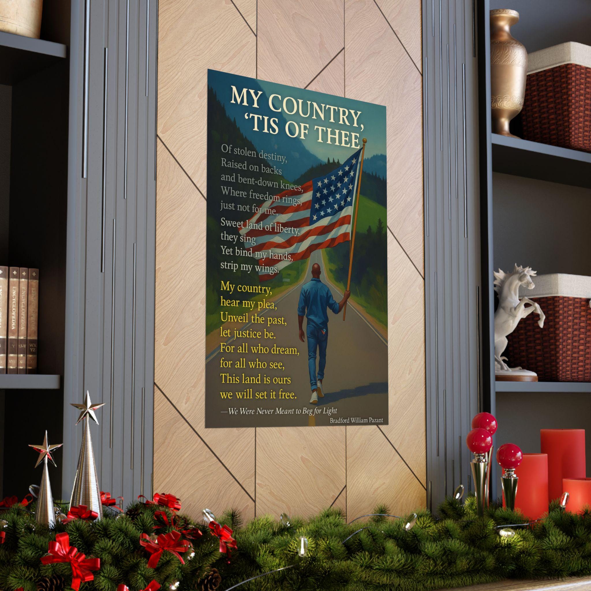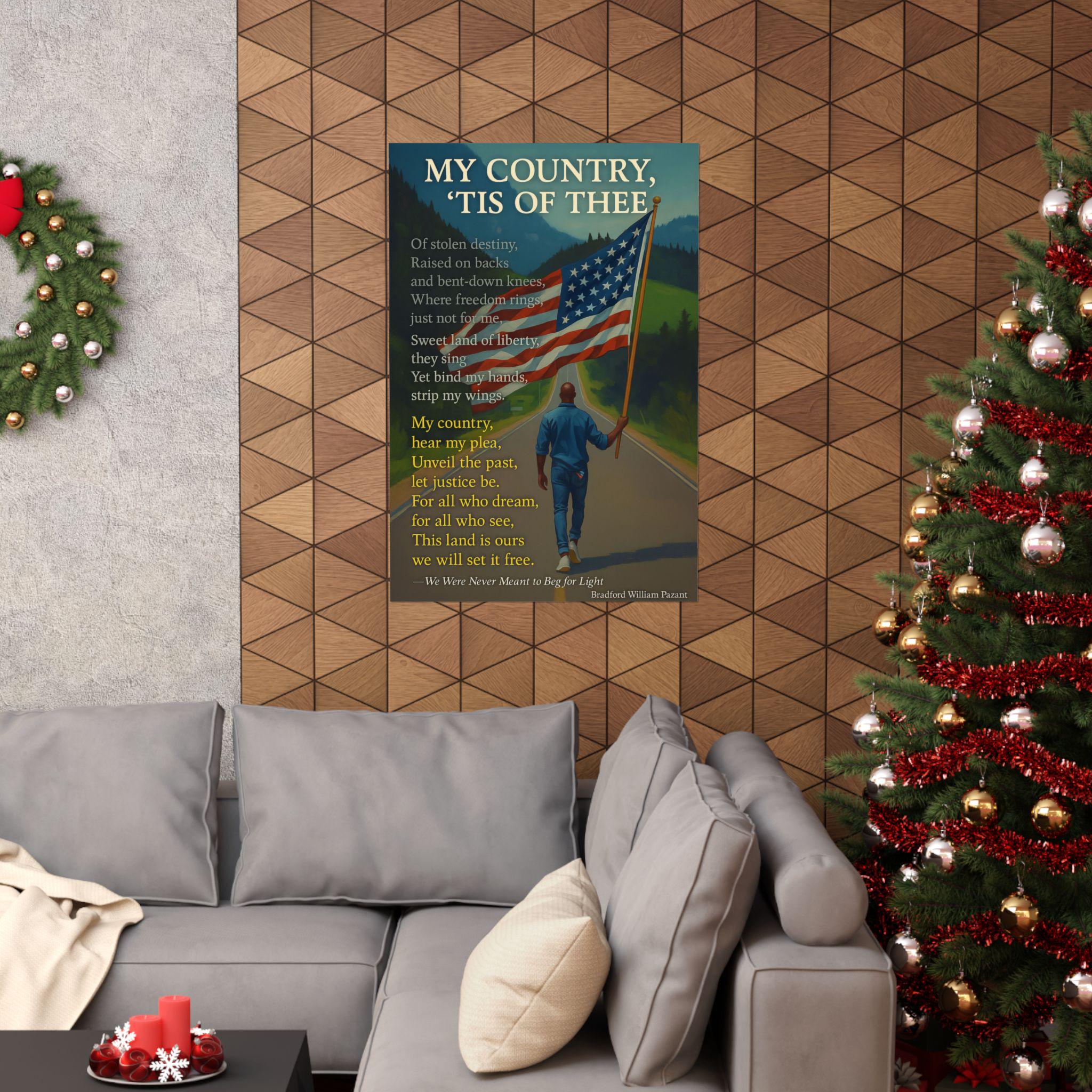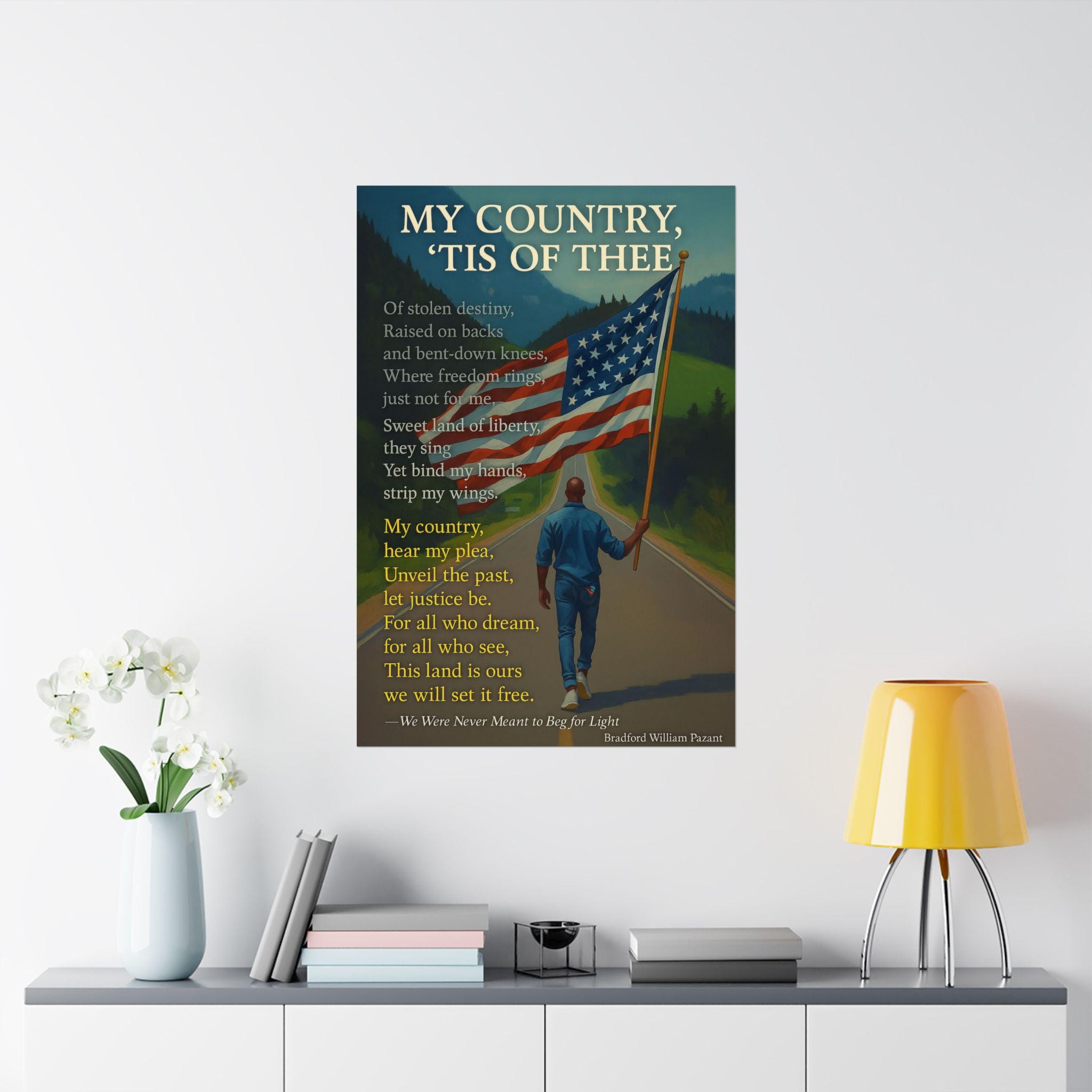 This powerful poster features a lone Black man walking boldly down an open road, carrying an oversized American flag on his shoulder. The backdrop of rolling green hills and distant mountains contrasts with the weight of the imagery, symbolizing both burden and resilience. Across the flag, verses from We Were Never Meant to Beg for Light are overlaid, reframing the patriotic hymn “My Country, ’Tis of Thee” into a plea for justice, truth, and freedom. The text shifts from somber tones in gray to urgent, impassioned lines in bright yellow, emphasizing the demand for liberation and collective justice. At the bottom, the author’s name, Bradford William Pazant, anchors the piece, asserting authorship and legacy.