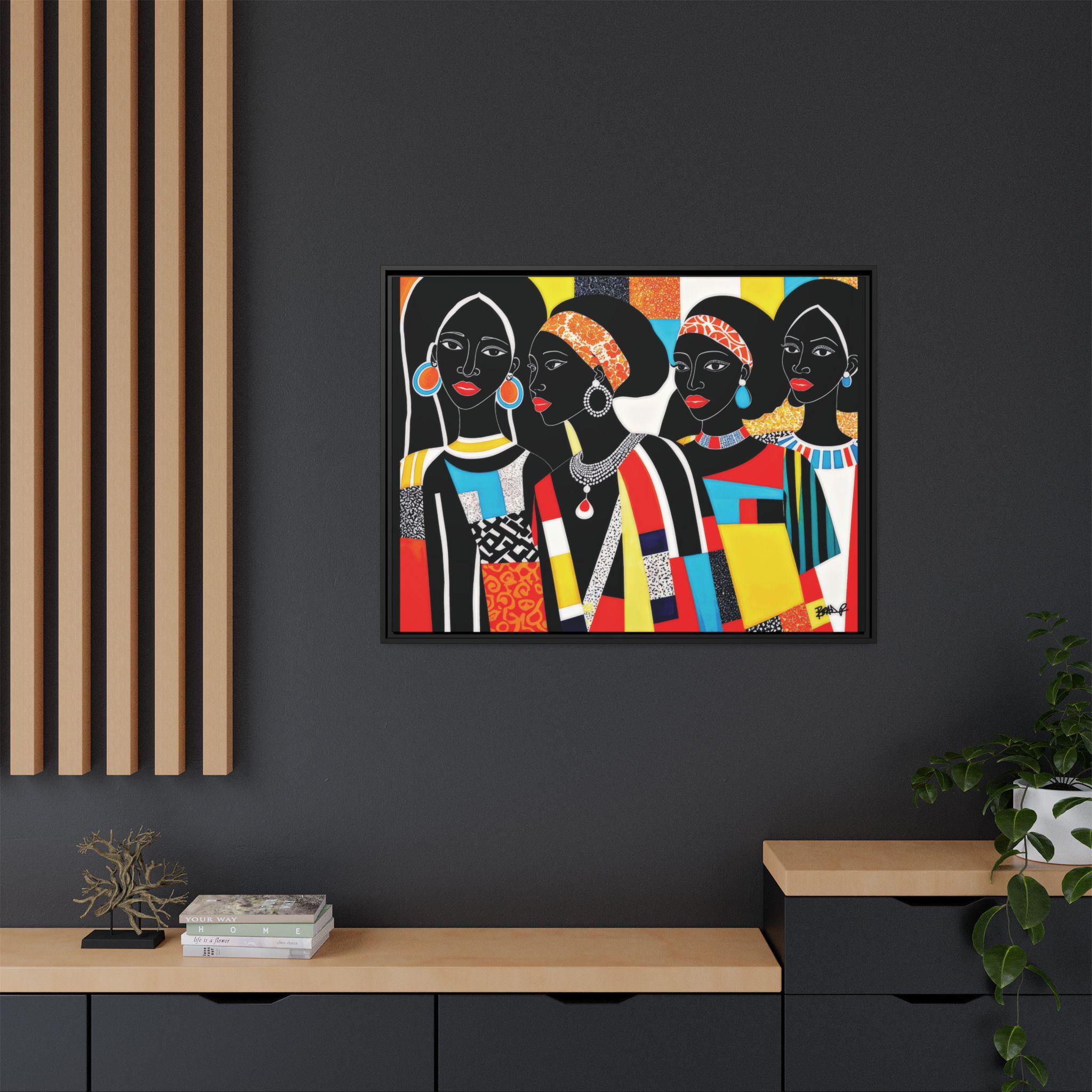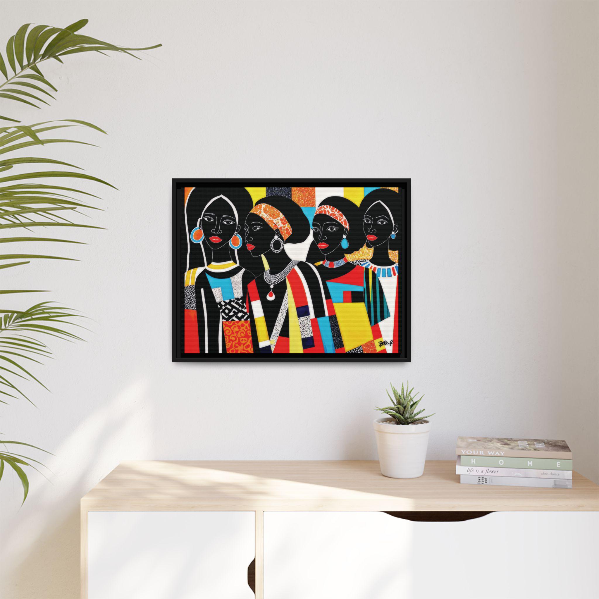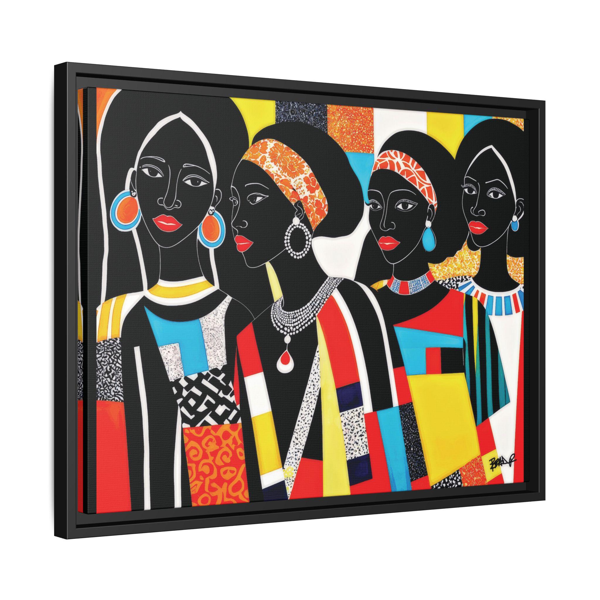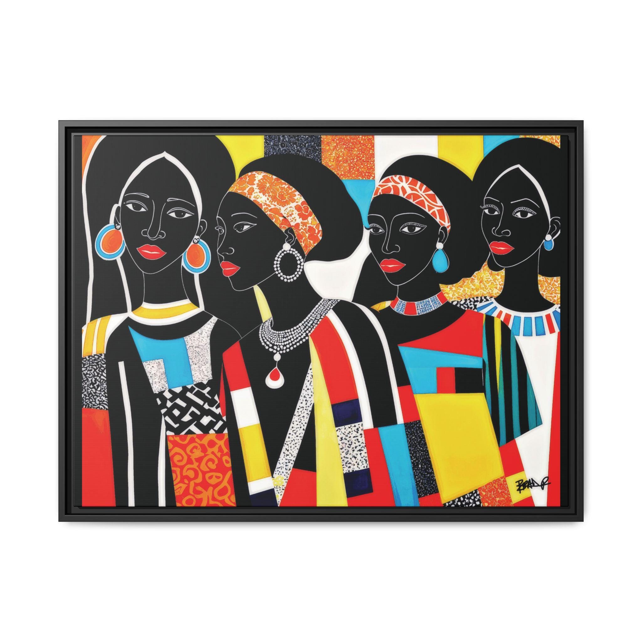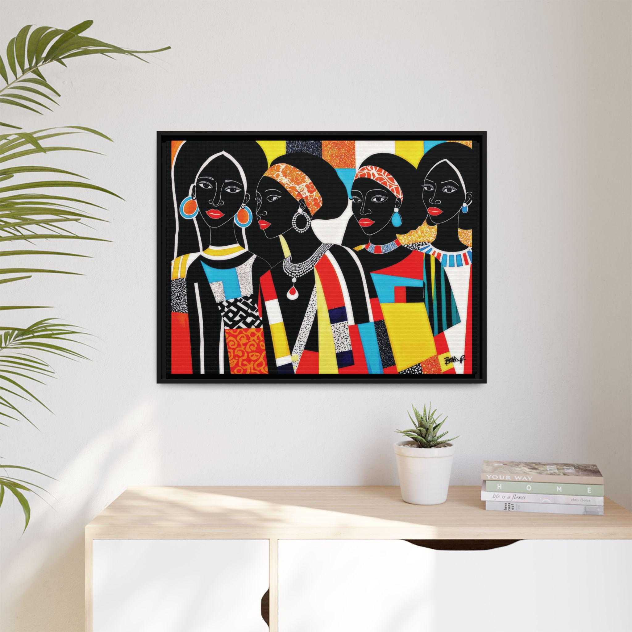 "Ladies Who Lunch" reimagines elegance through the lens of modern Black abstraction. Four women stand together, their gazes self-assured and serene, adorned in bold patterns that echo African textiles and contemporary design. Their jet-black silhouettes are contrasted with vibrant planes of orange, teal, gold, and cream, creating a harmony between fashion and geometry. At once regal and approachable, the figures embody collective strength, sophistication, and sisterhood. This work transforms the everyday act of gathering into a visual statement of style, identity, and cultural continuity.