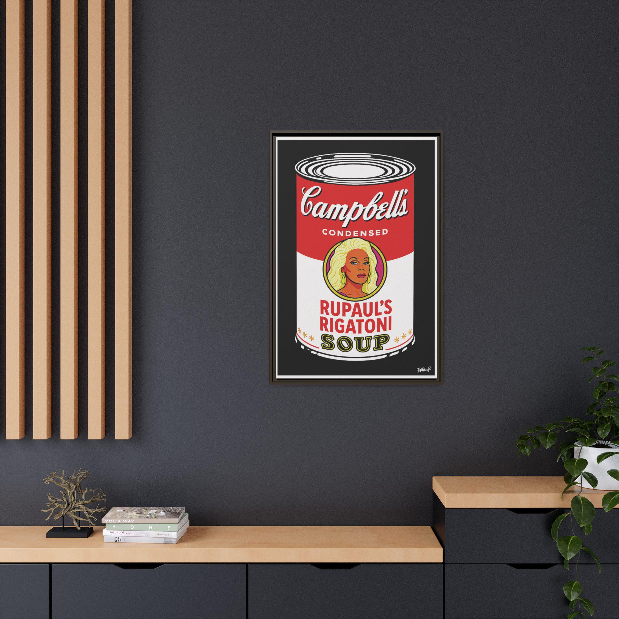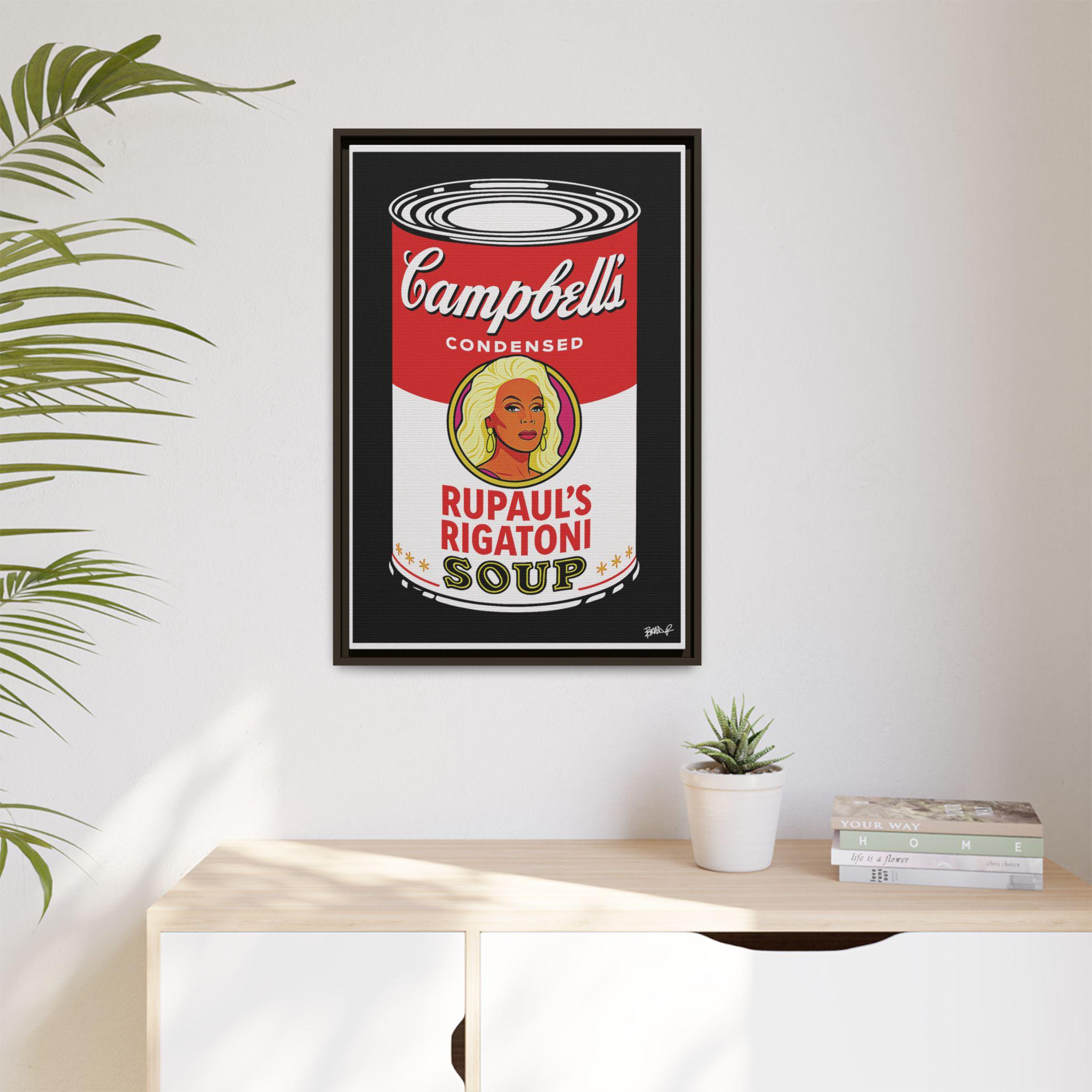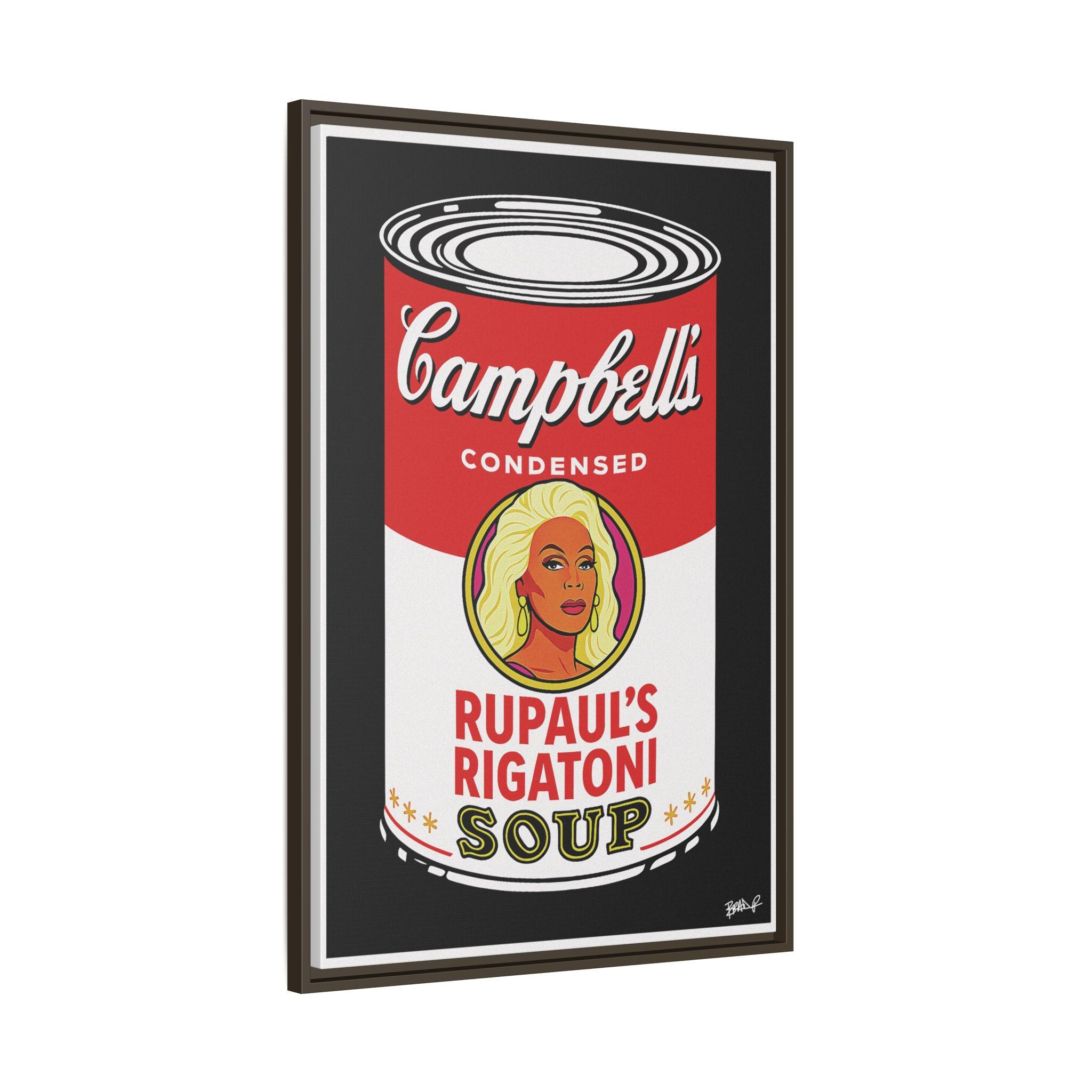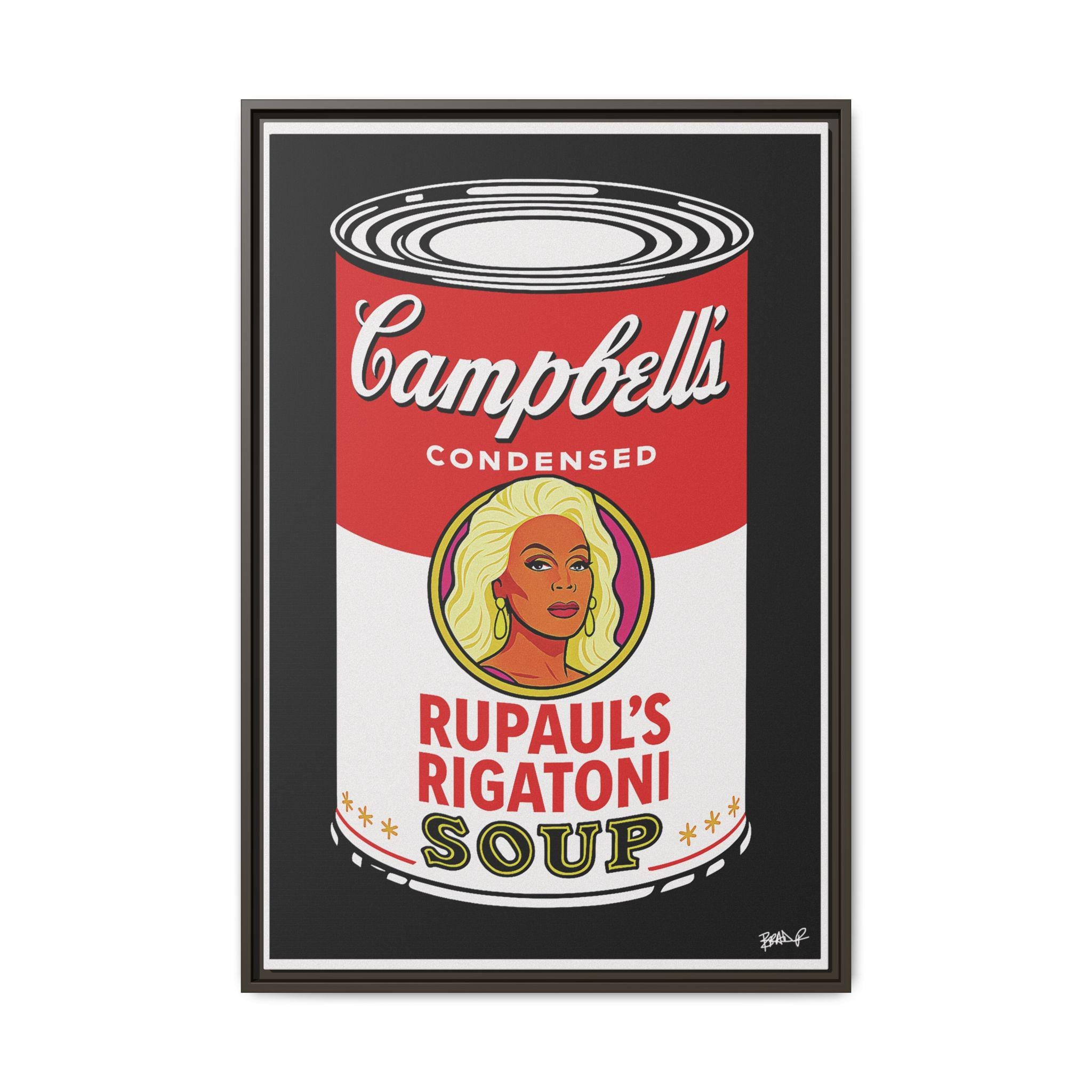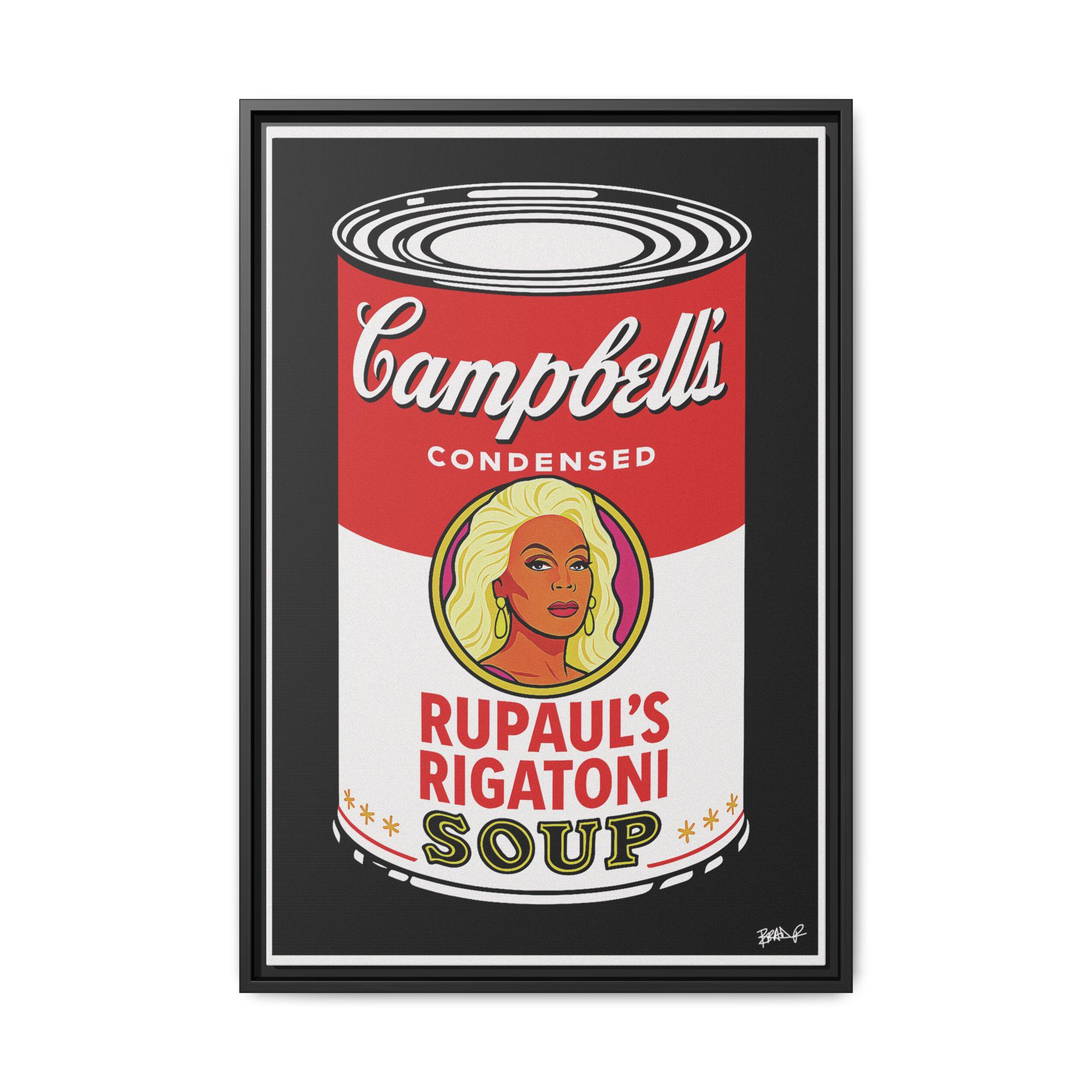 A bold, Pop Art twist on the Campbell's soup label, featuring RuPaul in glamorous illustrated style. Her portrait, framed in a bright circle, radiates charisma, uniqueness, nerve, and talent. The playful renaming — "Rigatoni Soup" — turns drag performance into nourishment for culture itself. Clean lines, flat color, and a slick aesthetic nod to Warhol, but the subject matter proudly claims space for queer icons in the Pop canon.