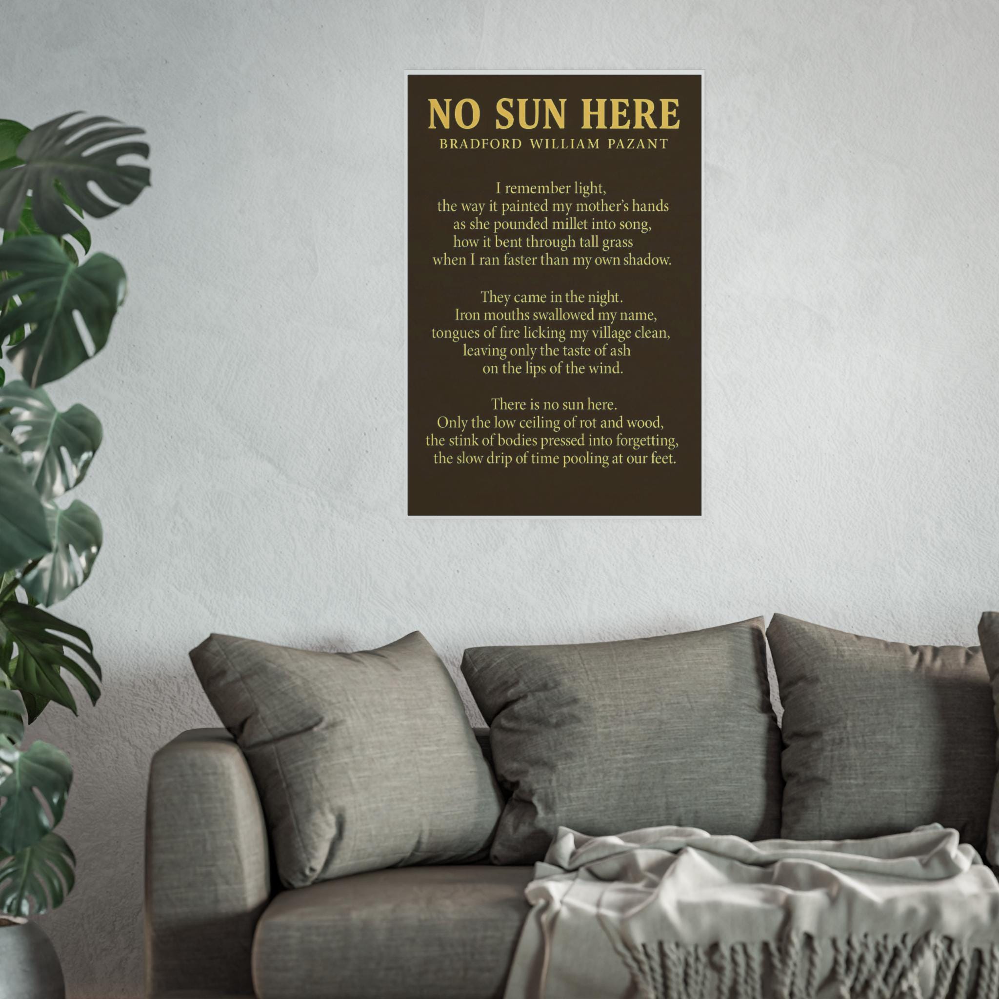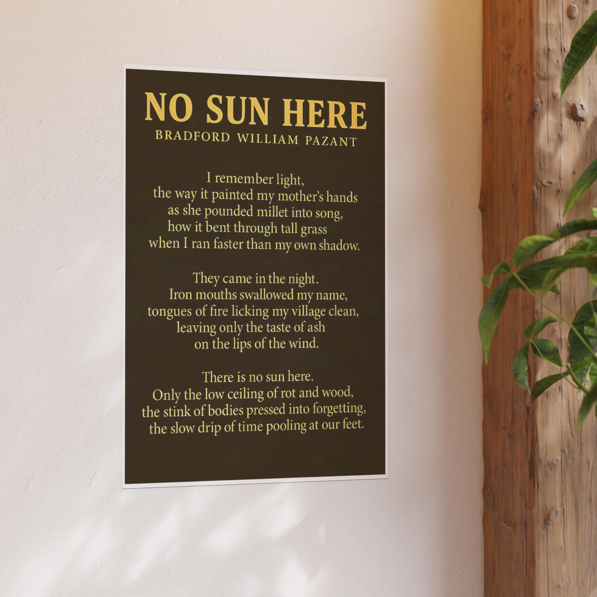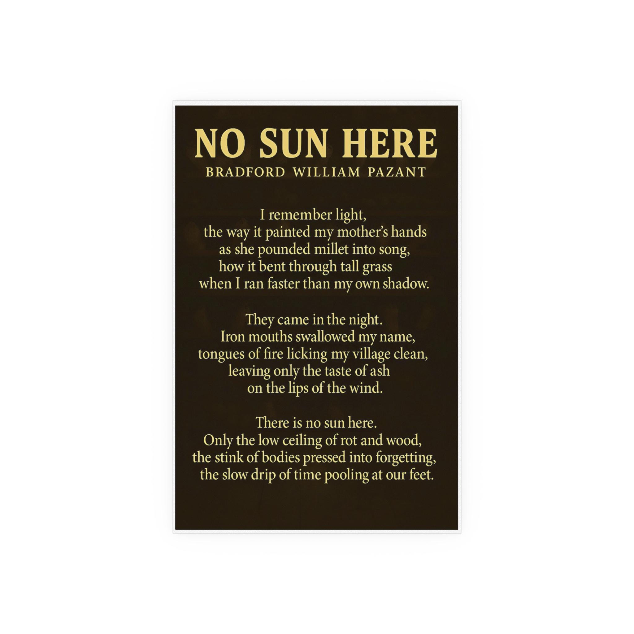 Drawn from We Were Never Meant to Beg for Light, this work embodies the terror of the Middle Passage. The poem recalls light and home only to plunge the reader into darkness: a hold without air, where bodies are reduced to weight and tally marks. The imagery of suffocation and oceanic silence is etched into the design, confronting erasure with witness. There is no sun here—only memory, loss, and the refusal to let forgetting win.