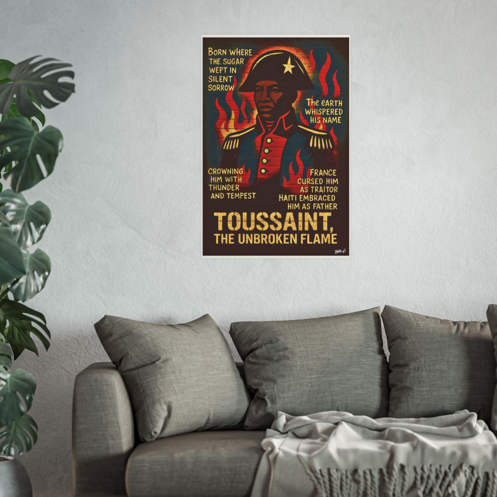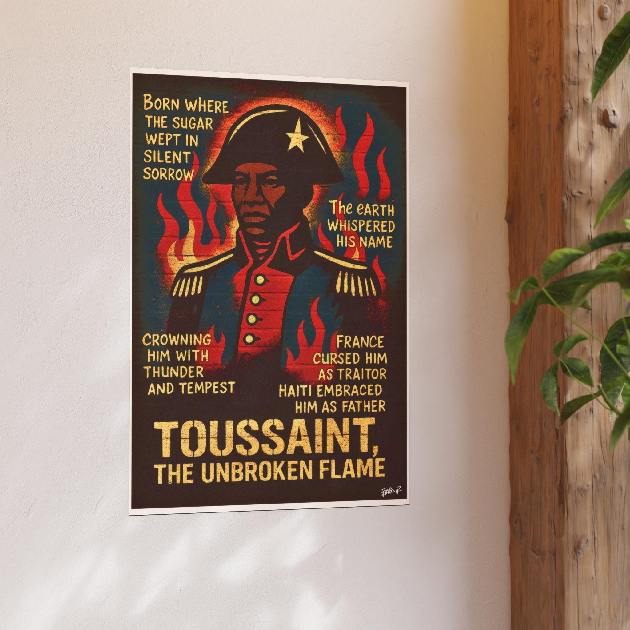 This mural-style poster features “Toussaint, The Unbroken Flame” — a poem from Bradford William Pazant’s collection We Were Never Meant to Beg for Light. With bold graffiti-inspired strokes, Toussaint Louverture emerges against flames of revolution, his presence commanding and unyielding. Surrounding him are fragments of verse that echo the resilience of a people and the fire of a leader who defied empire.