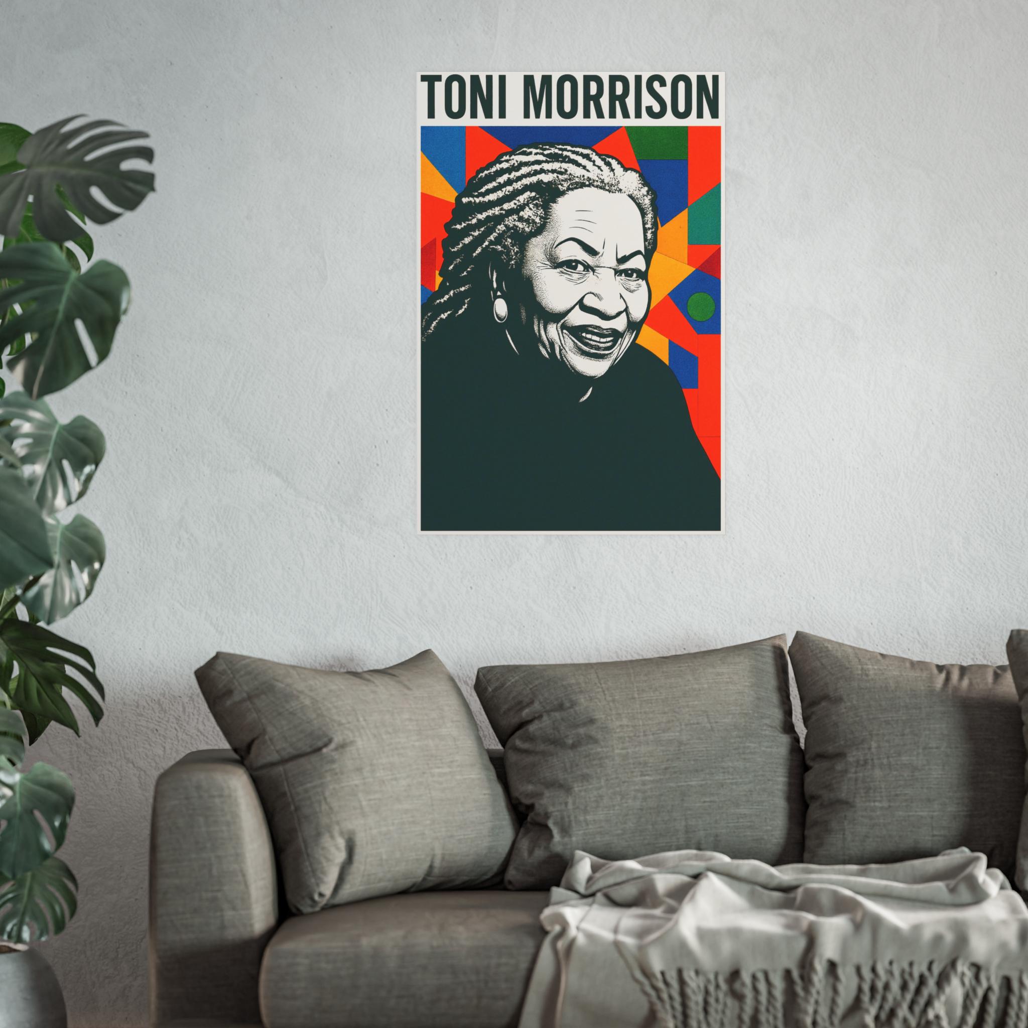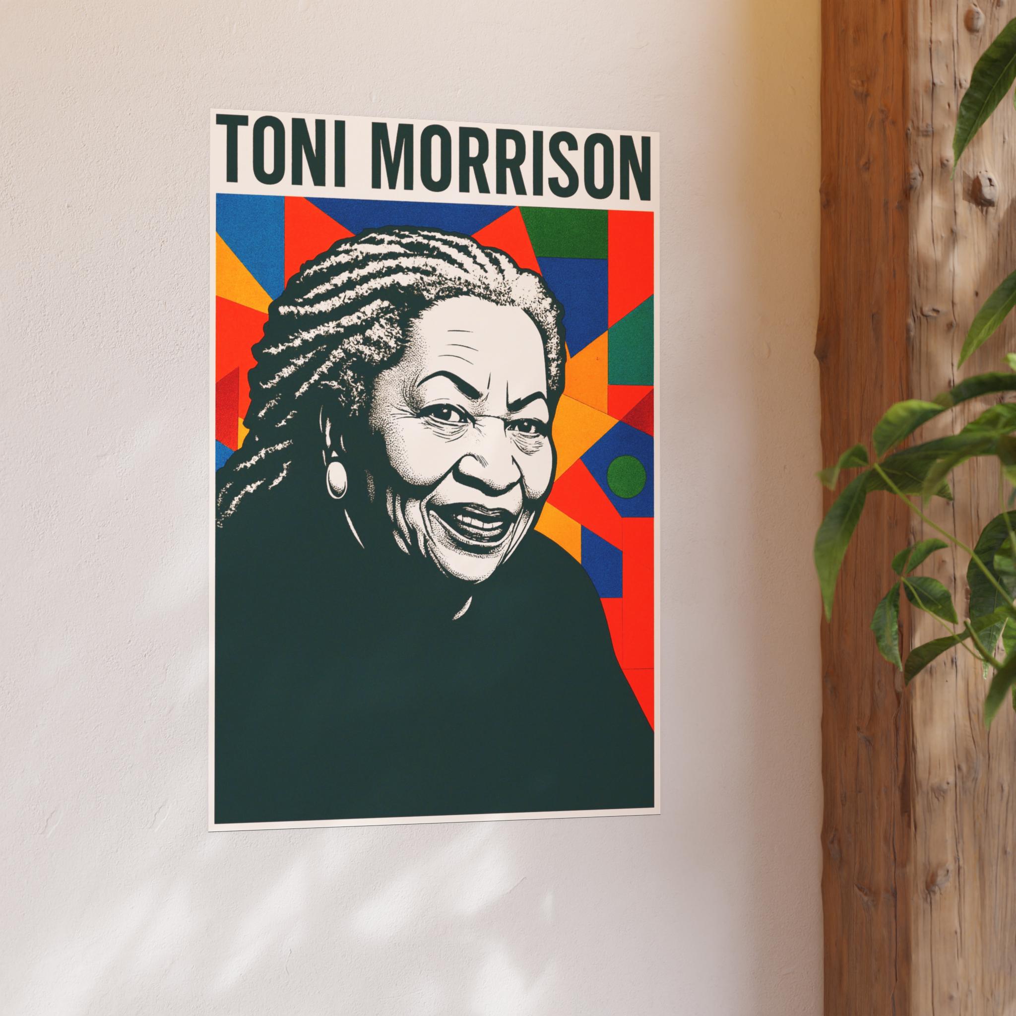 This piece radiates warmth and intellect, portraying Toni Morrison with a knowing smile framed by intricate, geometric color planes. The vivid background feels like shards of stained glass — symbolic of how Morrison refracted Black life into literature of mythic beauty and truth. The heavy black of her clothing grounds the composition, anchoring her amid a chorus of color that mirrors the layered worlds she created. The portrait is both reverent and celebratory — an ode to the visionary who wrote us into being.