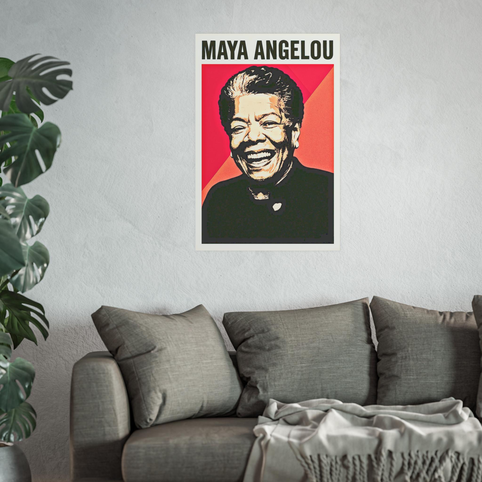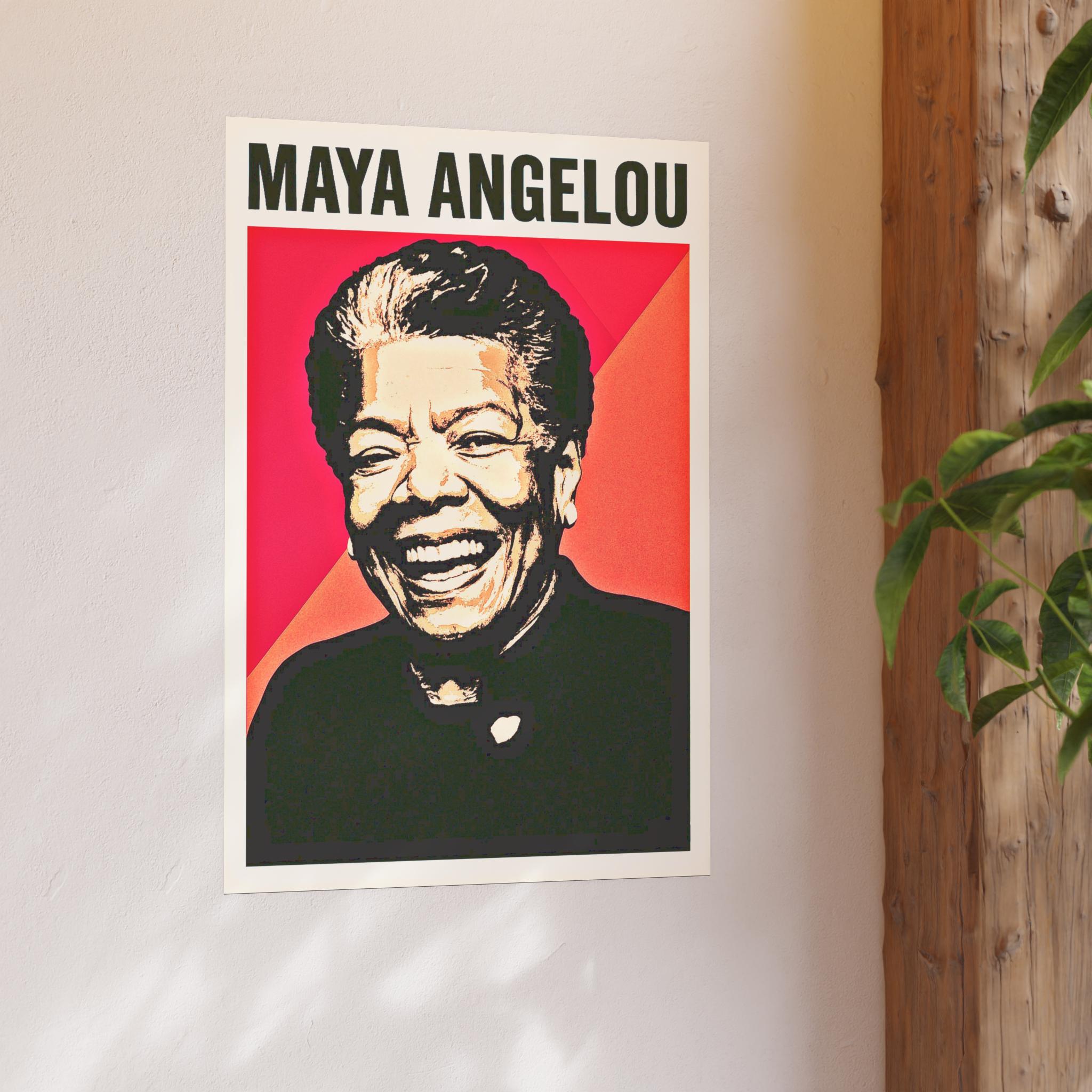 This radiant portrait of Maya Angelou captures the poet’s unmistakable joy and strength. Against a background that moves from rose to coral, her smile becomes both light source and legacy — a visual metaphor for the brilliance of her words. The minimalist palette amplifies the emotional force of her expression, while the bold contrast of black and blush tones evokes both resilience and grace. The composition feels alive, echoing her own conviction that “still, I rise.” It celebrates not only Angelou’s artistry, but her power to turn pain into poetry and survival into song.