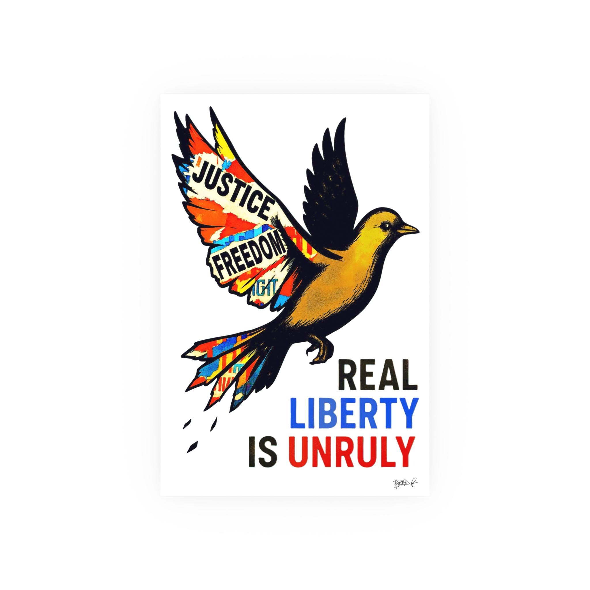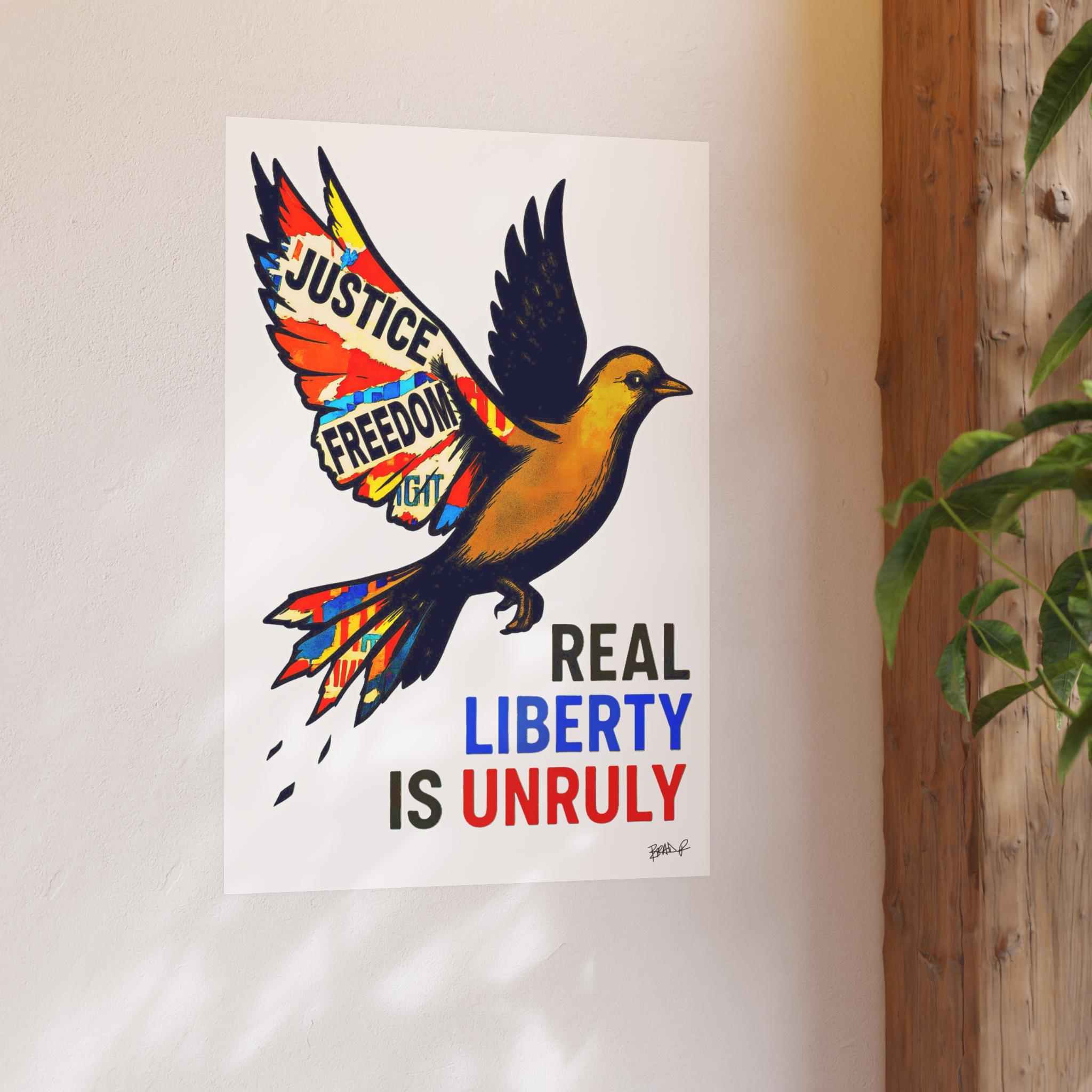 This original artwork reimagines liberty as something alive — a bird mid-flight, its wings patched together from torn protest posters. Each fragment of red, blue, and yellow carries echoes of past movements and unfinished struggles. “Justice” and “Freedom” rise together in motion, symbolizing that true liberty can never be domesticated or contained.