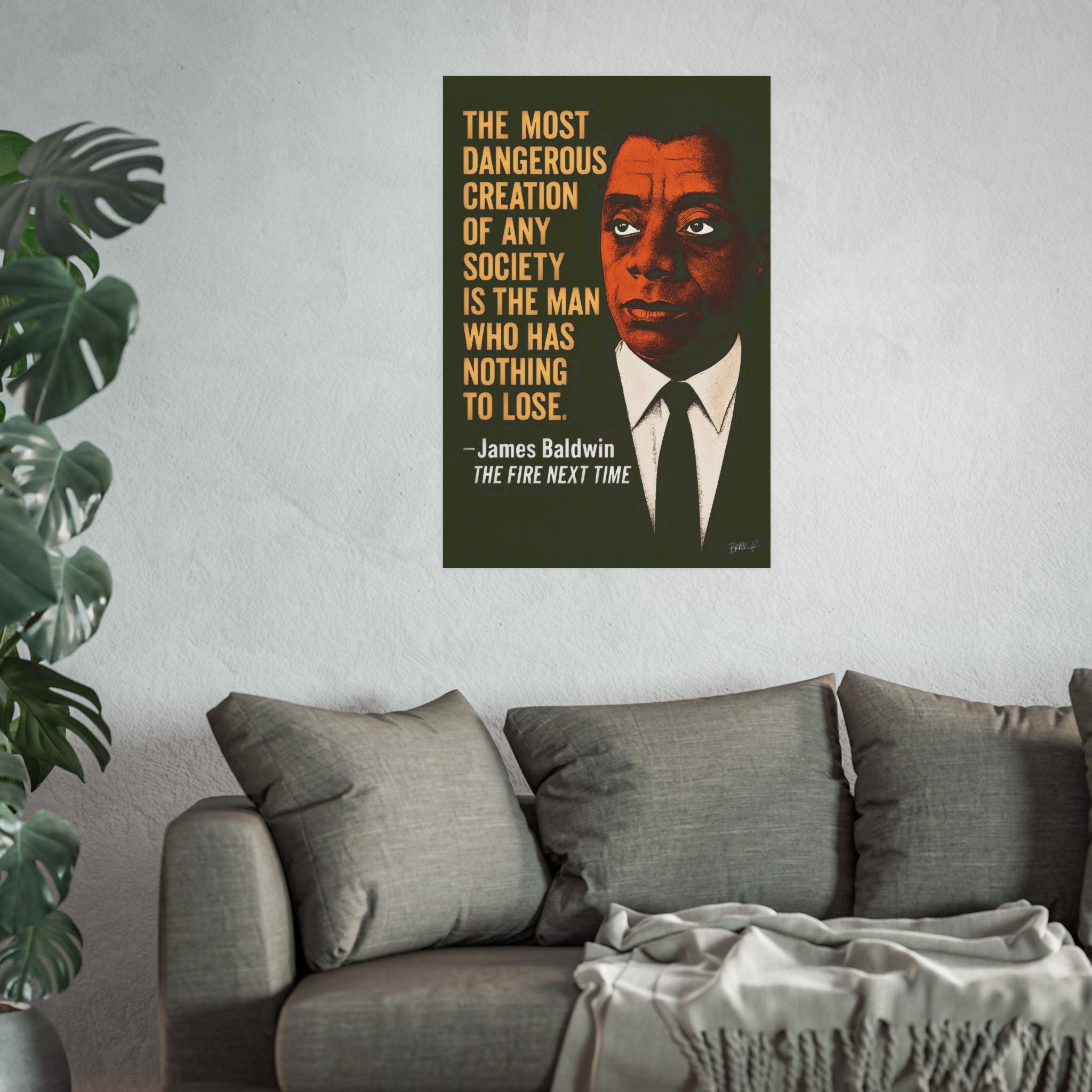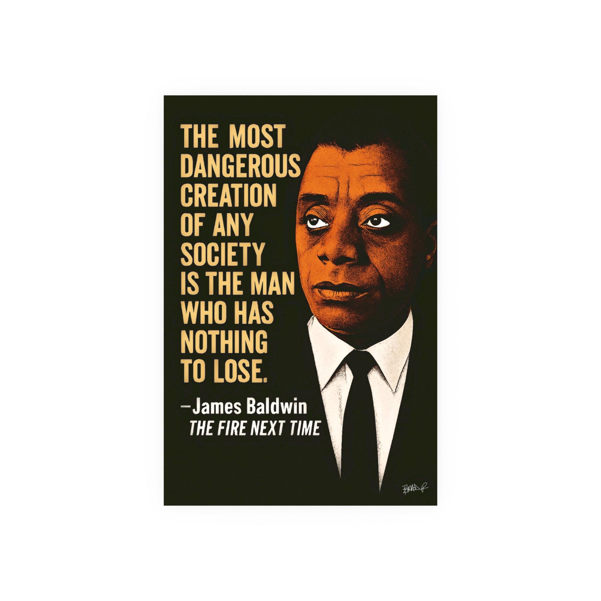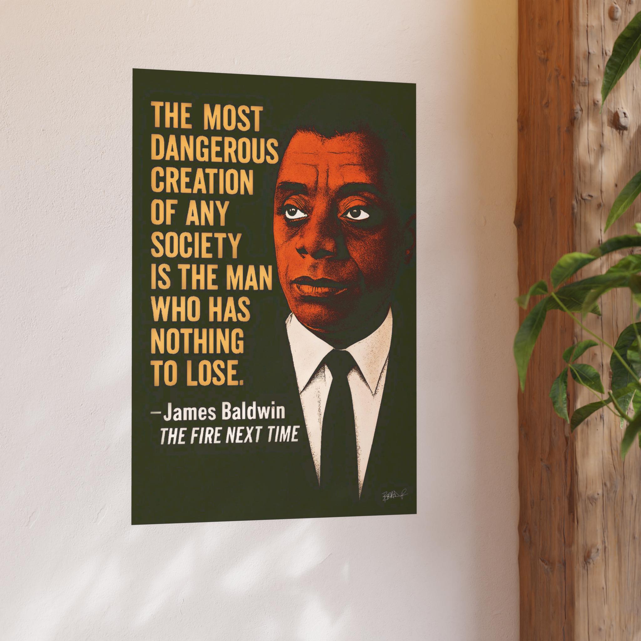 A striking stencil-style portrait of James Baldwin, layered in rich tones of brown, cream, and shadow against a deep black backdrop. The iconic quote — “The most dangerous creation of any society is the man who has nothing to lose” — burns quietly with Baldwin’s timeless urgency.