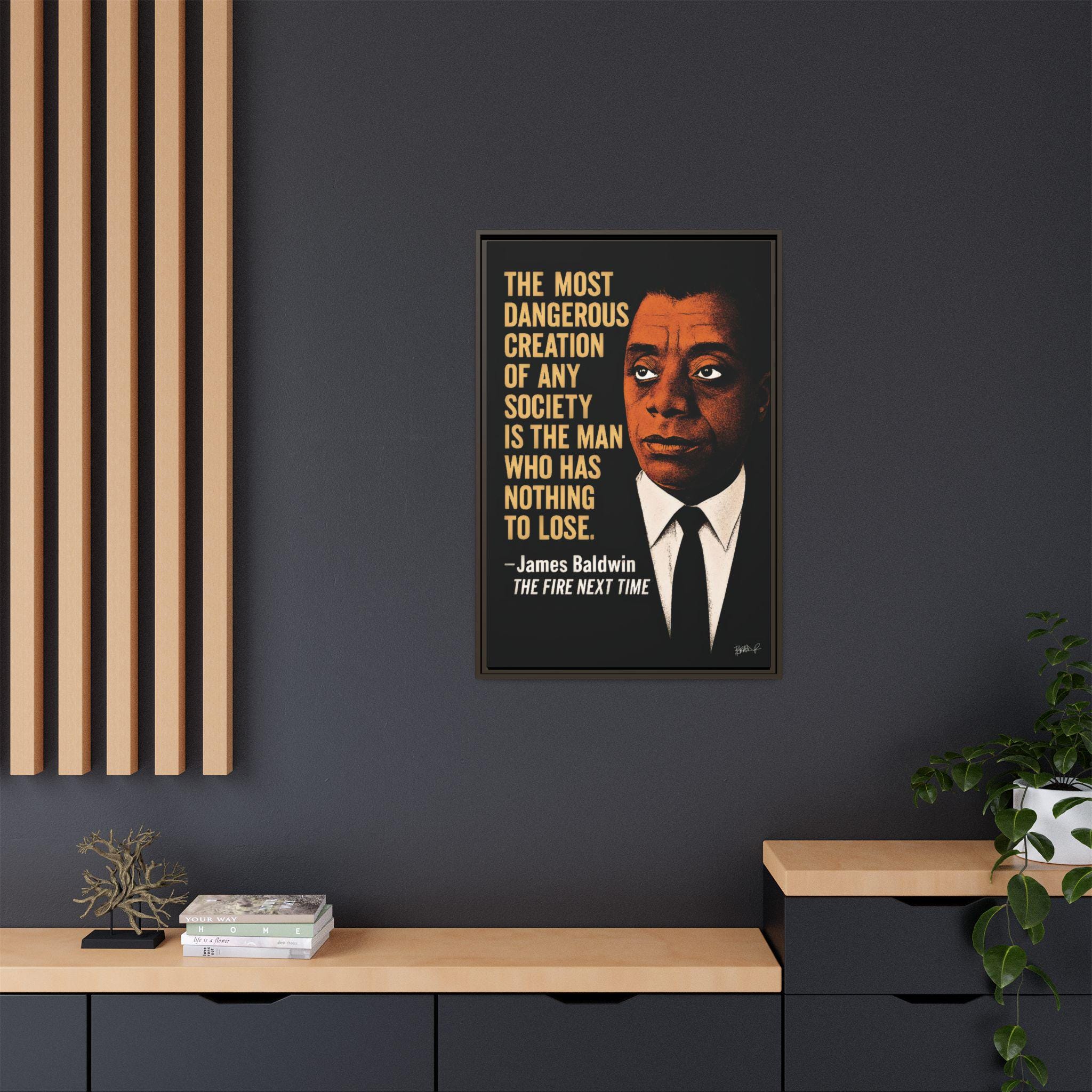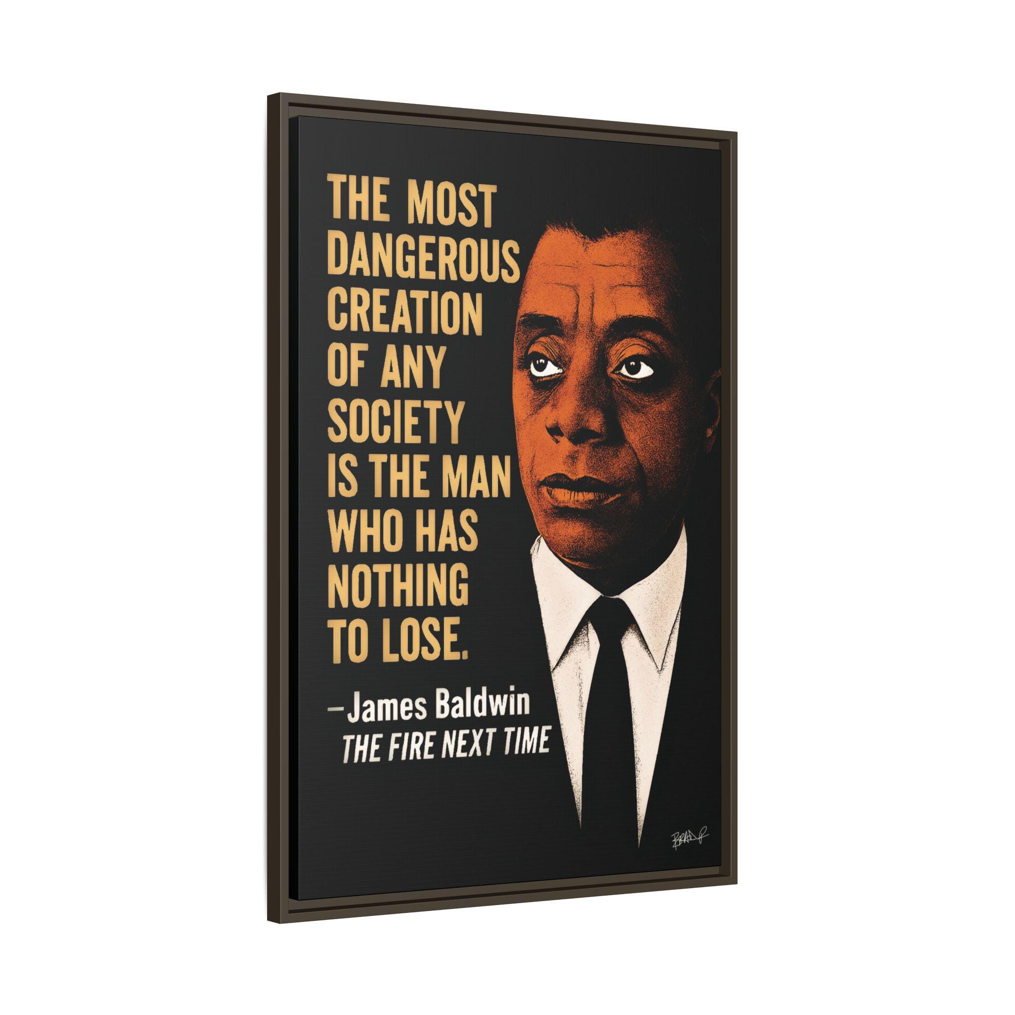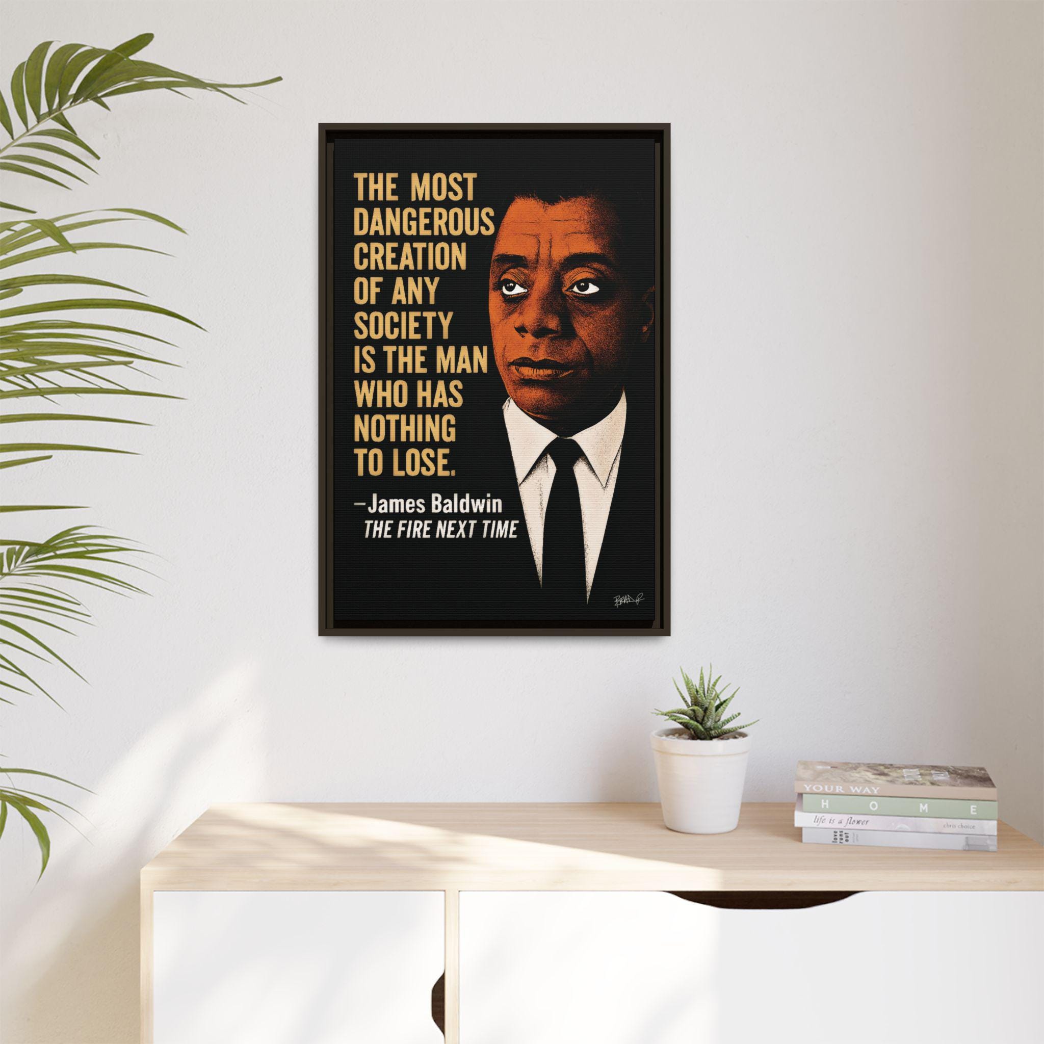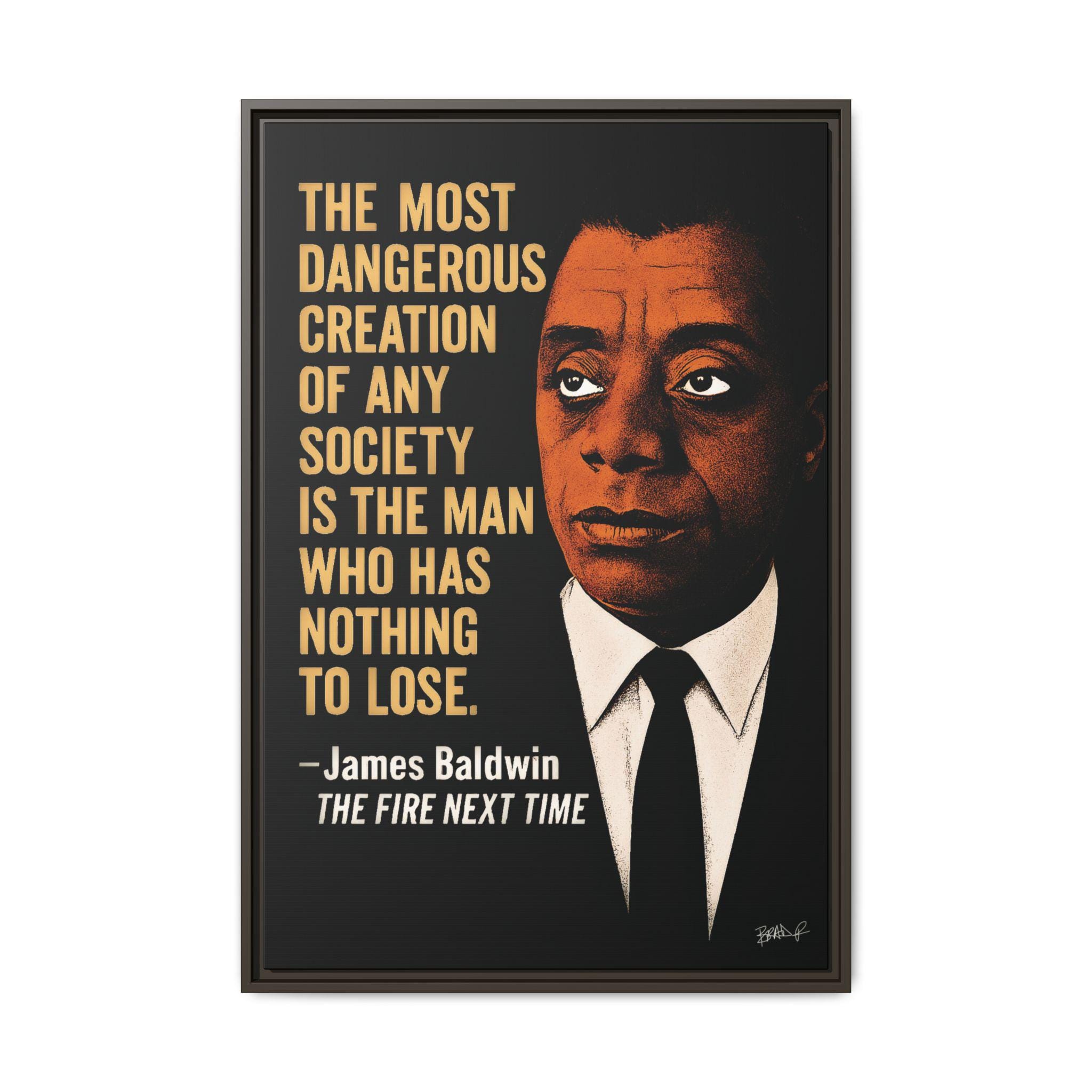 A striking stencil-style portrait of James Baldwin, layered in rich tones of brown, cream, and shadow against a deep black backdrop. The iconic quote — “The most dangerous creation of any society is the man who has nothing to lose” — burns quietly with Baldwin’s timeless urgency.