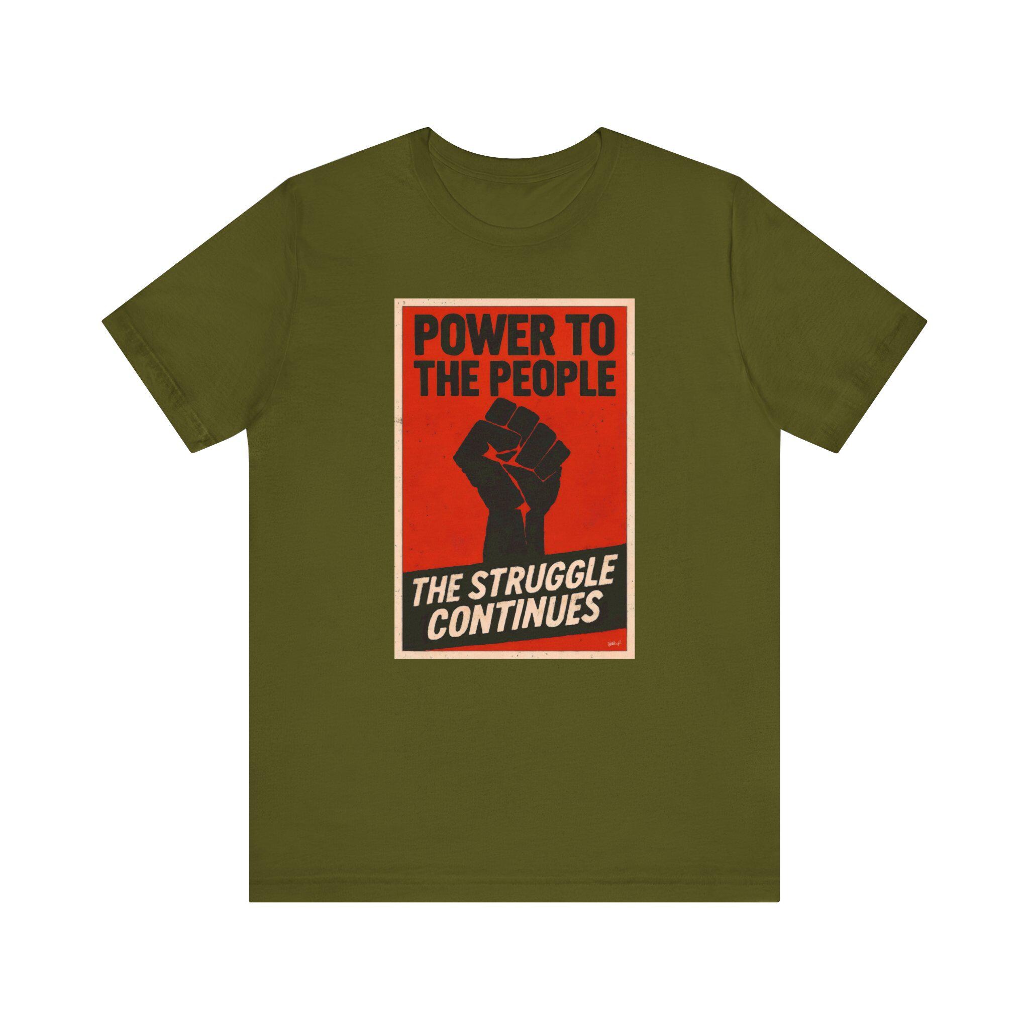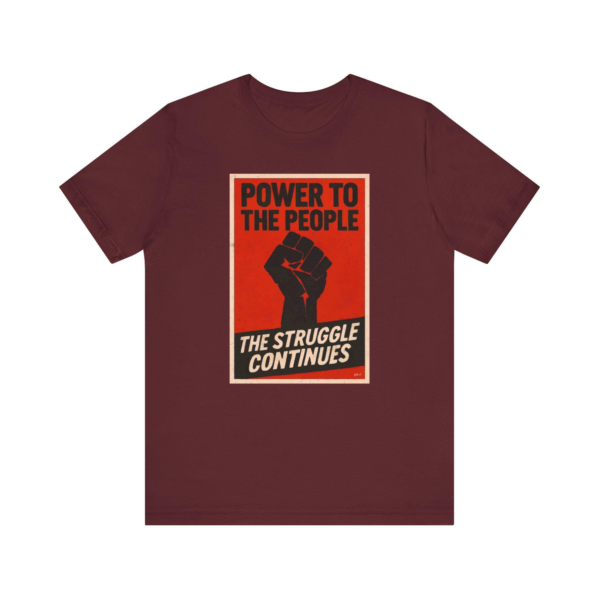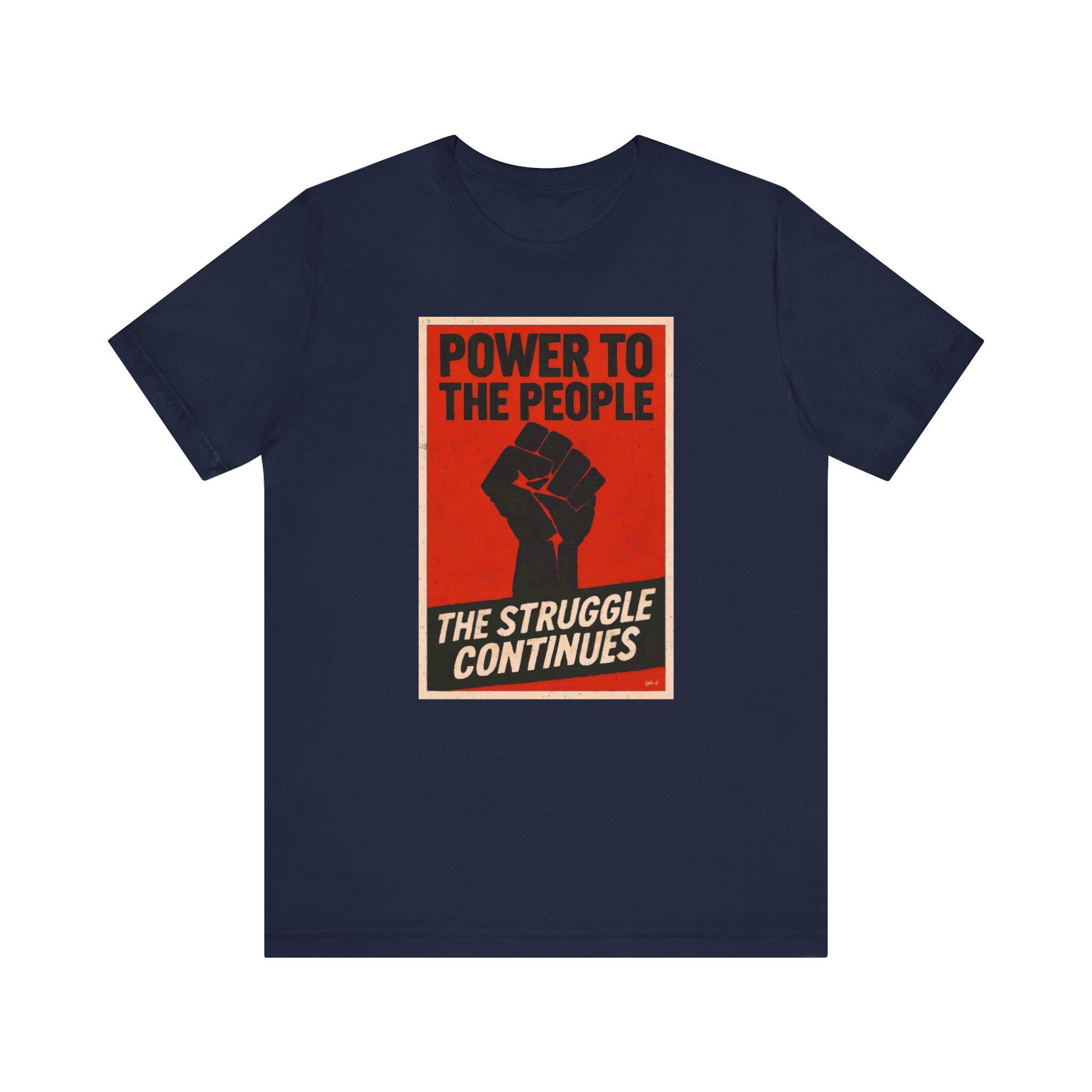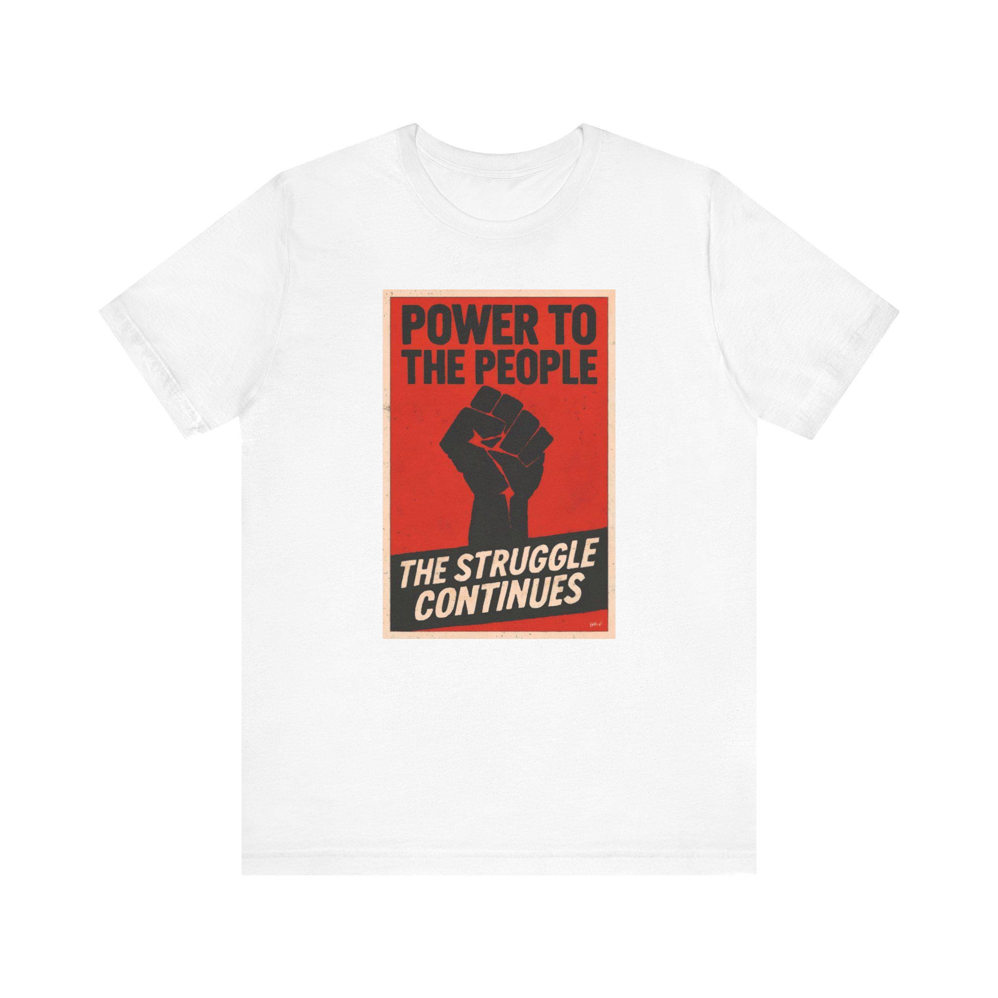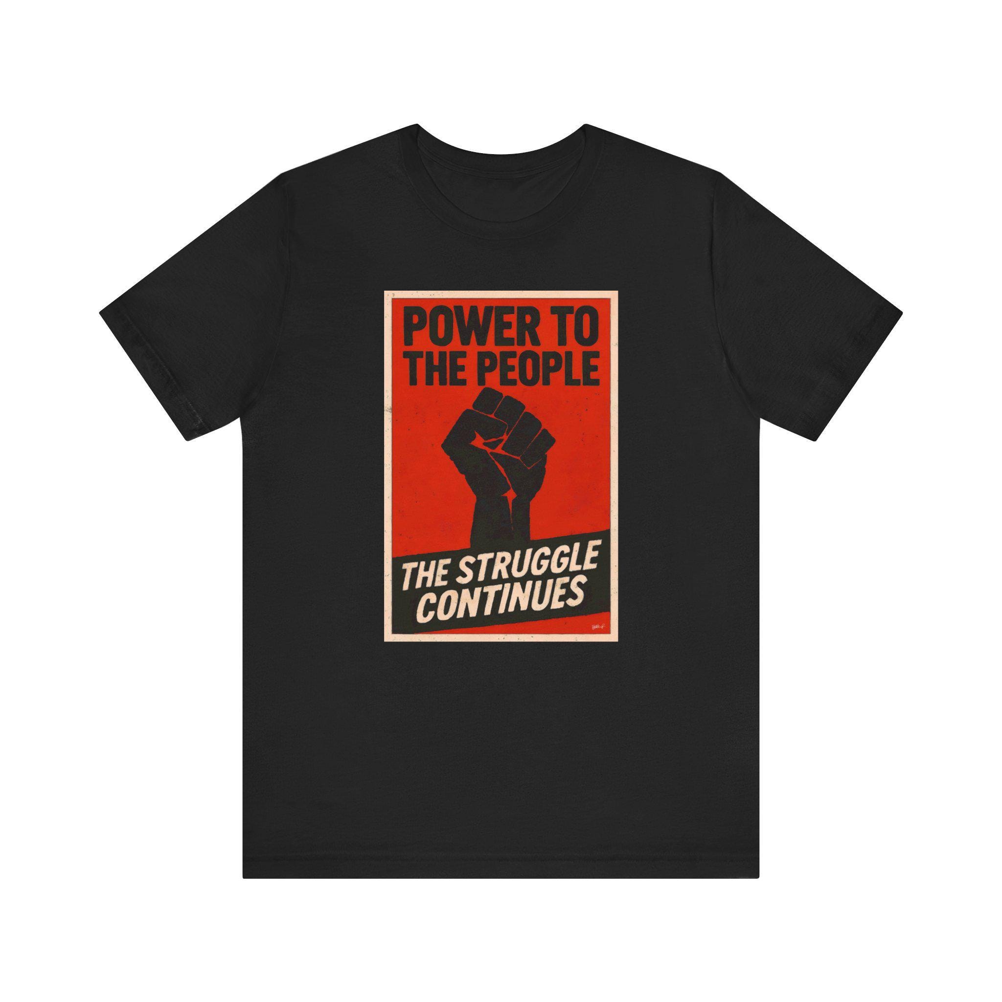 eaturing a raised fist in stark silhouette, this design distills protest to its purest symbol: unity through struggle. The phrase “Power to the People” became an anthem of empowerment for movements from Oakland to Soweto, echoing through decades of organizing and resistance. The slanted composition of “The Struggle Continues” suggests forward motion—a revolution still in progress.