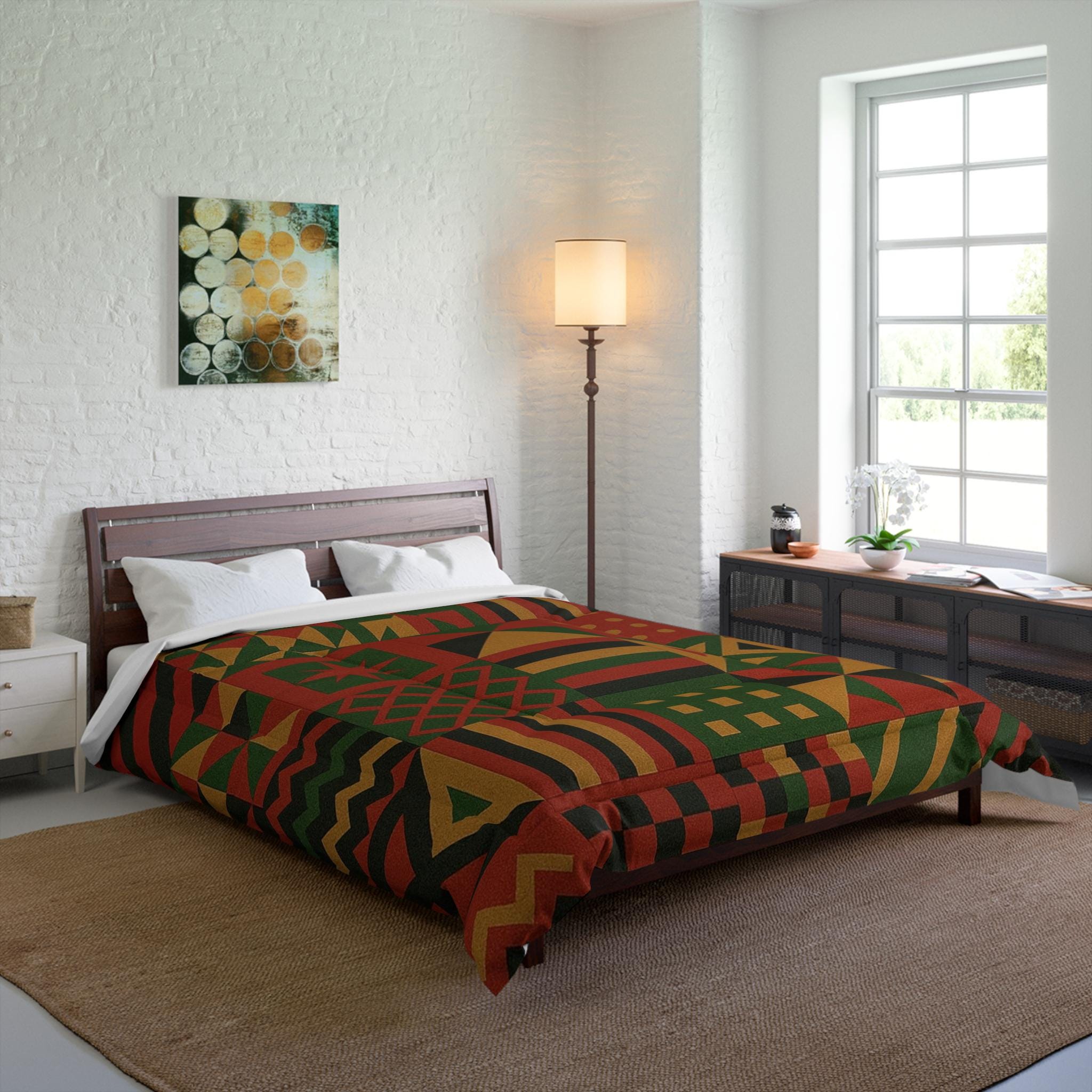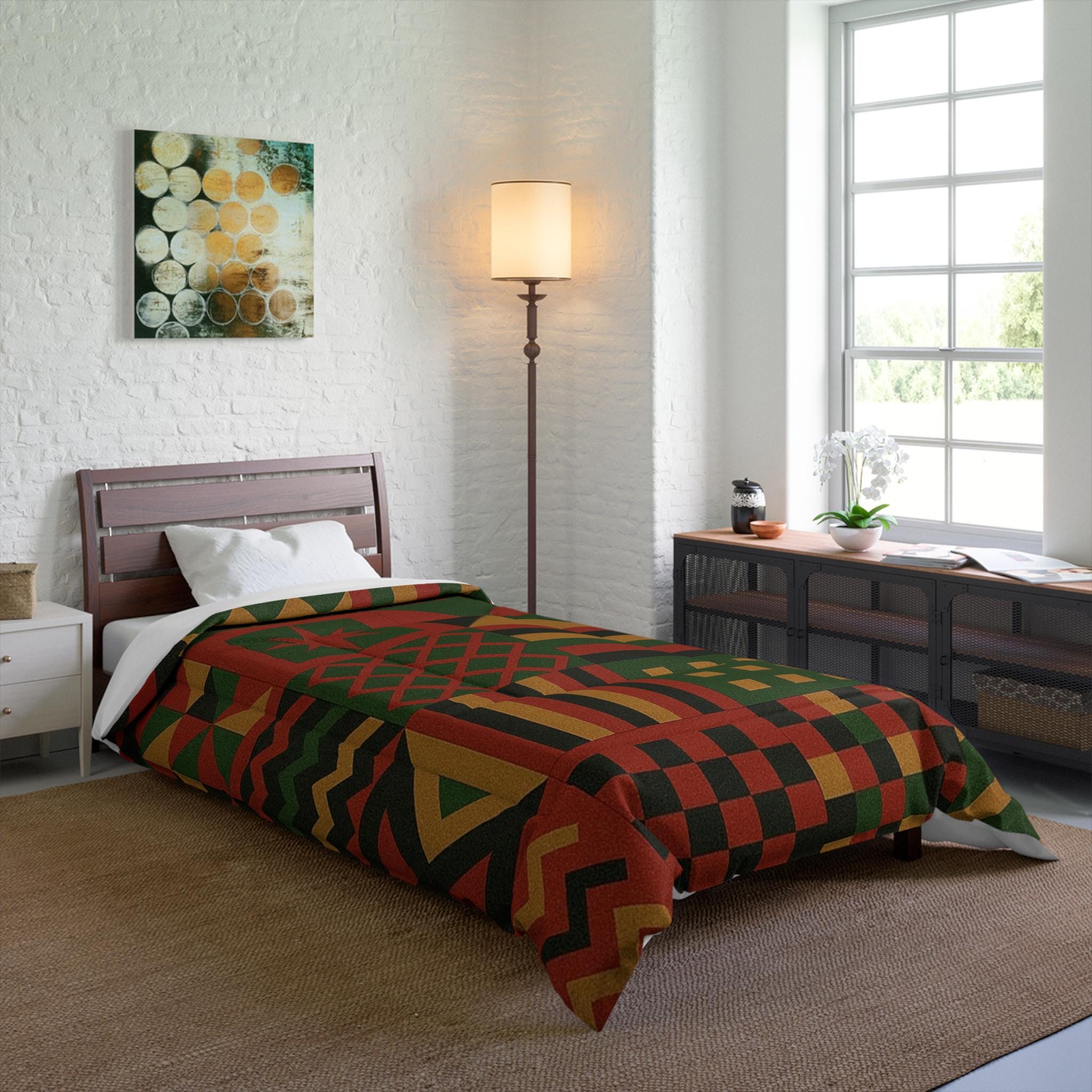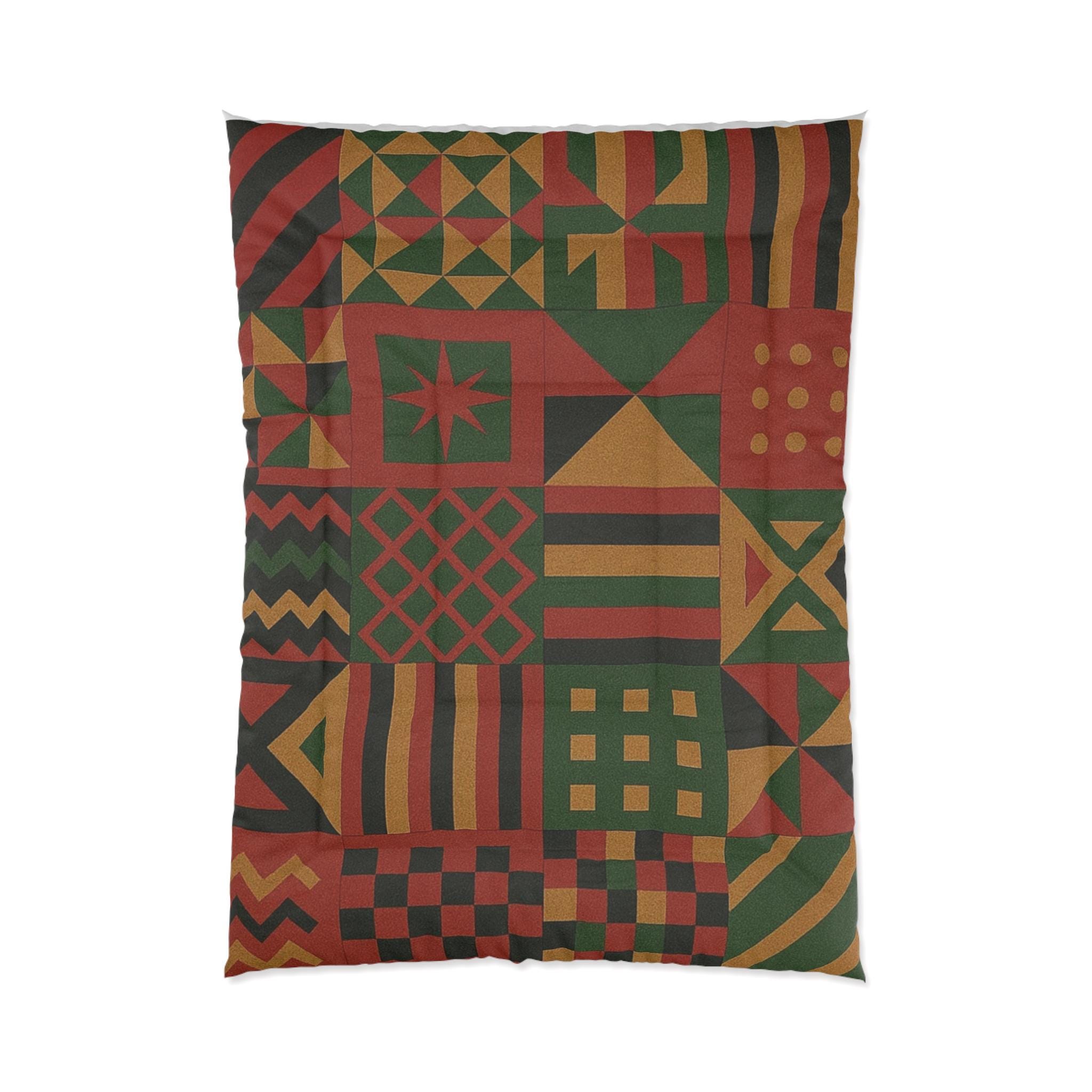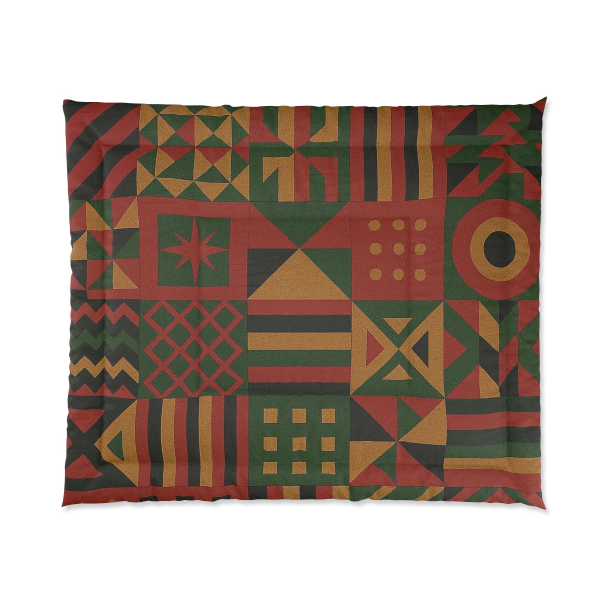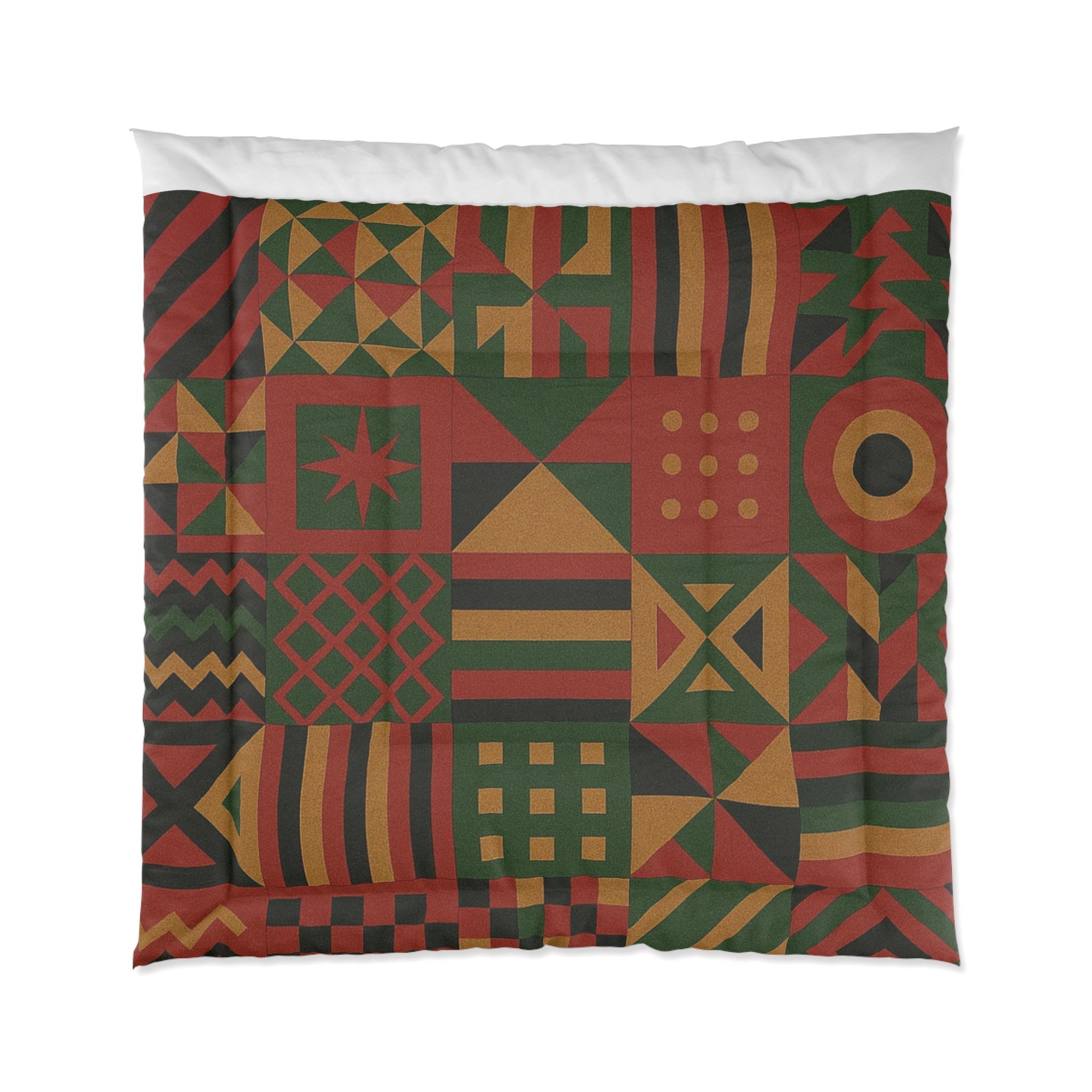 Abstracted kente-style geometric pattern infused with subtle Christmas hues — muted red, deep green, and shimmering gold.Mood: Elegant, cultural pride meets holiday luxury