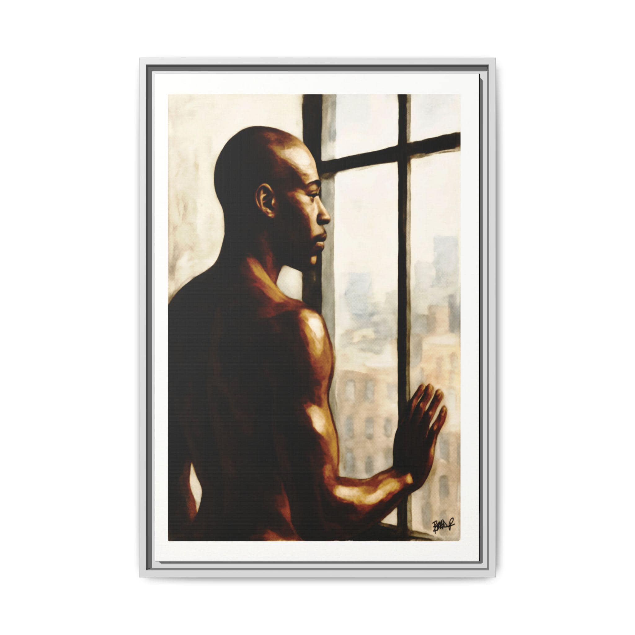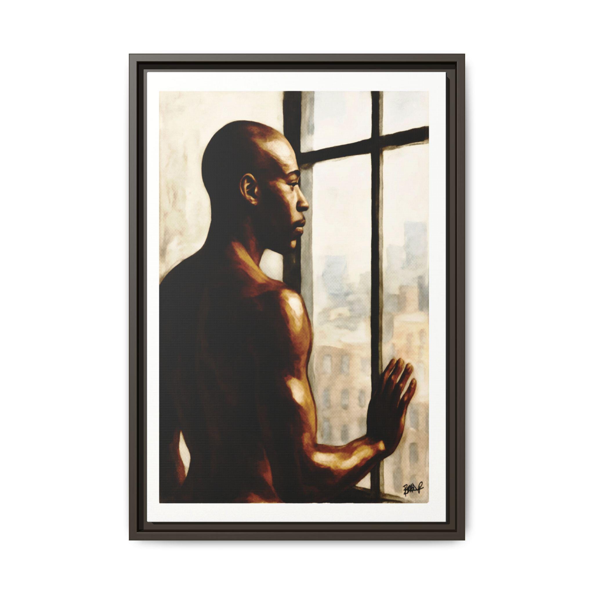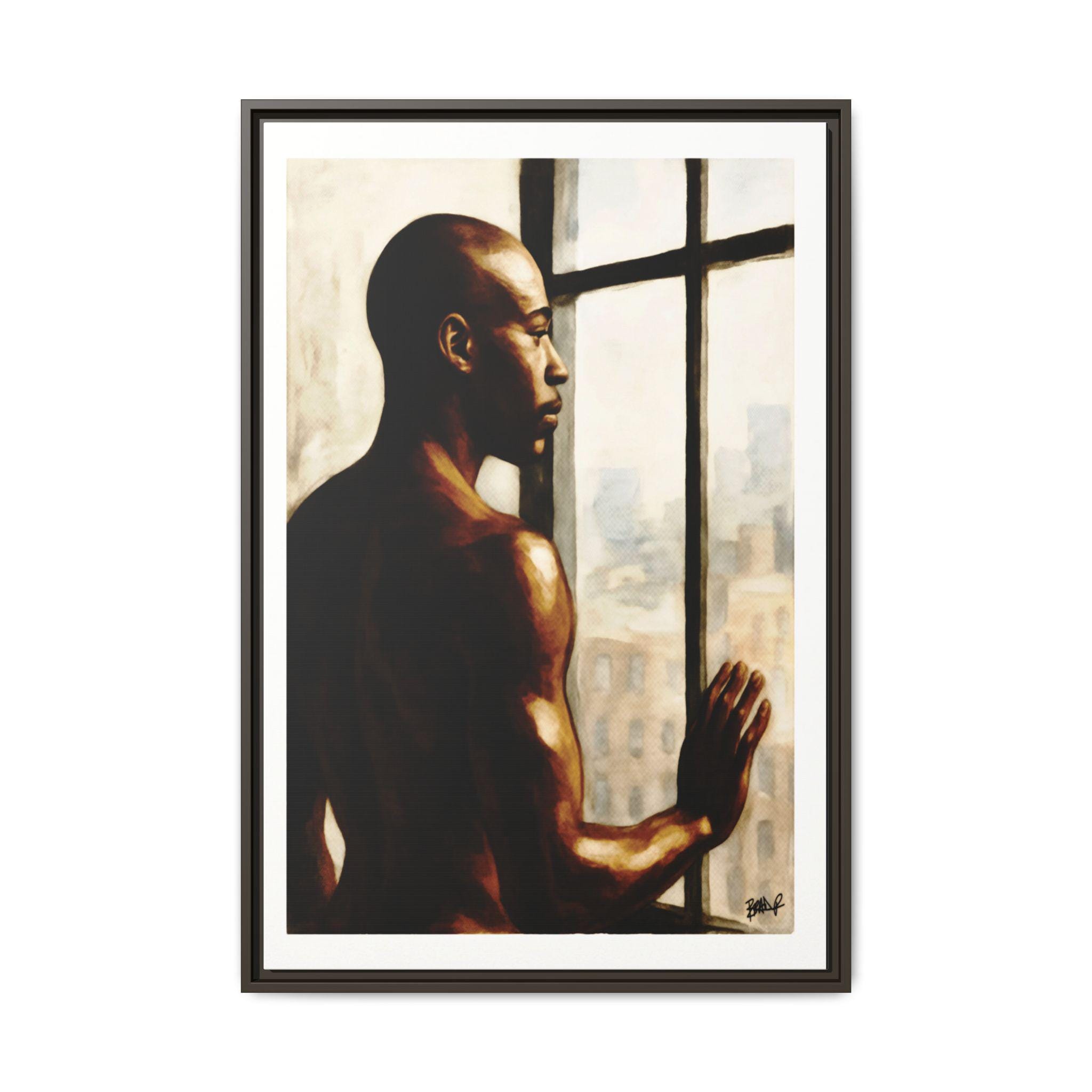A Black man stands in a high-rise window, bathed in quiet sunlight and early-day promise. His body is relaxed yet present, held between private softness and the readiness to face the world. The city blurs behind him, emphasizing the stillness of his internal moment. This is not a performance but a pause — a breath before movement, a claiming of self before stepping outward. Strength here is meditative, reflective, and deeply human.