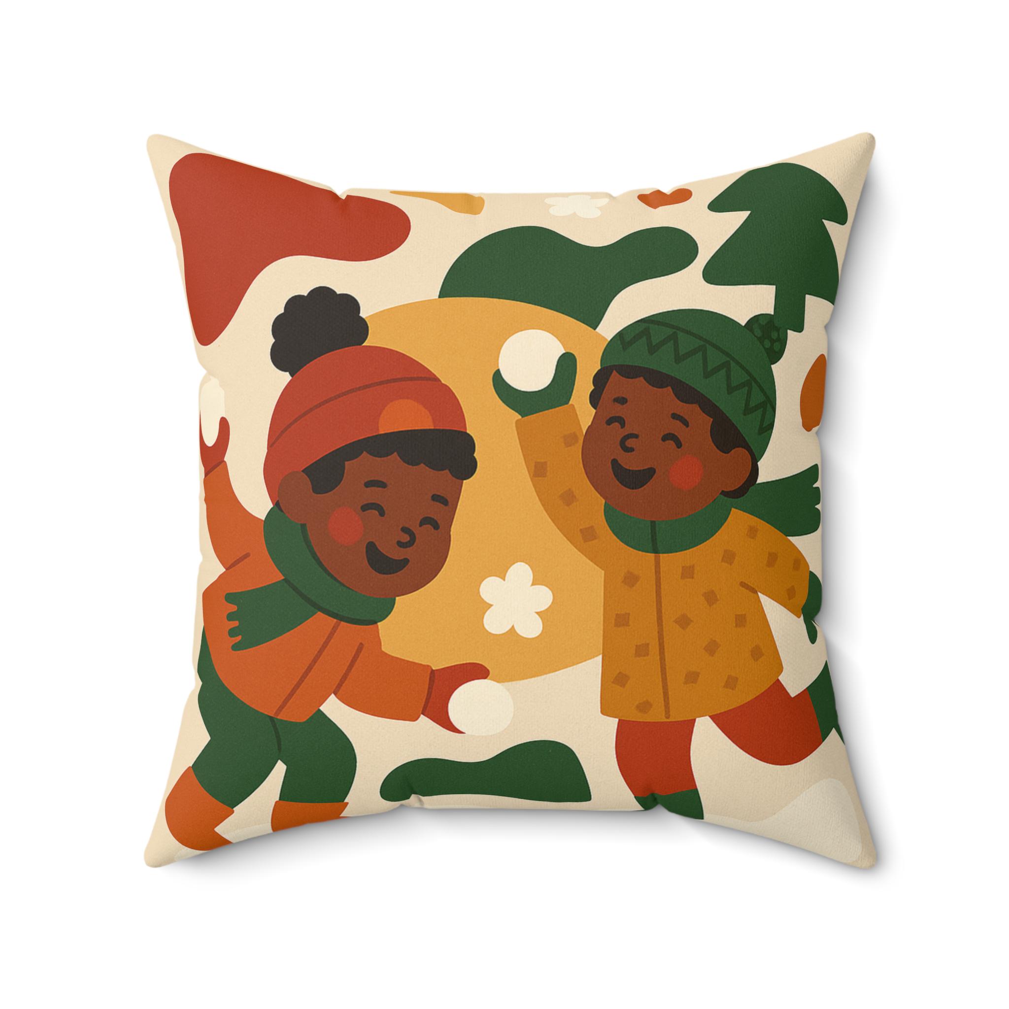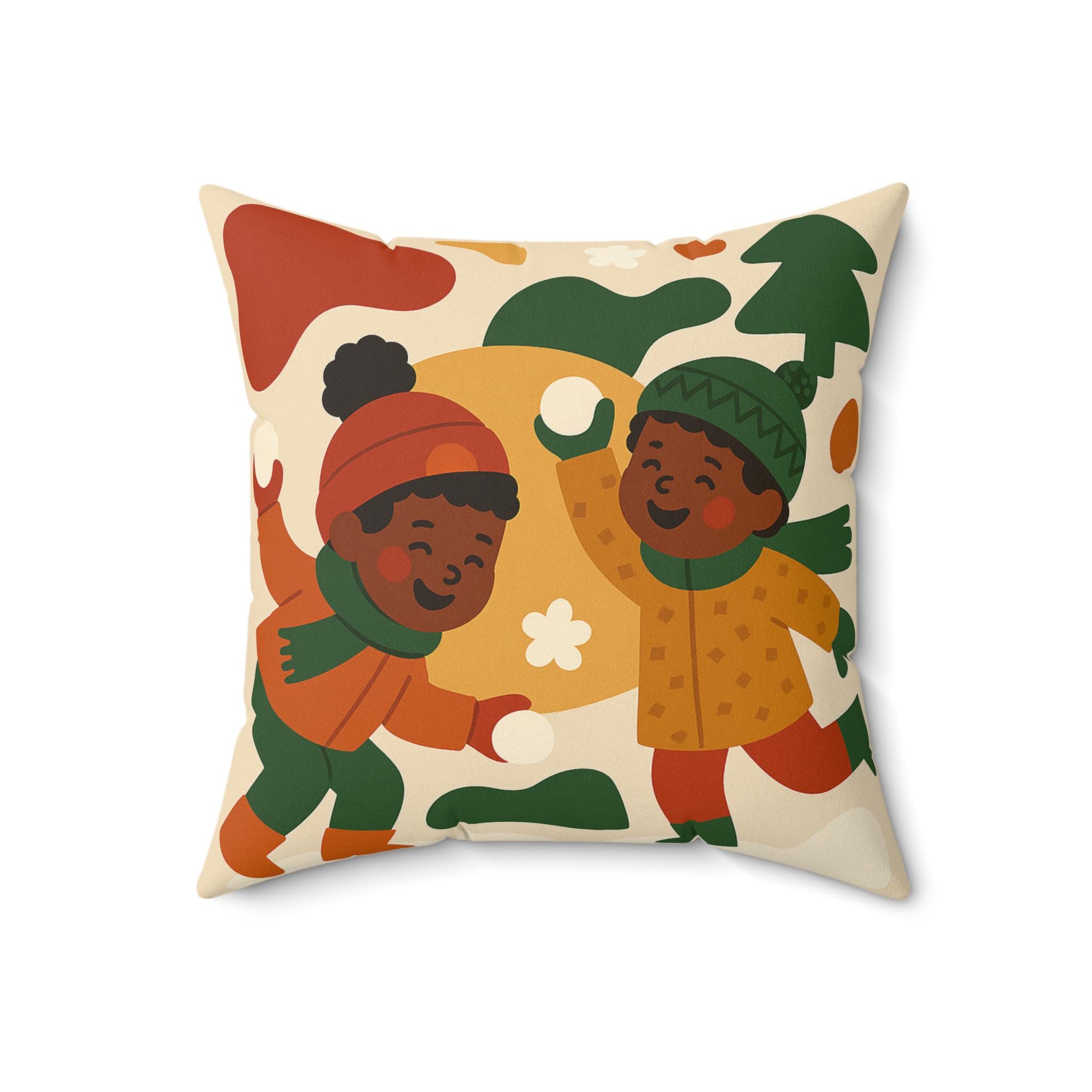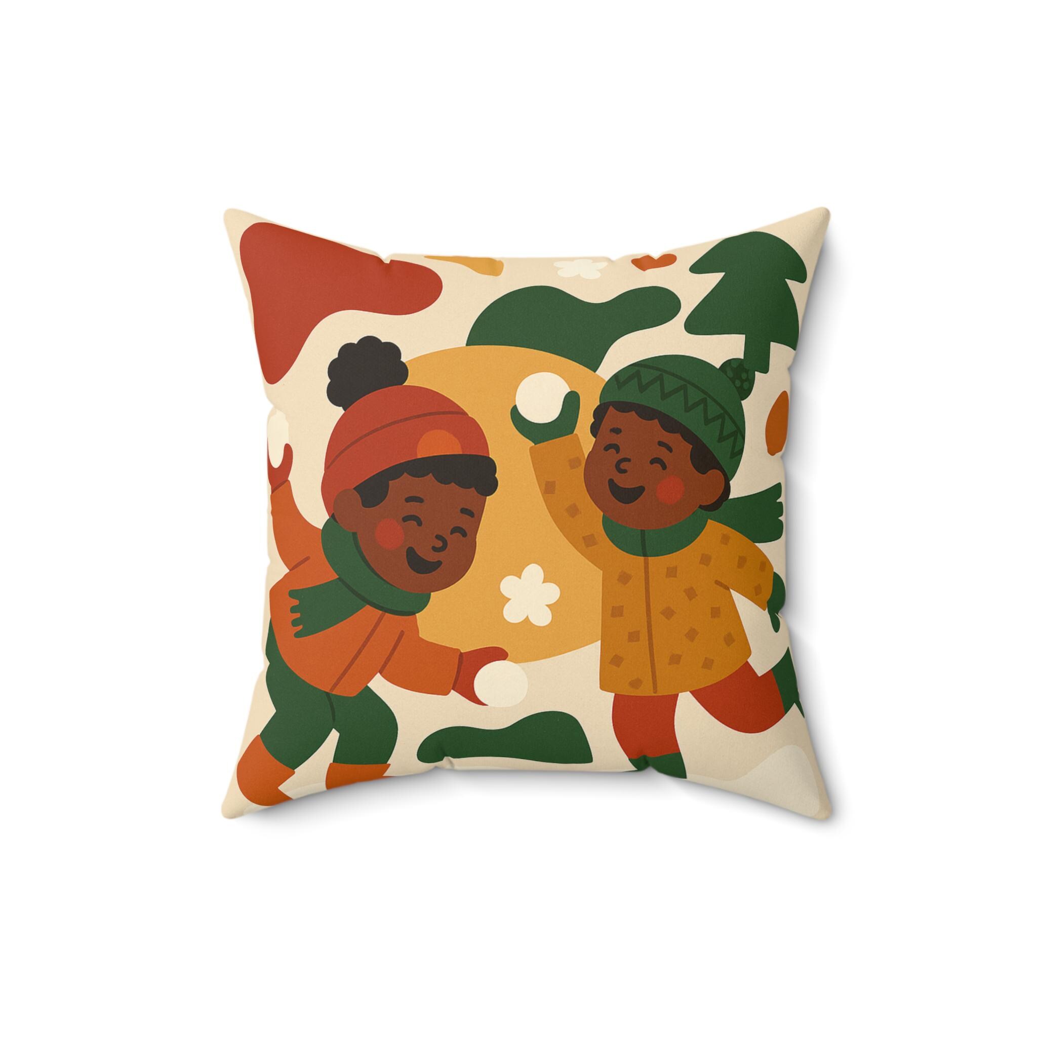 This charming pillow features a festive holiday scene of children throwing snowballs, perfect for adding a touch of winter wonderland to your home decor. The soft spun polyester material ensures durability and easy maintenance, making it ideal for cozying up during the holiday season. A great gift for families with young children or anyone who loves the magic of winter holidays.