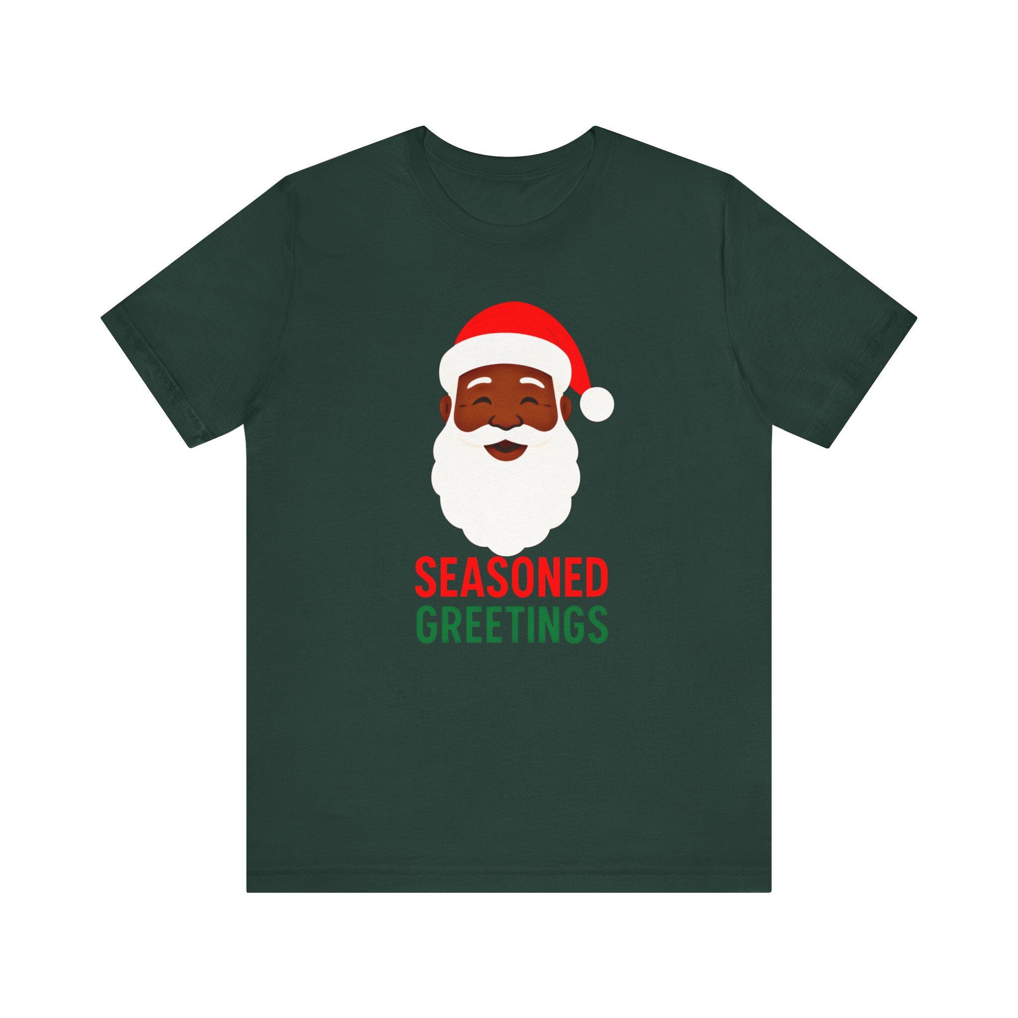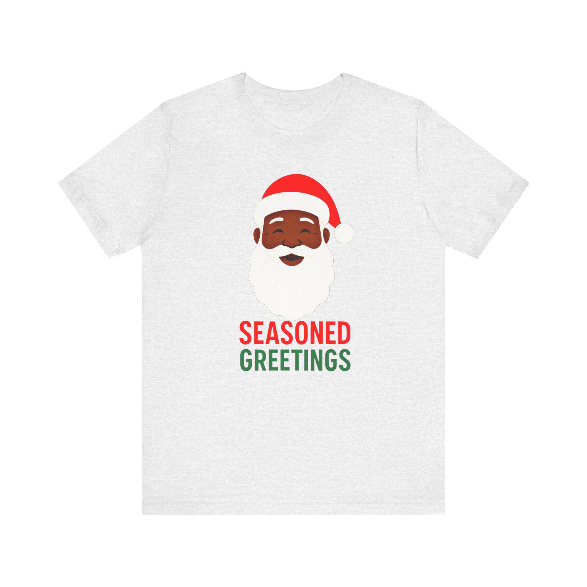 This Seasoned Greetings T-Shirt exudes a cheerful and festive vibe, making it perfect for those who love celebrating holidays and spreading joy. It is a great addition to anyone's casual wardrobe, especially during the holiday season.