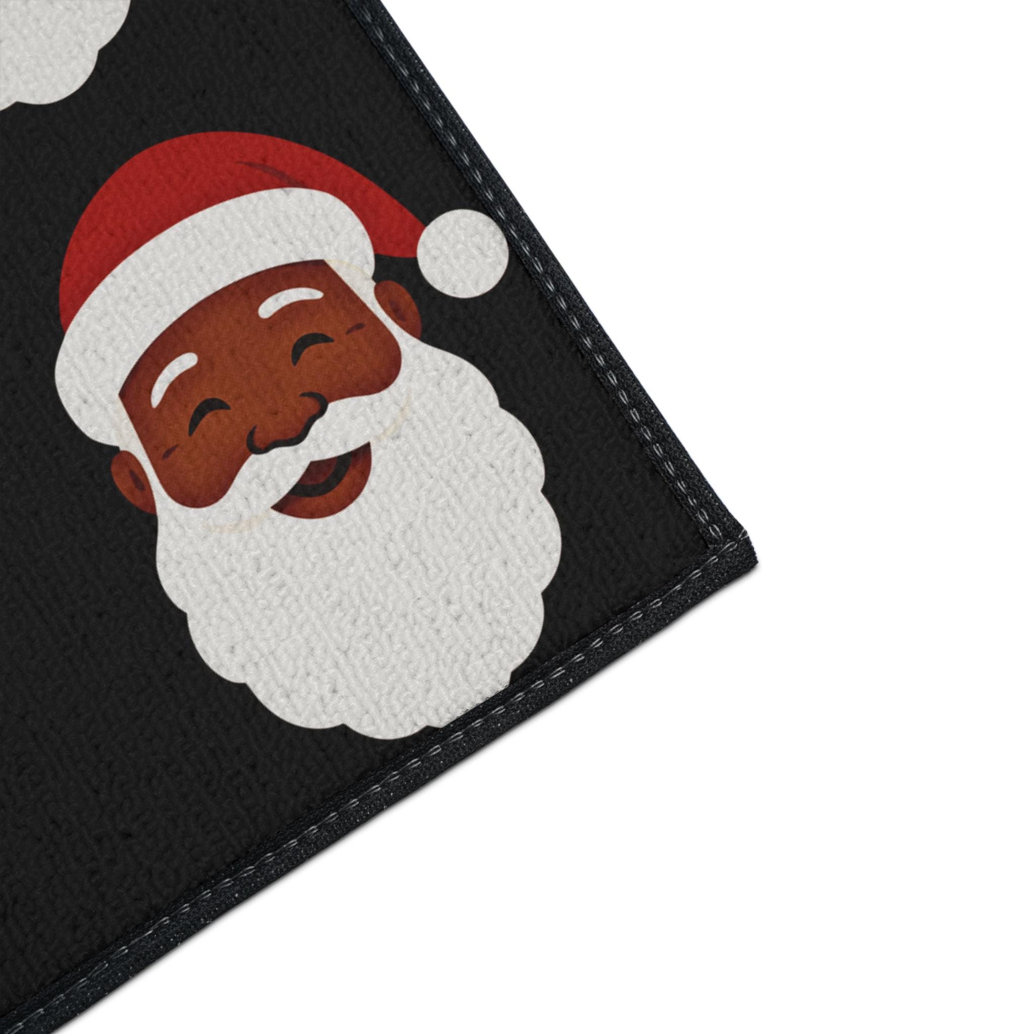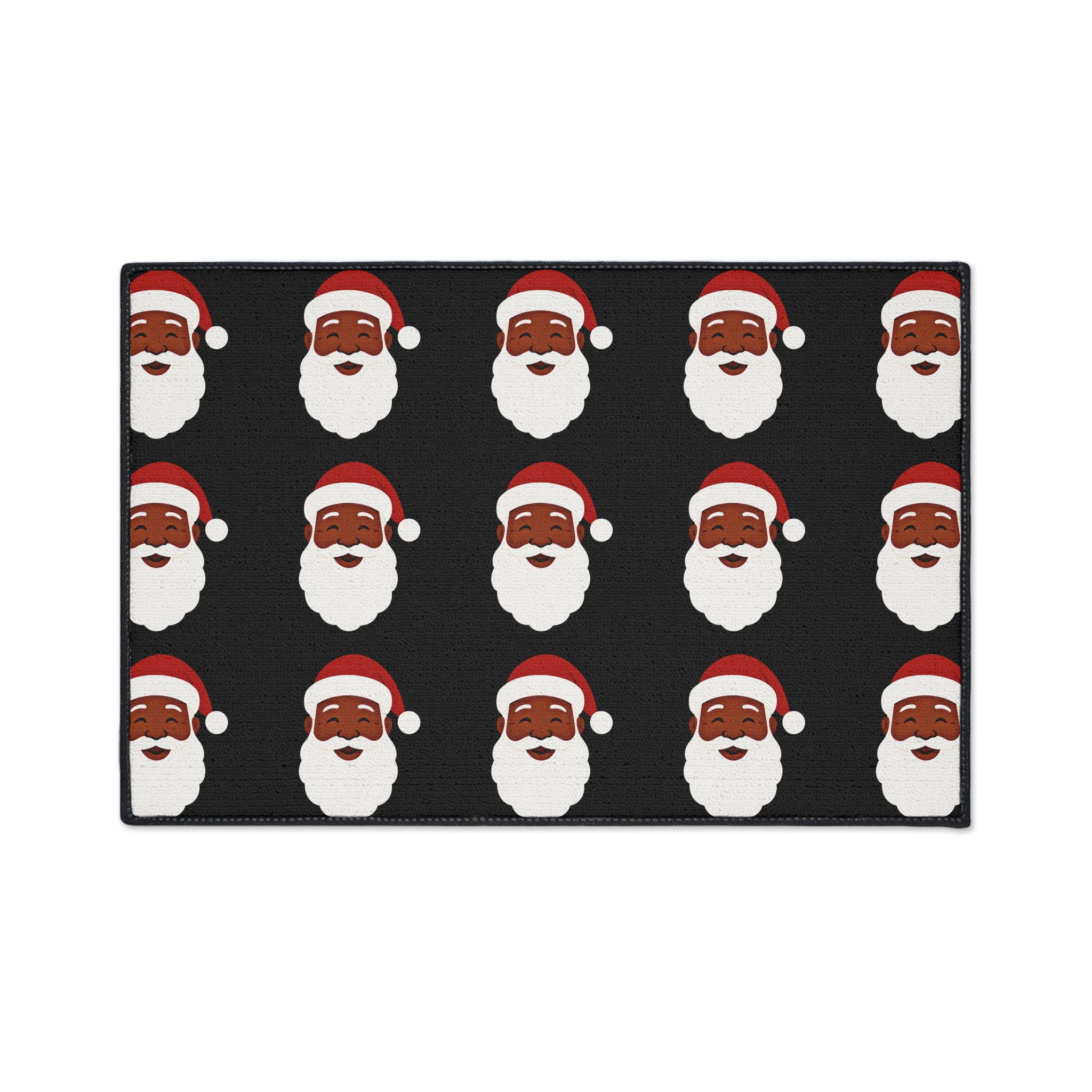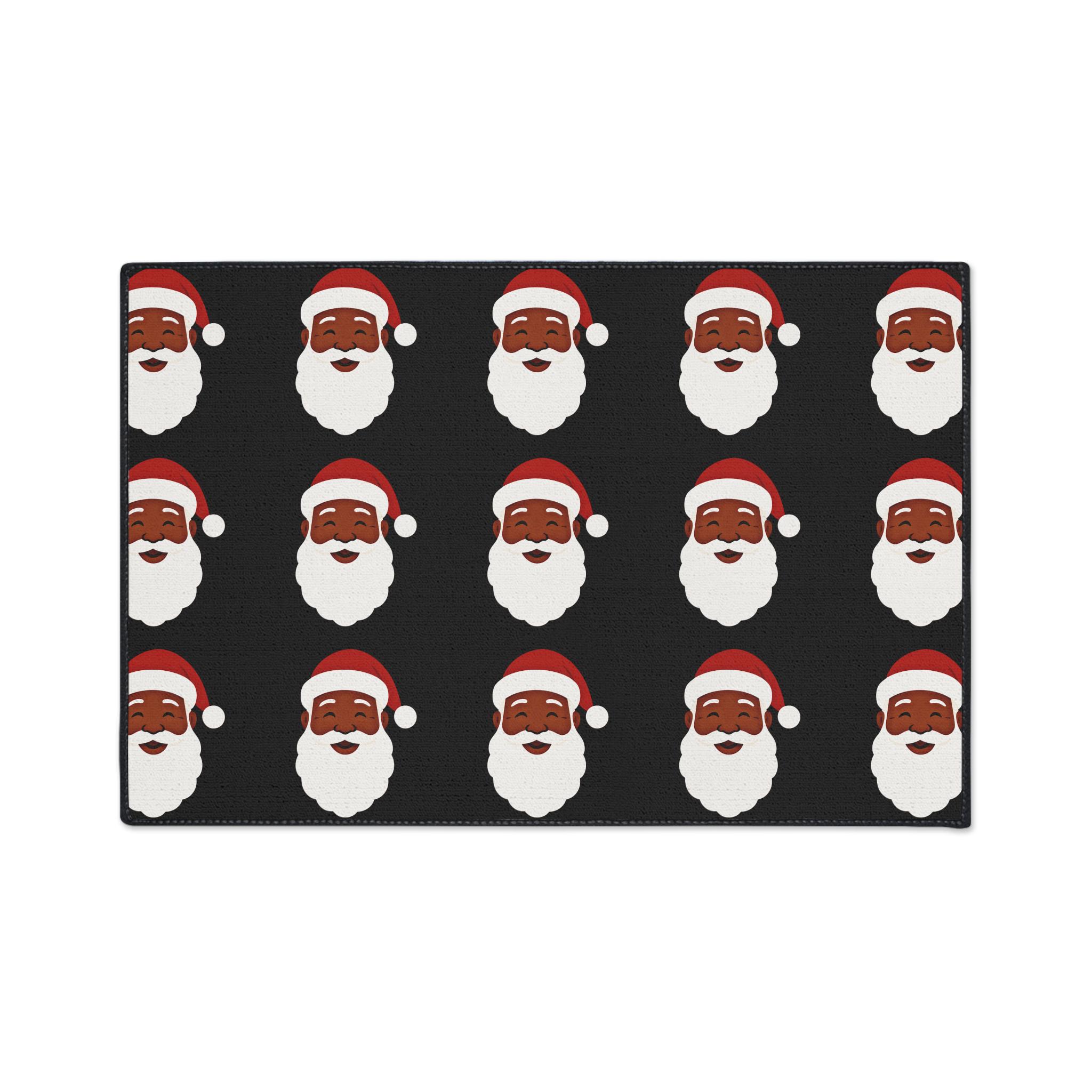 A festive heavy-duty floor mat that brings holiday cheer right to your doorway. Bold Black Santas repeats across a warm black background, creating an upbeat, vintage-inspired look that welcomes guests and sets a merry tone. The printed polyester face holds vivid color and crisp edges, while the textured rubber backing keeps the mat steady through comings and goings. Black trim frames the design for a clean finish. Place it at an entry, in front of a kitchen sink, or beneath a tree to add a playful seasonal accent that holds up to everyday life.