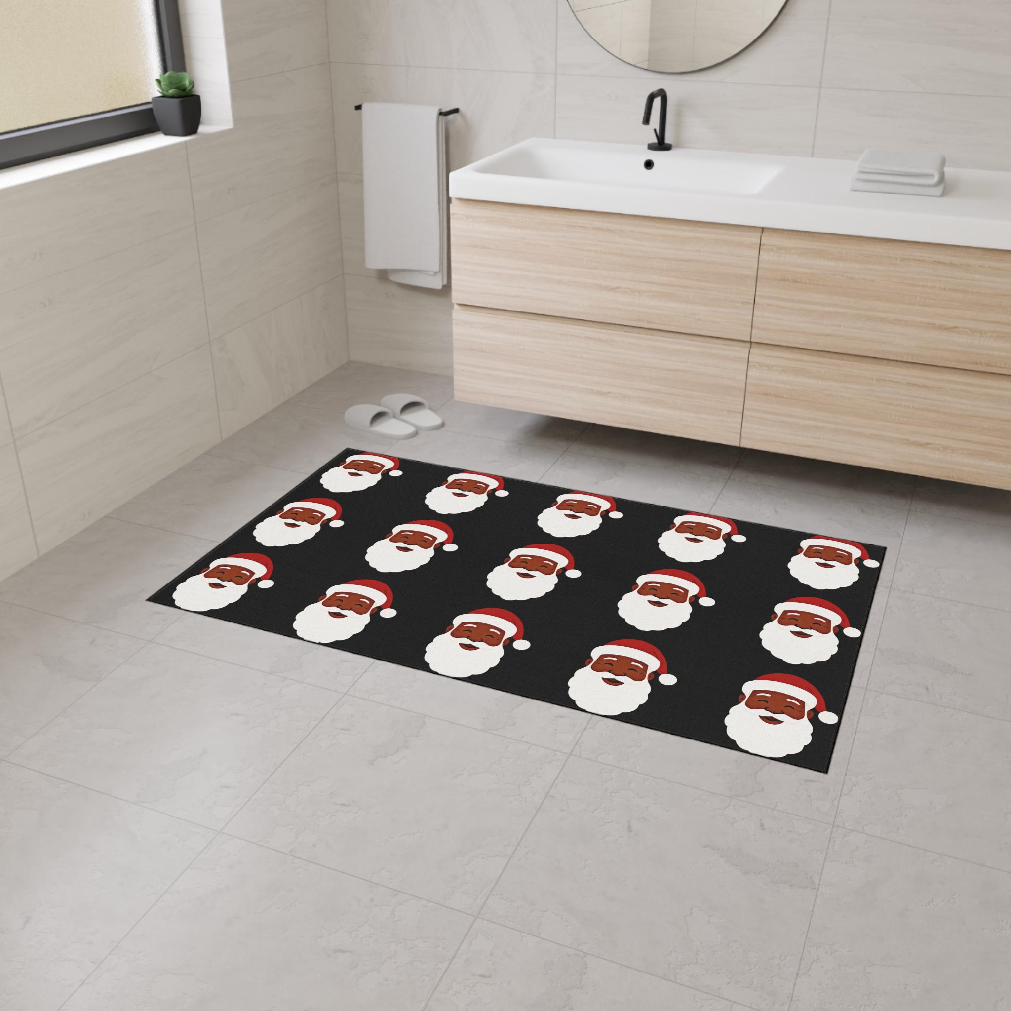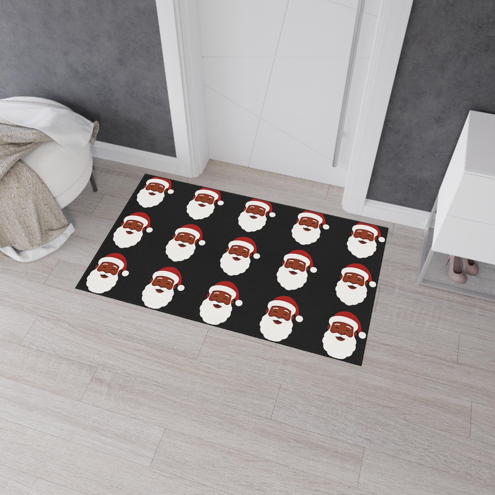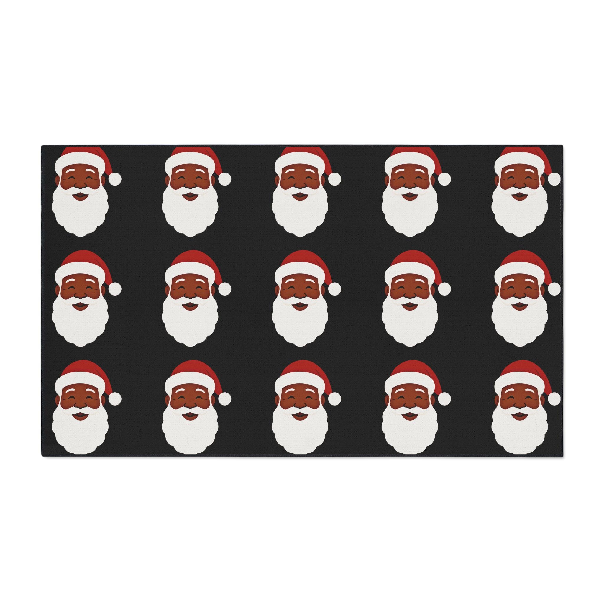 A festive heavy-duty floor mat that brings holiday cheer right to your doorway. Bold Black Santas repeats across a warm black background, creating an upbeat, vintage-inspired look that welcomes guests and sets a merry tone. The printed polyester face holds vivid color and crisp edges, while the textured rubber backing keeps the mat steady through comings and goings. Black trim frames the design for a clean finish. Place it at an entry, in front of a kitchen sink, or beneath a tree to add a playful seasonal accent that holds up to everyday life.