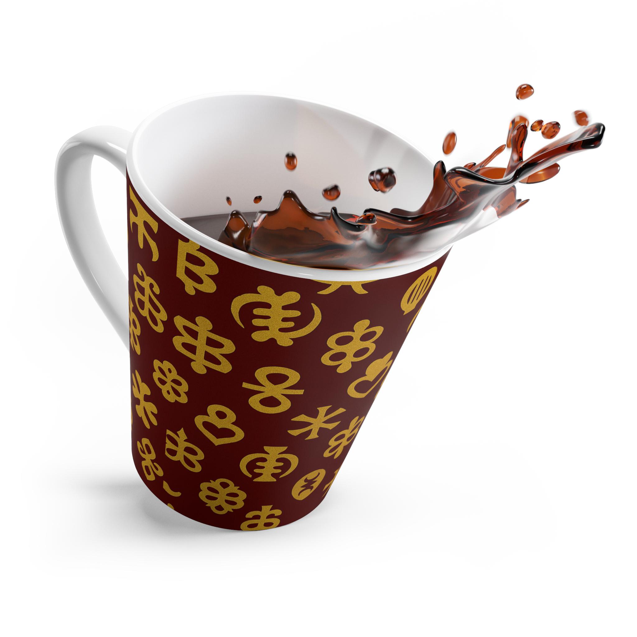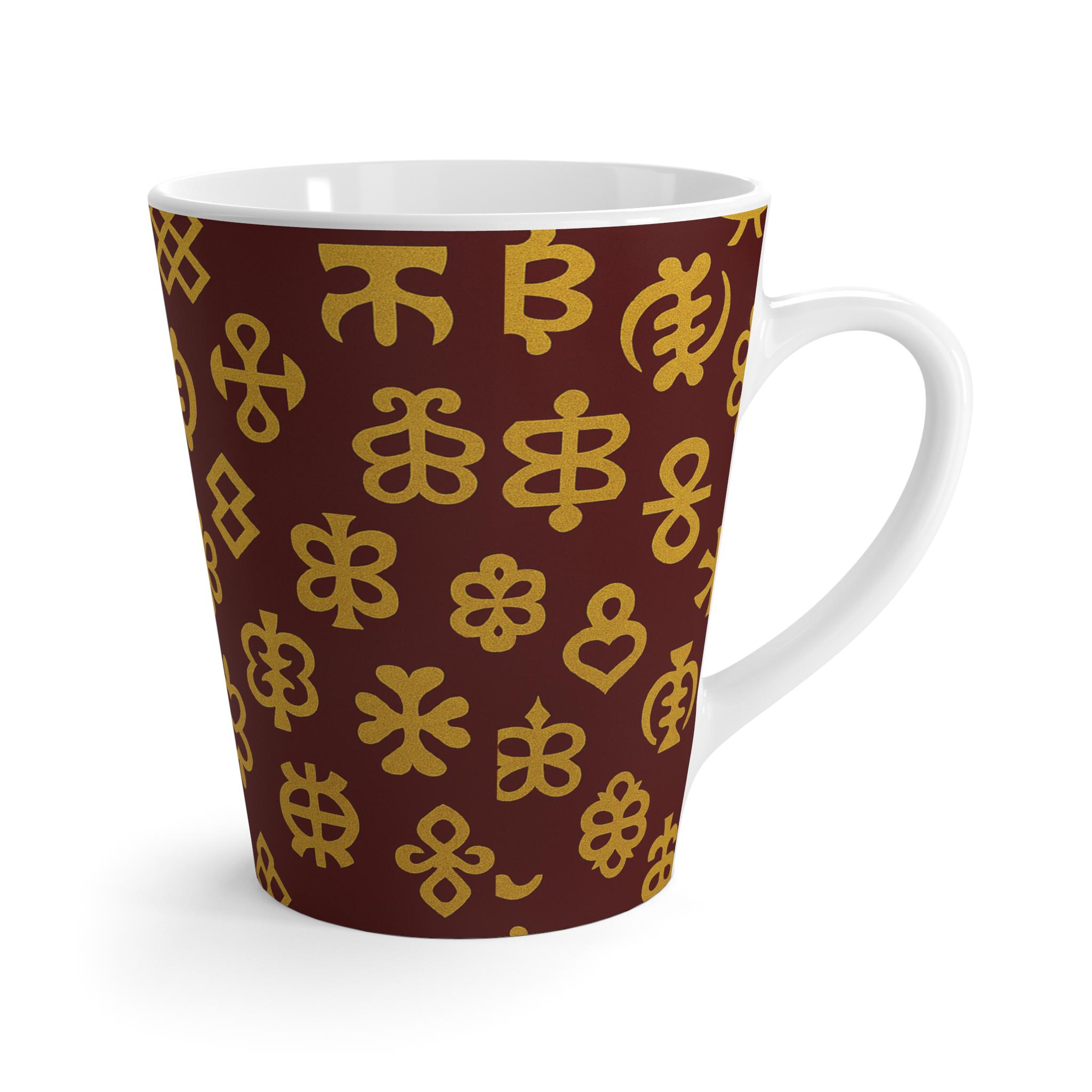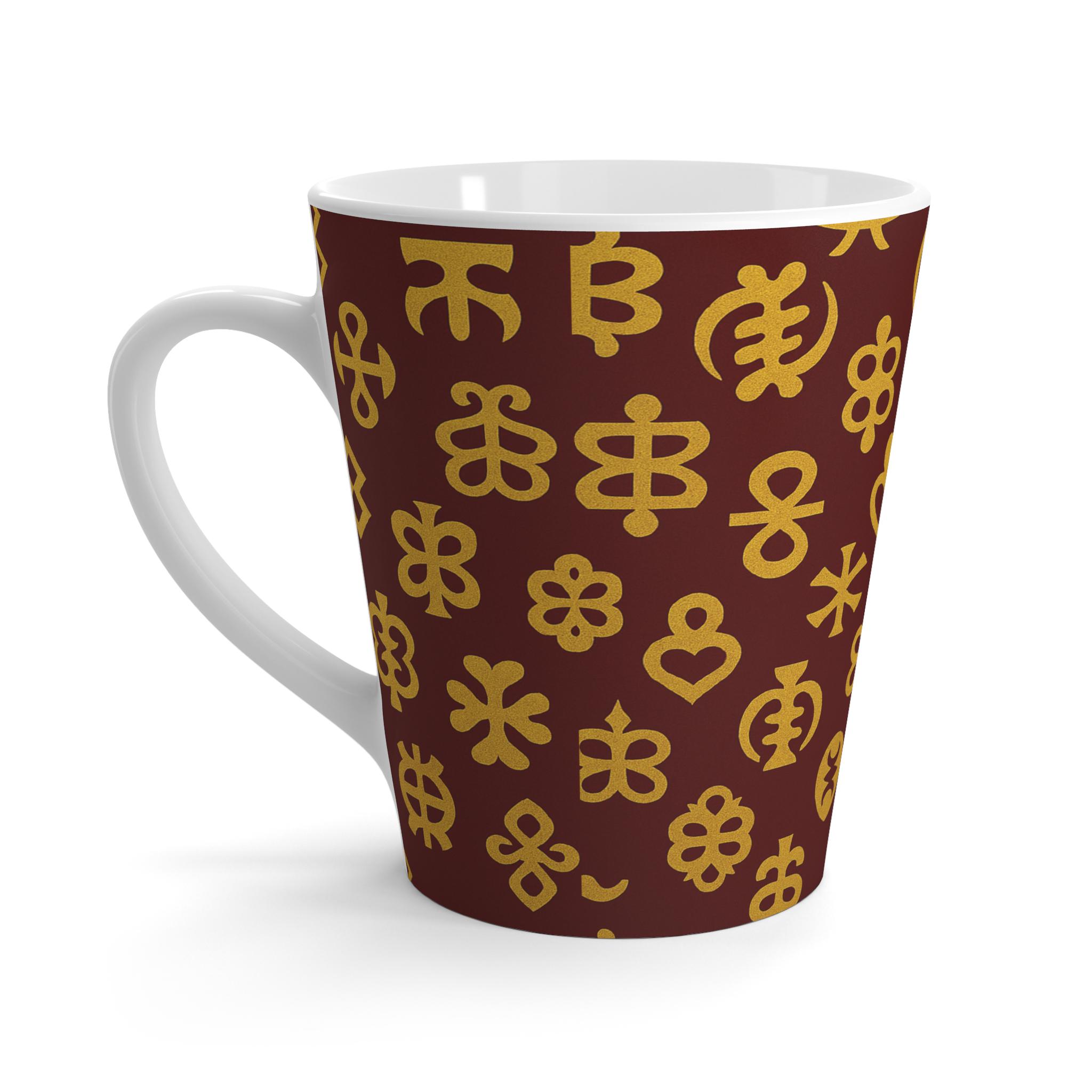 This 12oz ceramic latte mug brings a quiet, handcrafted elegance to your morning ritual. Deep burgundy wraps the tapered silhouette, while warm golden motifs—simple blooms, stars, and symbolic shapes—repeat around the curve like a slow, familiar pattern. It feels like a small, comforting object you reach for when you want a mindful start: cozy steam, a soft ceramic weight in your hand, and a little touch of rustic charm on the table.