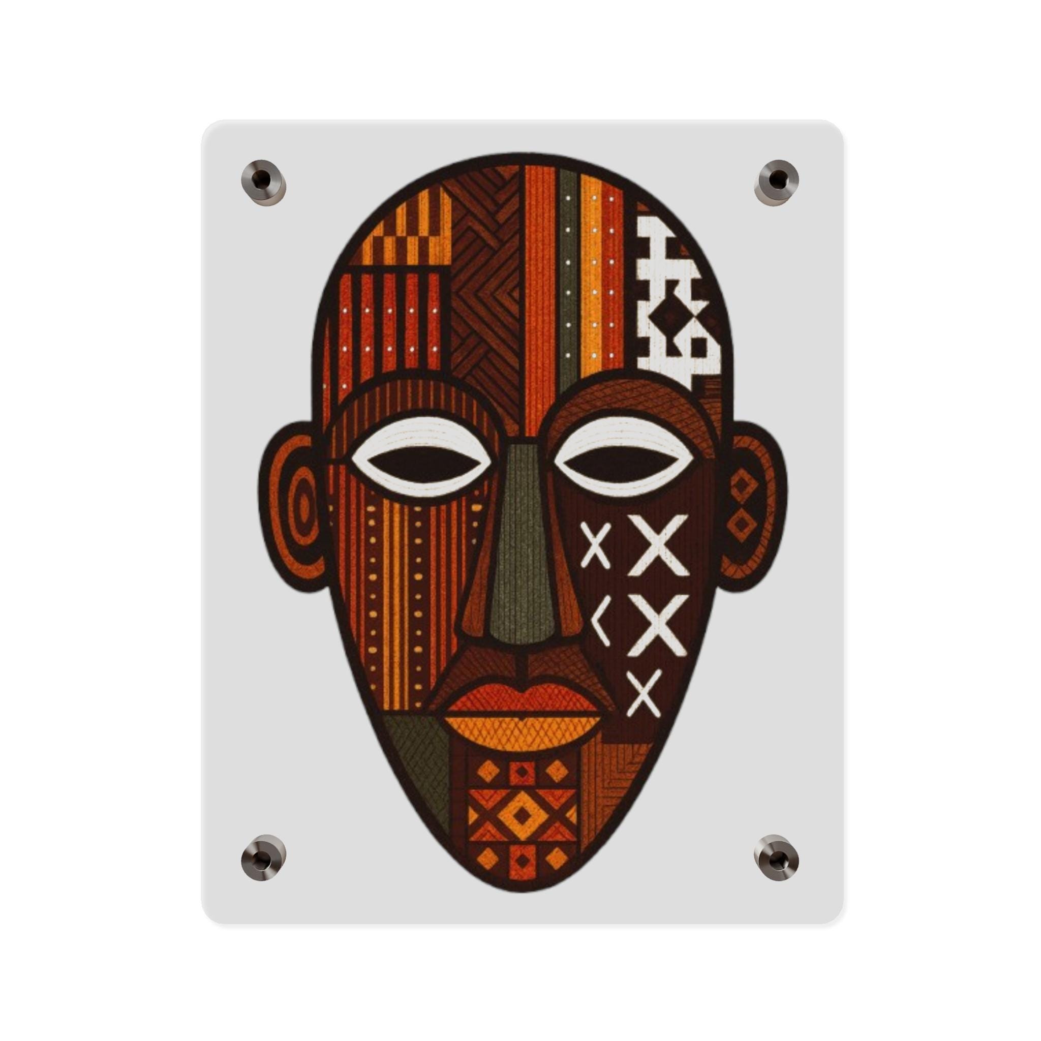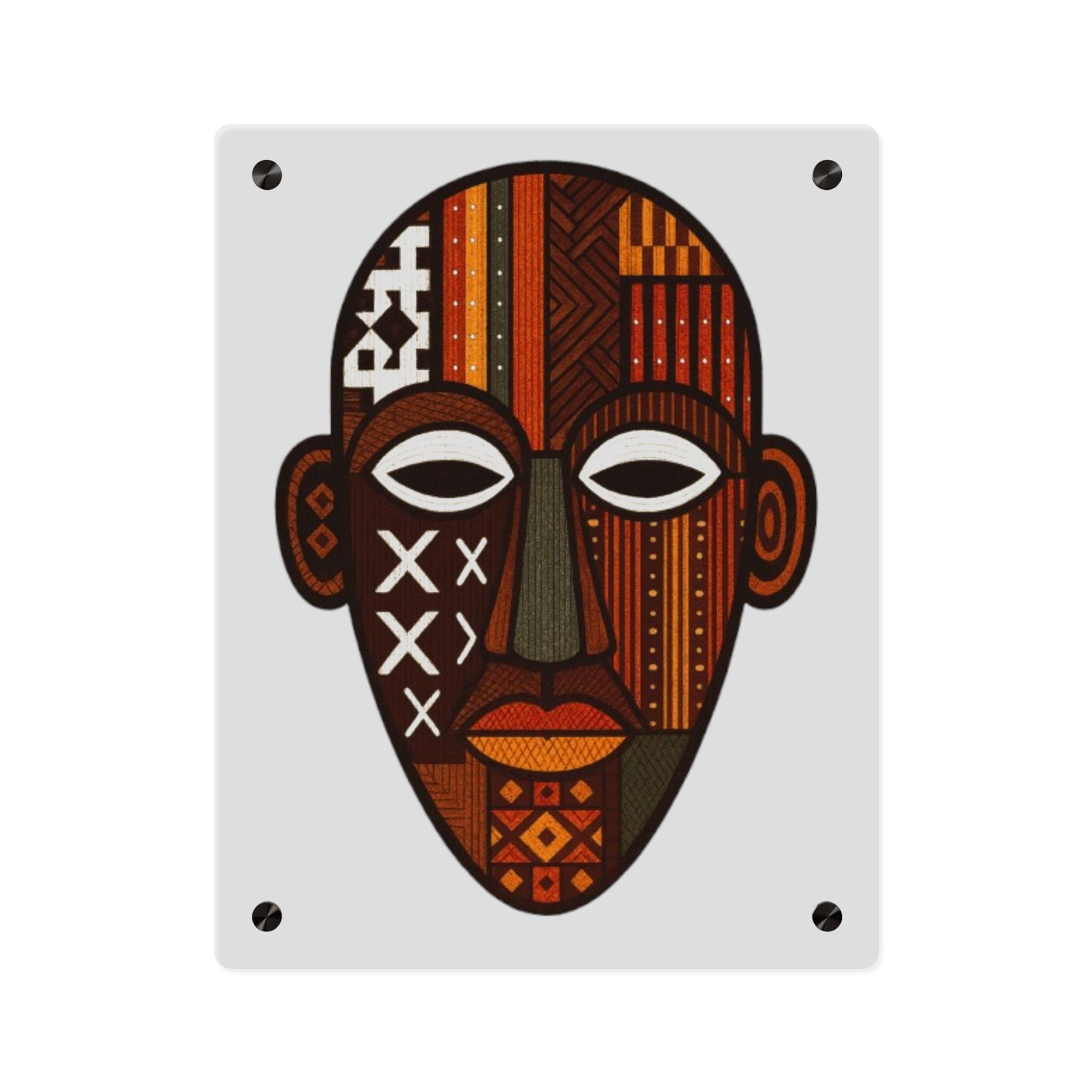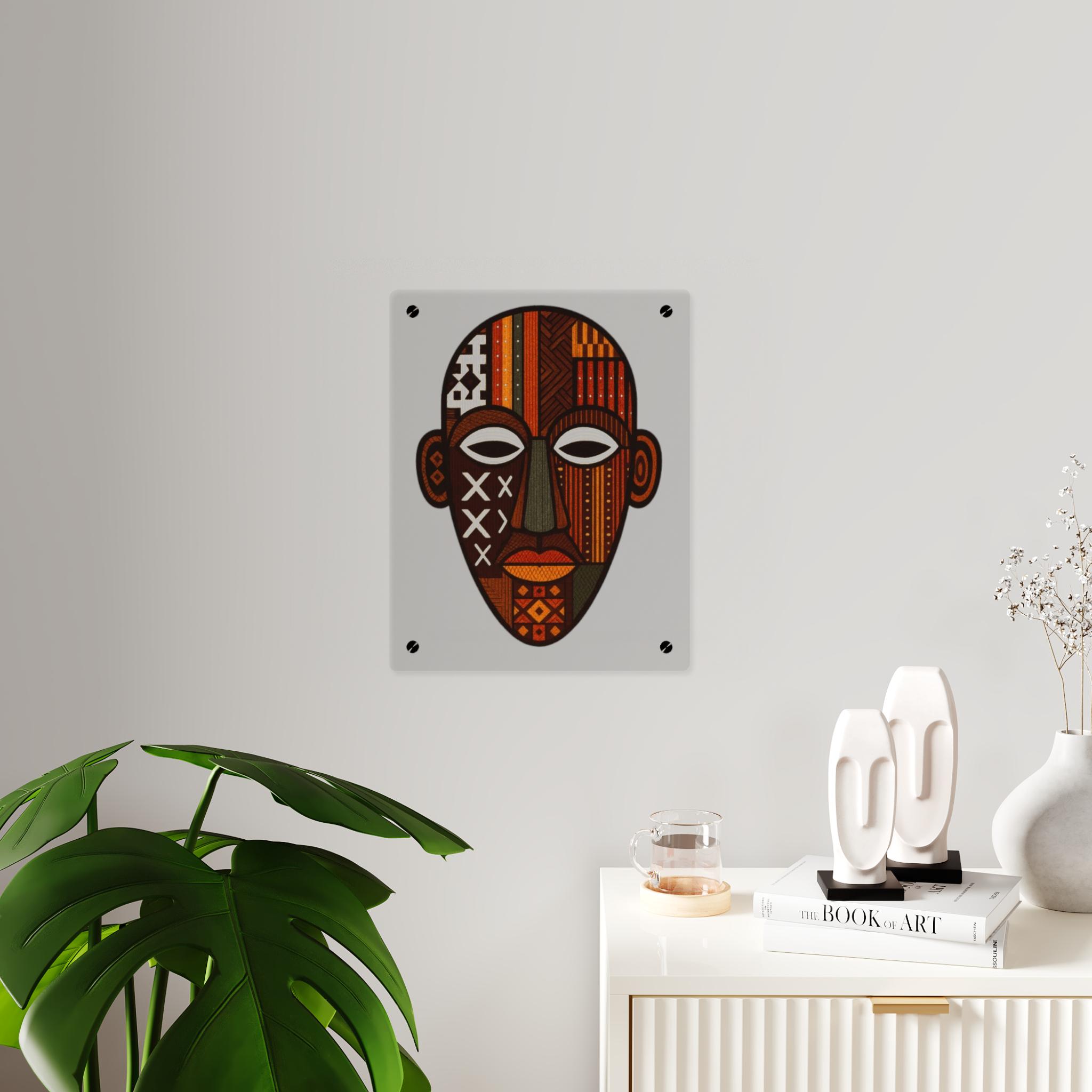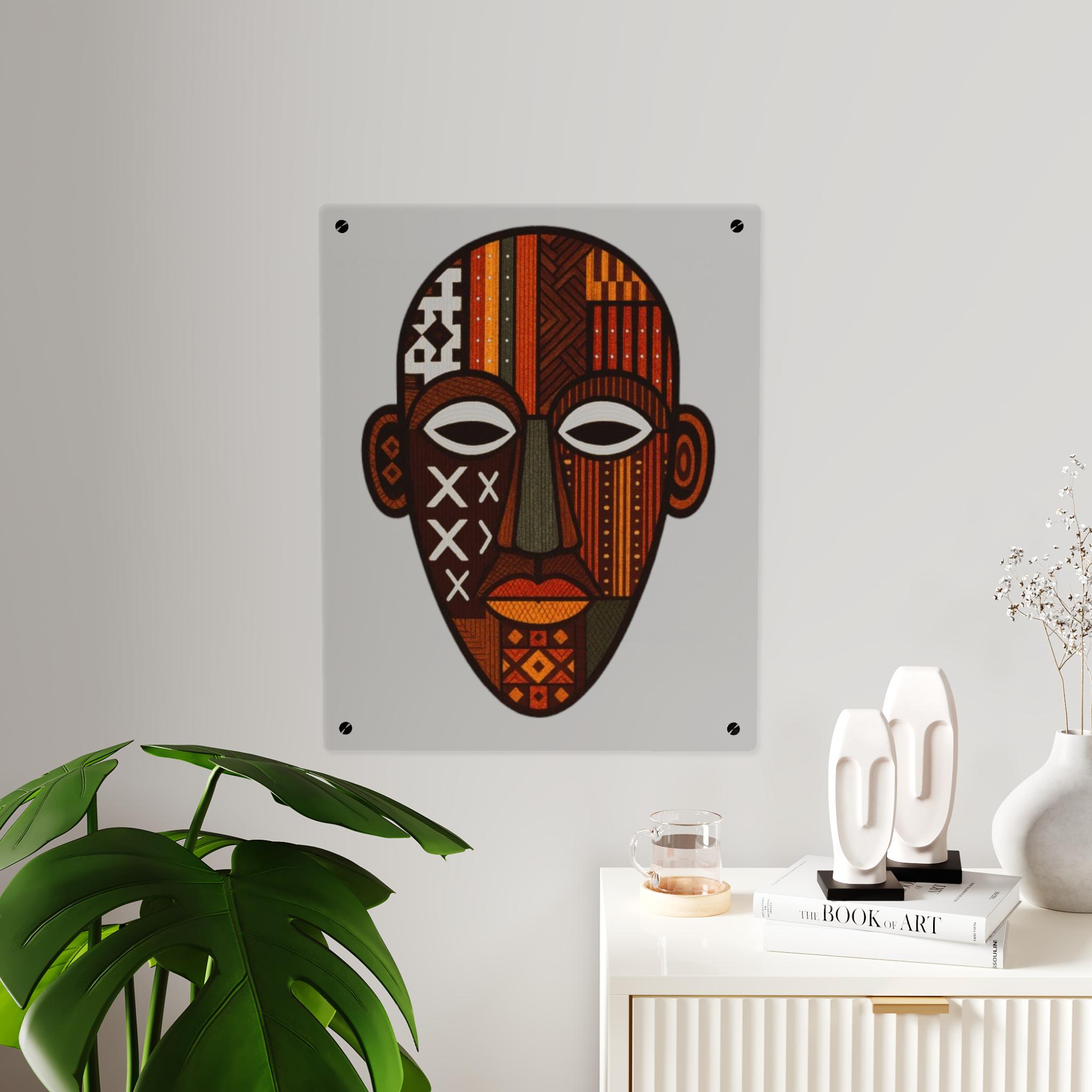 This clear acrylic wall panel brings bold tribal geometry and warm, earthy tones into any indoor space. Printed directly onto crisp, transparent acrylic with a white vinyl backing, the mask design appears to float within the glossy surface, its deep rusts, ochres, and patterned lines retaining bright, saturated color. Brushed silver stand-offs are included so the panel lifts from the wall, adding subtle shadow and depth that accentuates the layered pattern work. Choose from horizontal, vertical, or square orientations and from seven sizes to find the scale that complements your room—whether you want a striking focal above a console, a cultivated addition to a gallery wall, or a statement in a cozy reading nook.