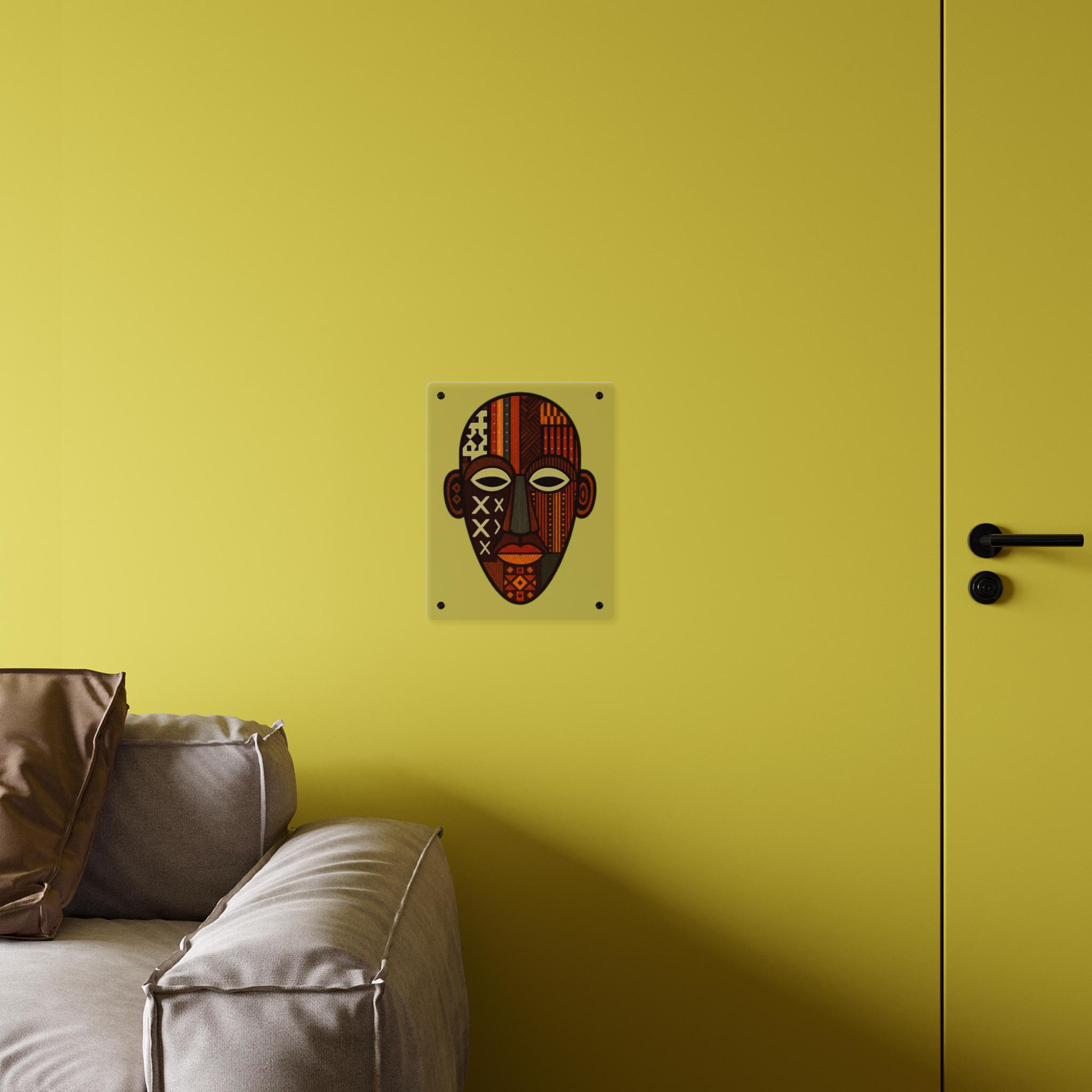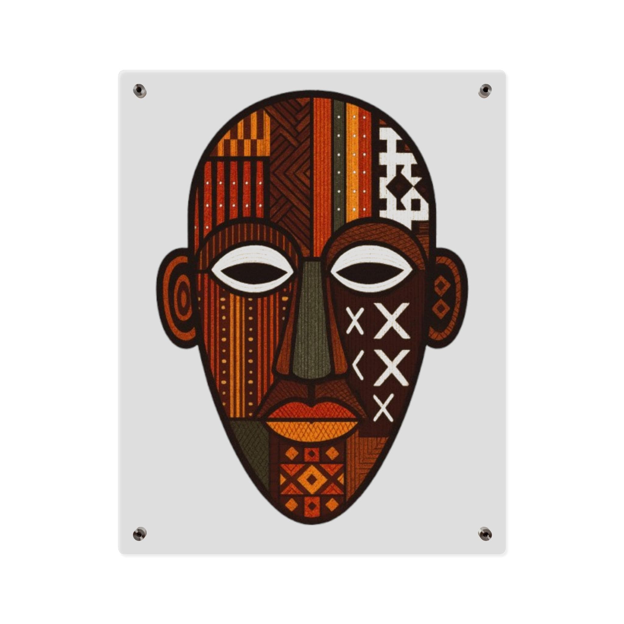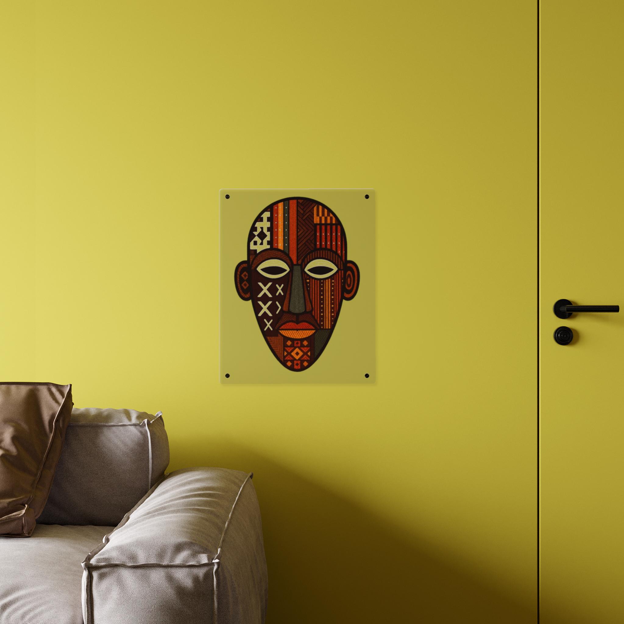 This clear acrylic wall panel brings bold tribal geometry and warm, earthy tones into any indoor space. Printed directly onto crisp, transparent acrylic with a white vinyl backing, the mask design appears to float within the glossy surface, its deep rusts, ochres, and patterned lines retaining bright, saturated color. Brushed silver stand-offs are included so the panel lifts from the wall, adding subtle shadow and depth that accentuates the layered pattern work. Choose from horizontal, vertical, or square orientations and from seven sizes to find the scale that complements your room—whether you want a striking focal above a console, a cultivated addition to a gallery wall, or a statement in a cozy reading nook.