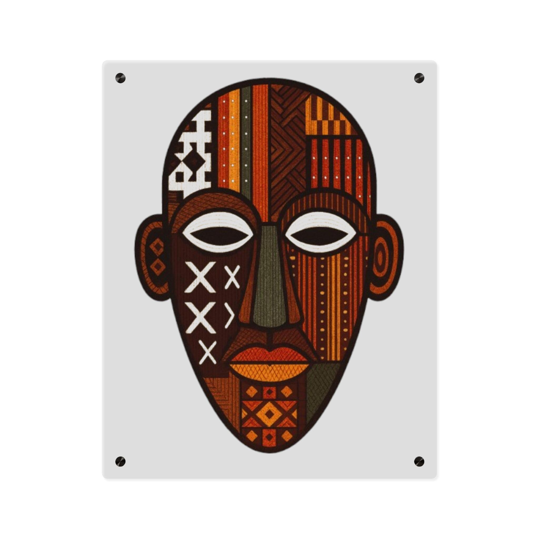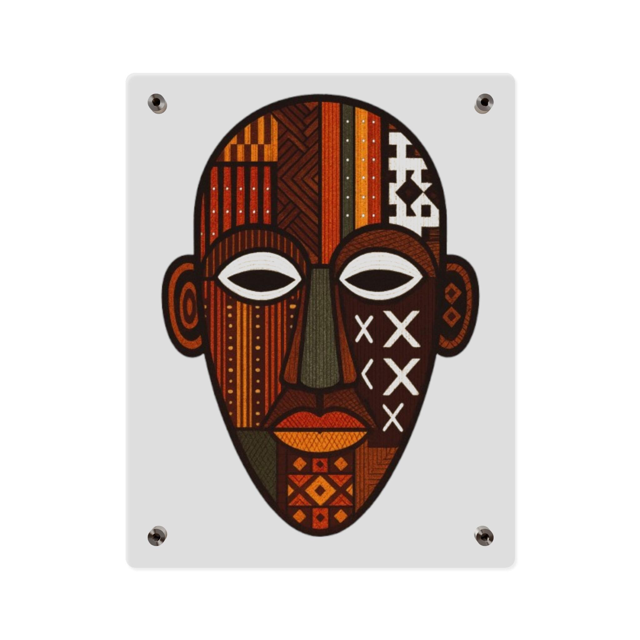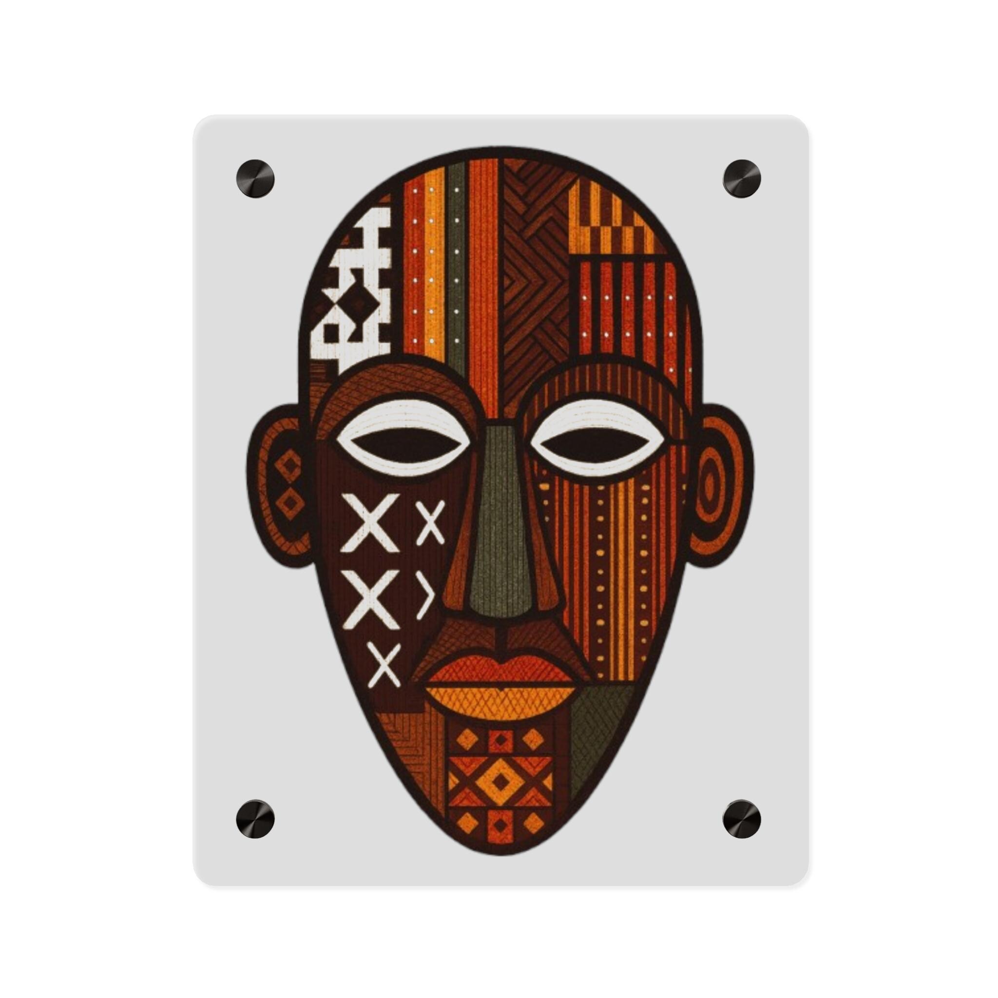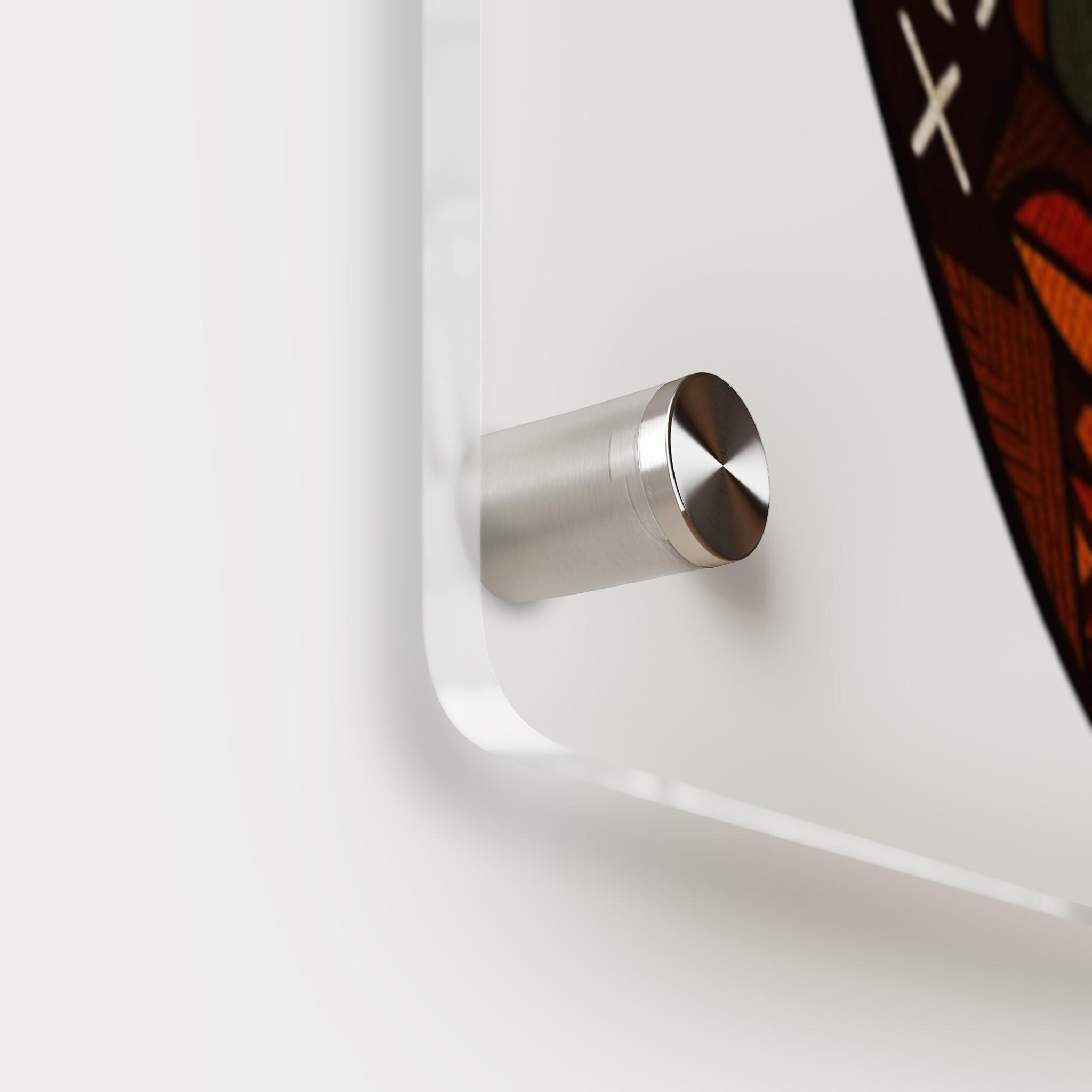 This clear acrylic wall panel brings bold tribal geometry and warm, earthy tones into any indoor space. Printed directly onto crisp, transparent acrylic with a white vinyl backing, the mask design appears to float within the glossy surface, its deep rusts, ochres, and patterned lines retaining bright, saturated color. Brushed silver stand-offs are included so the panel lifts from the wall, adding subtle shadow and depth that accentuates the layered pattern work. Choose from horizontal, vertical, or square orientations and from seven sizes to find the scale that complements your room—whether you want a striking focal above a console, a cultivated addition to a gallery wall, or a statement in a cozy reading nook.