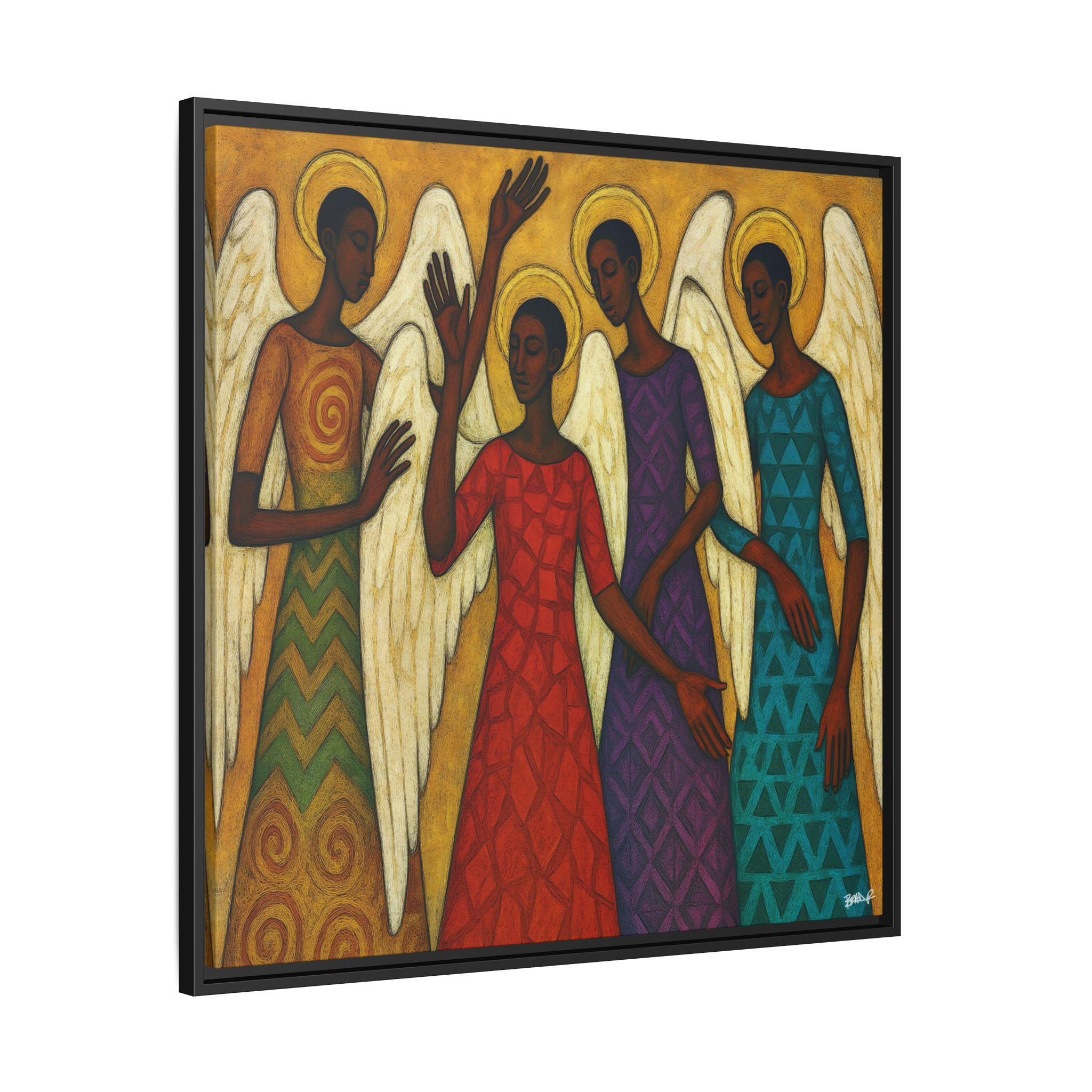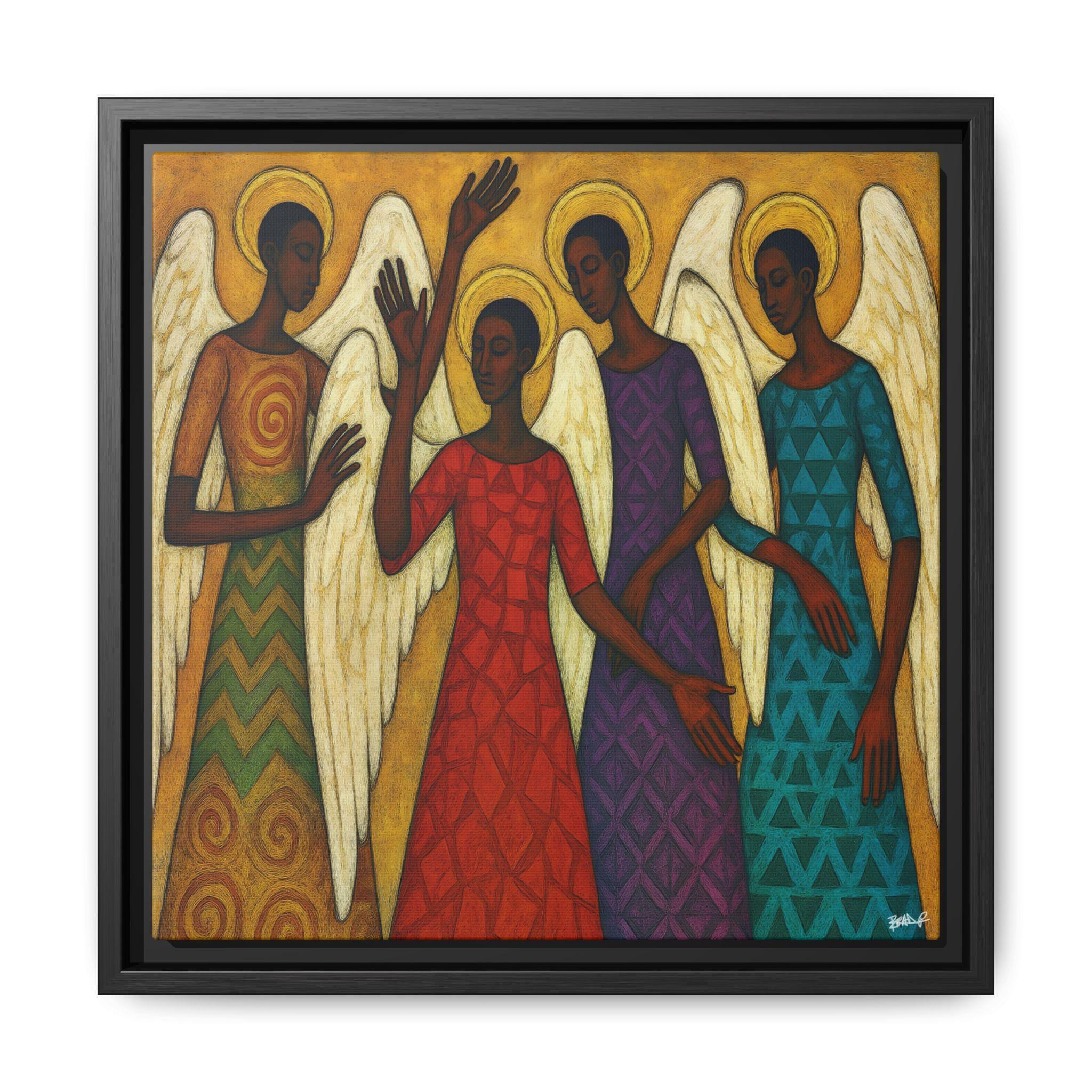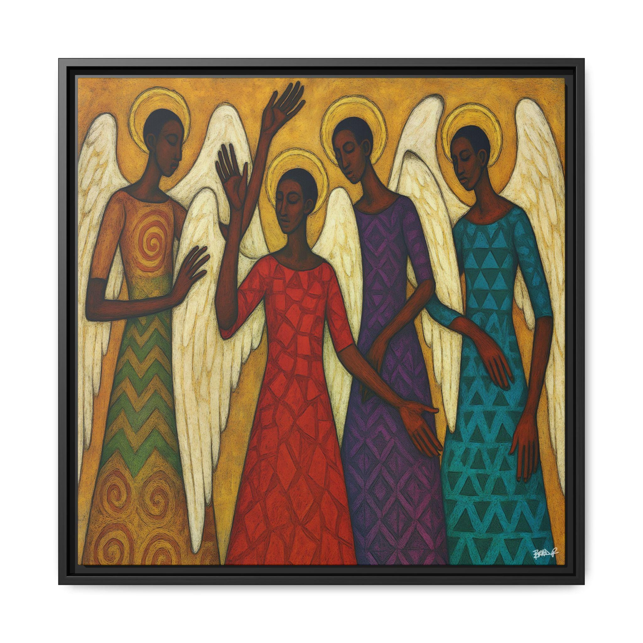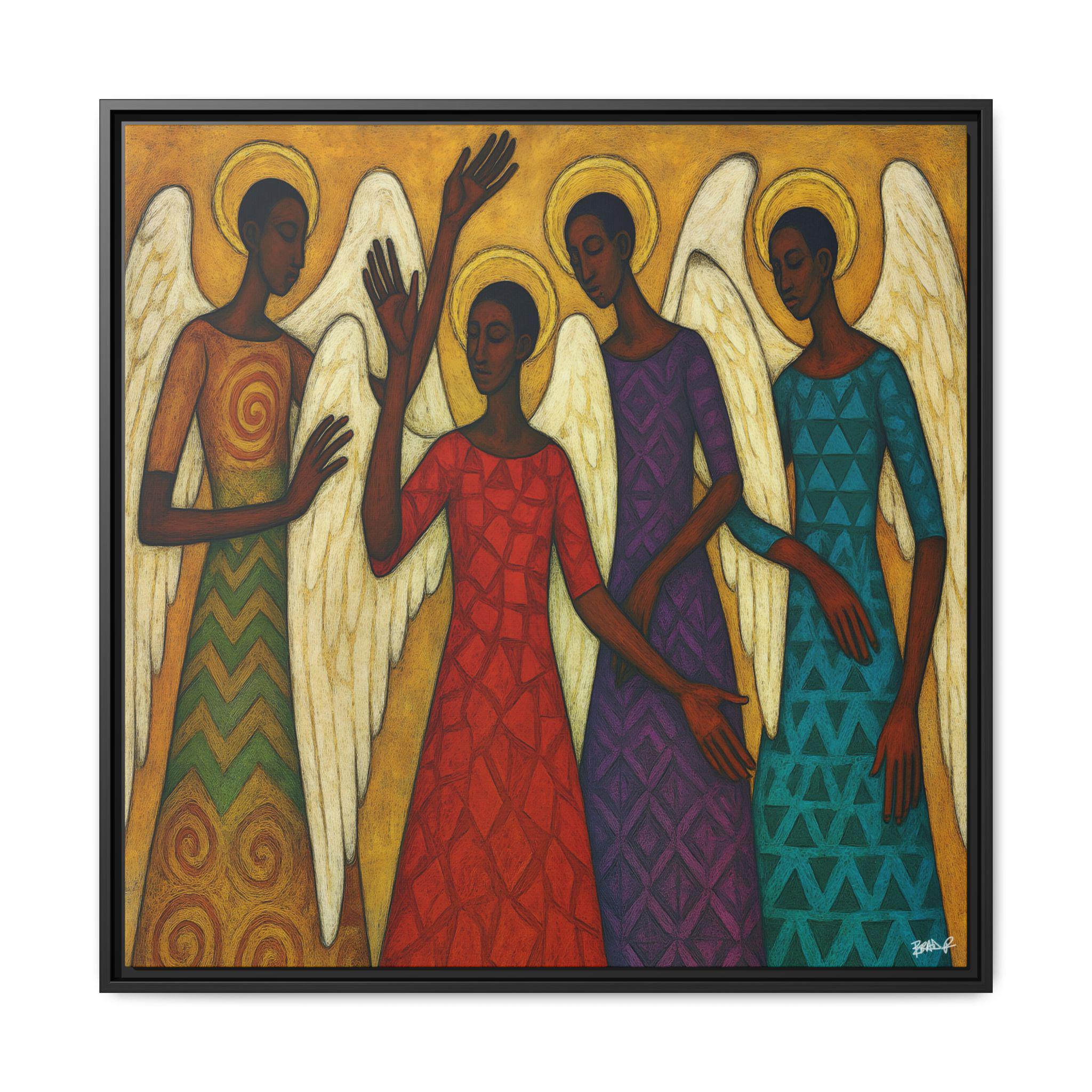The Blessed Gathering portrays four celestial beings united in stillness and praise, their presence radiating grace, strength, and divine harmony. Each angel—adorned in richly patterned robes of red, gold, violet, and teal—embodies a different frequency of light and spirit. Their poised gestures and intricate wings evoke both movement and meditation, echoing the visual rhythm of a sacred song.