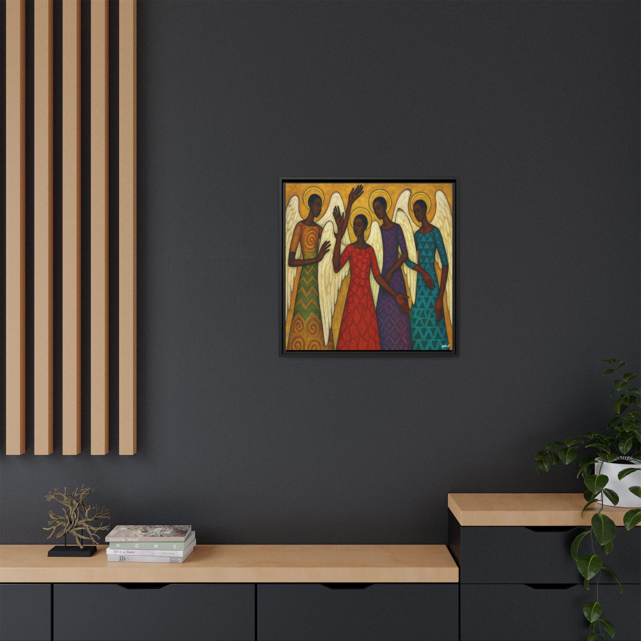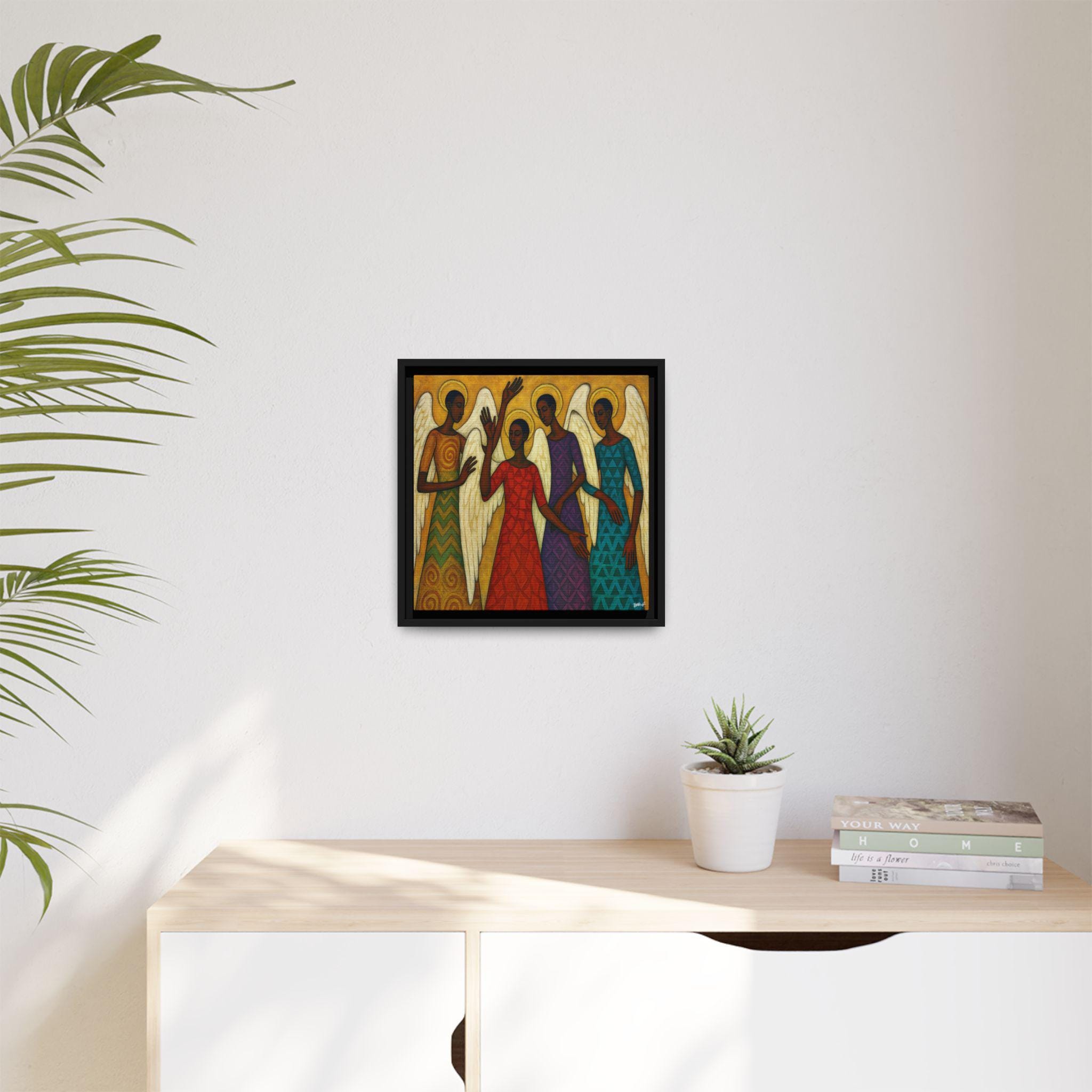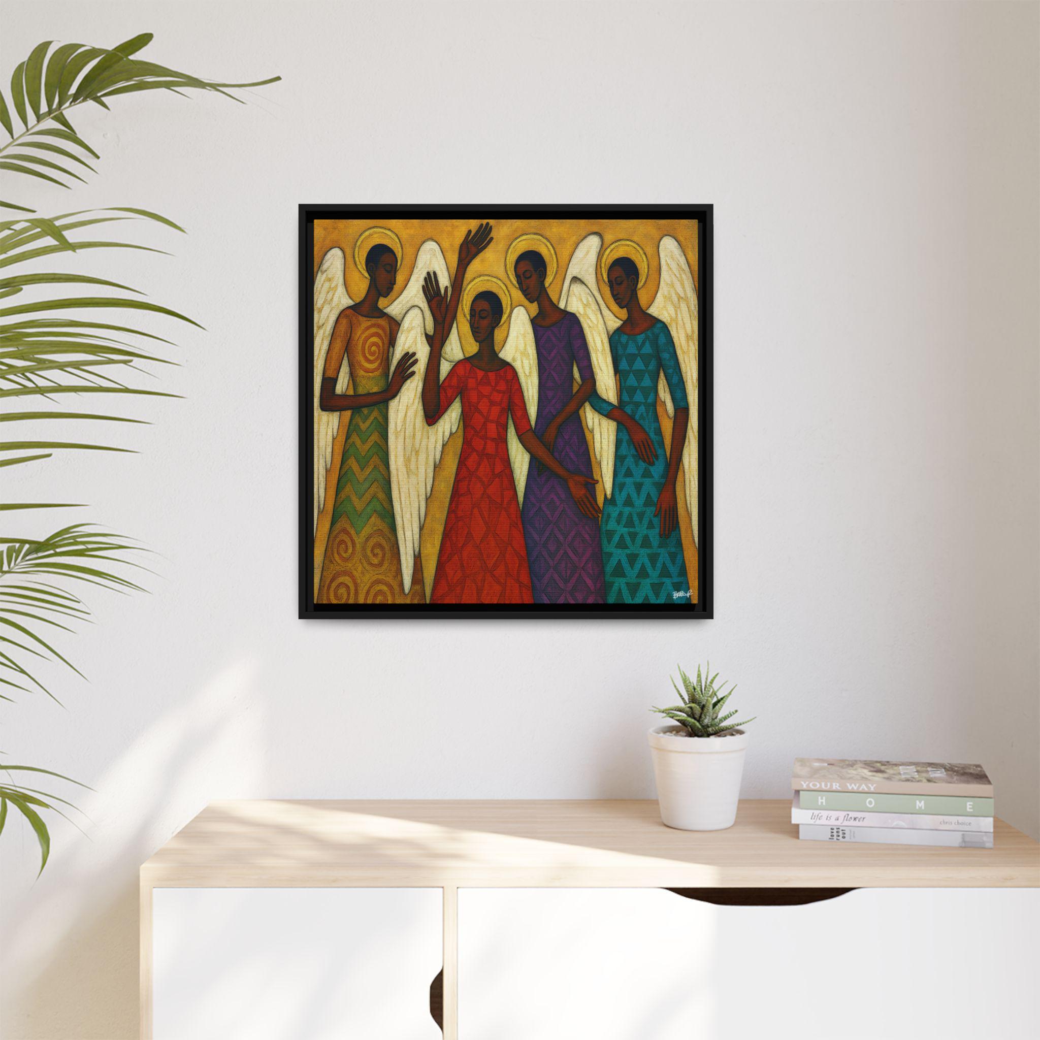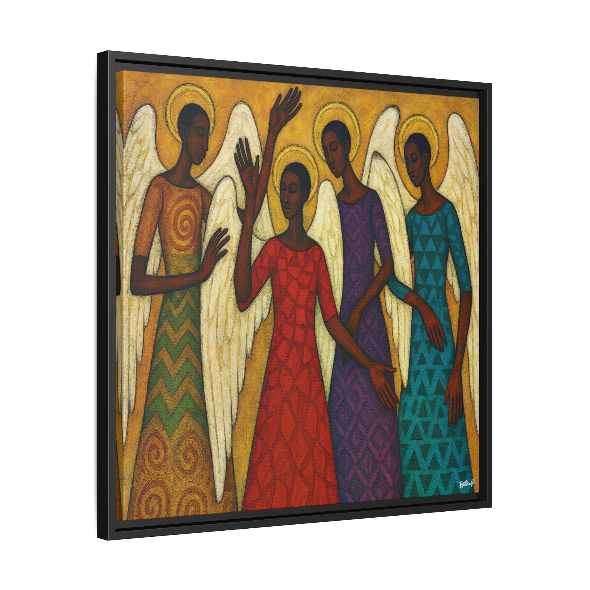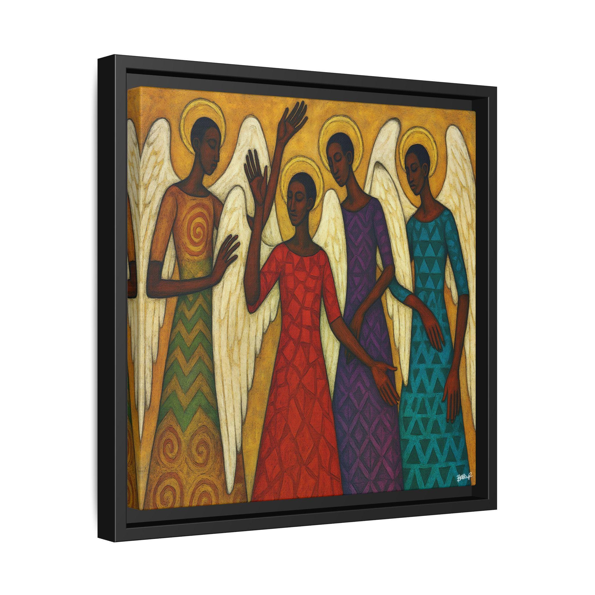 The Blessed Gathering portrays four celestial beings united in stillness and praise, their presence radiating grace, strength, and divine harmony. Each angel—adorned in richly patterned robes of red, gold, violet, and teal—embodies a different frequency of light and spirit. Their poised gestures and intricate wings evoke both movement and meditation, echoing the visual rhythm of a sacred song.