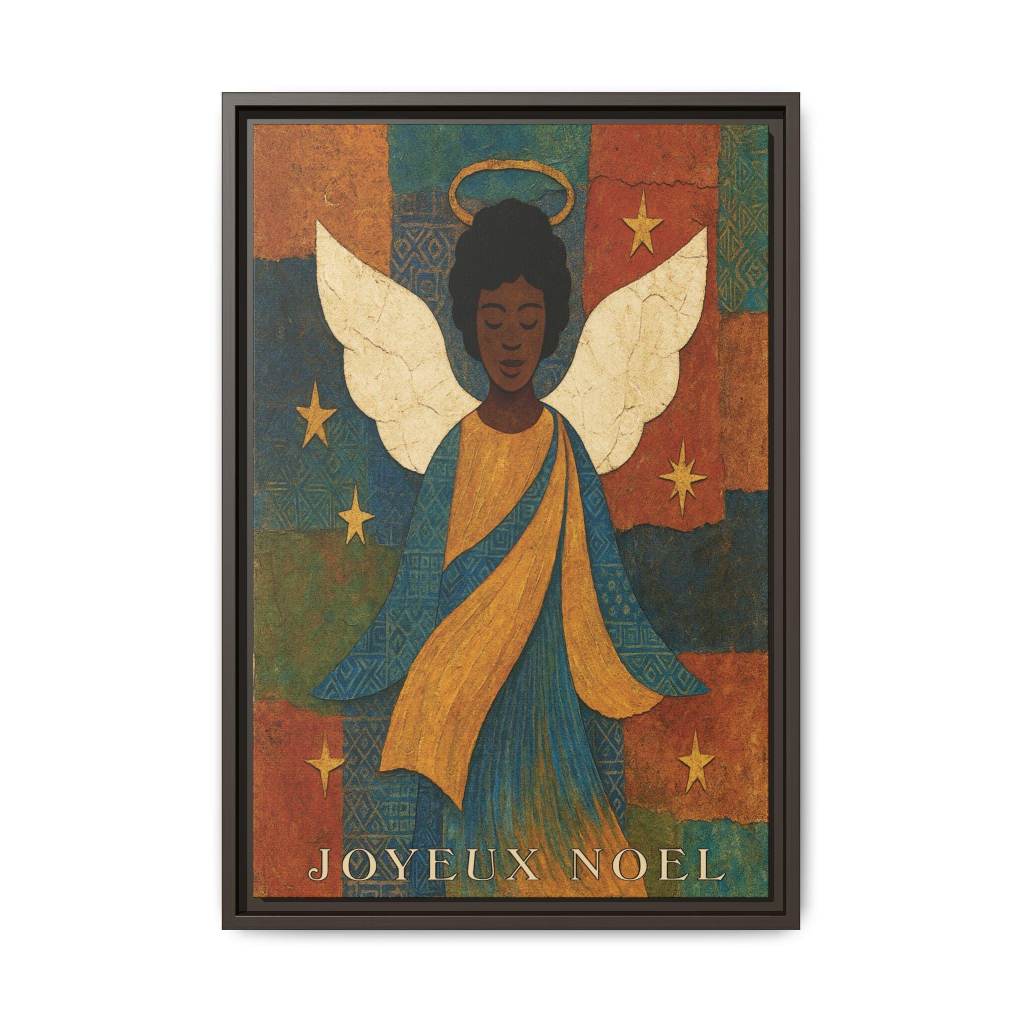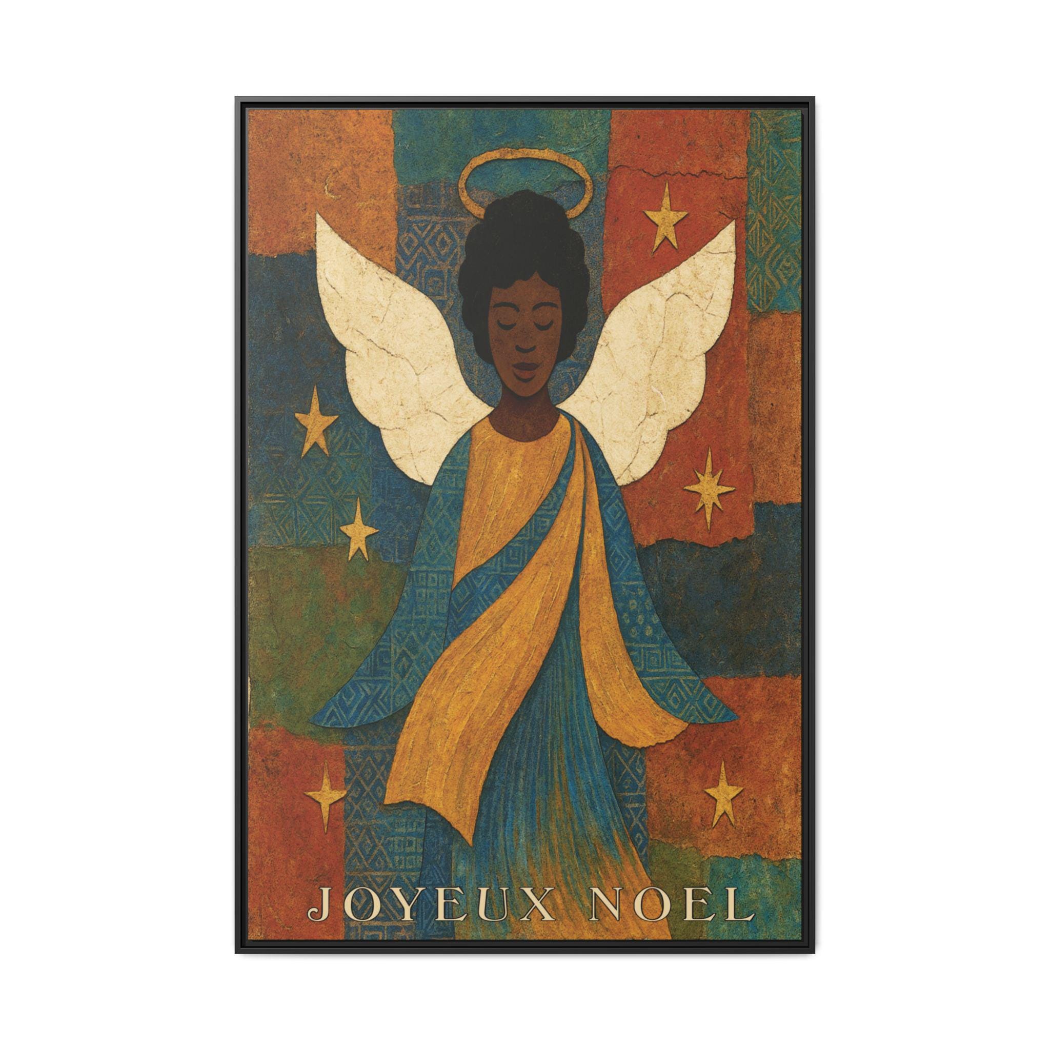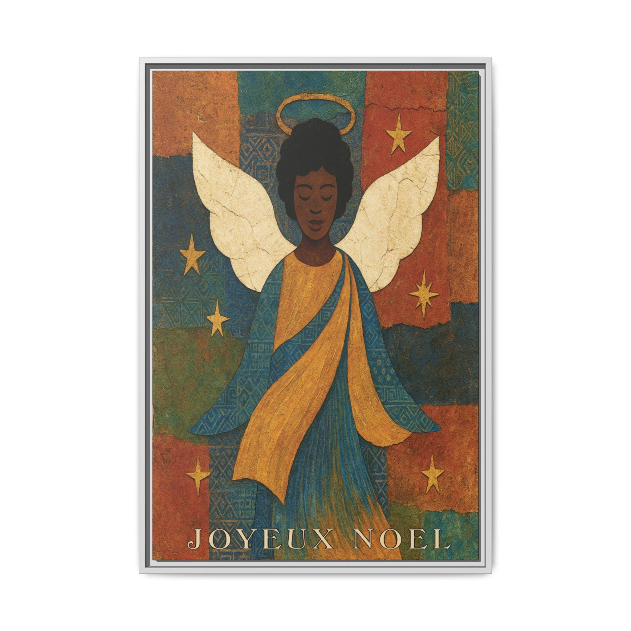 Radiant in warmth and reverence, Joyeux Noël portrays a Black angel bathed in hues of deep blue, gold, and earthen red — a composition that feels both sacred and soulful. The textured surface recalls handmade fresco or quilted tapestry, where each color block carries the echo of history and devotion.