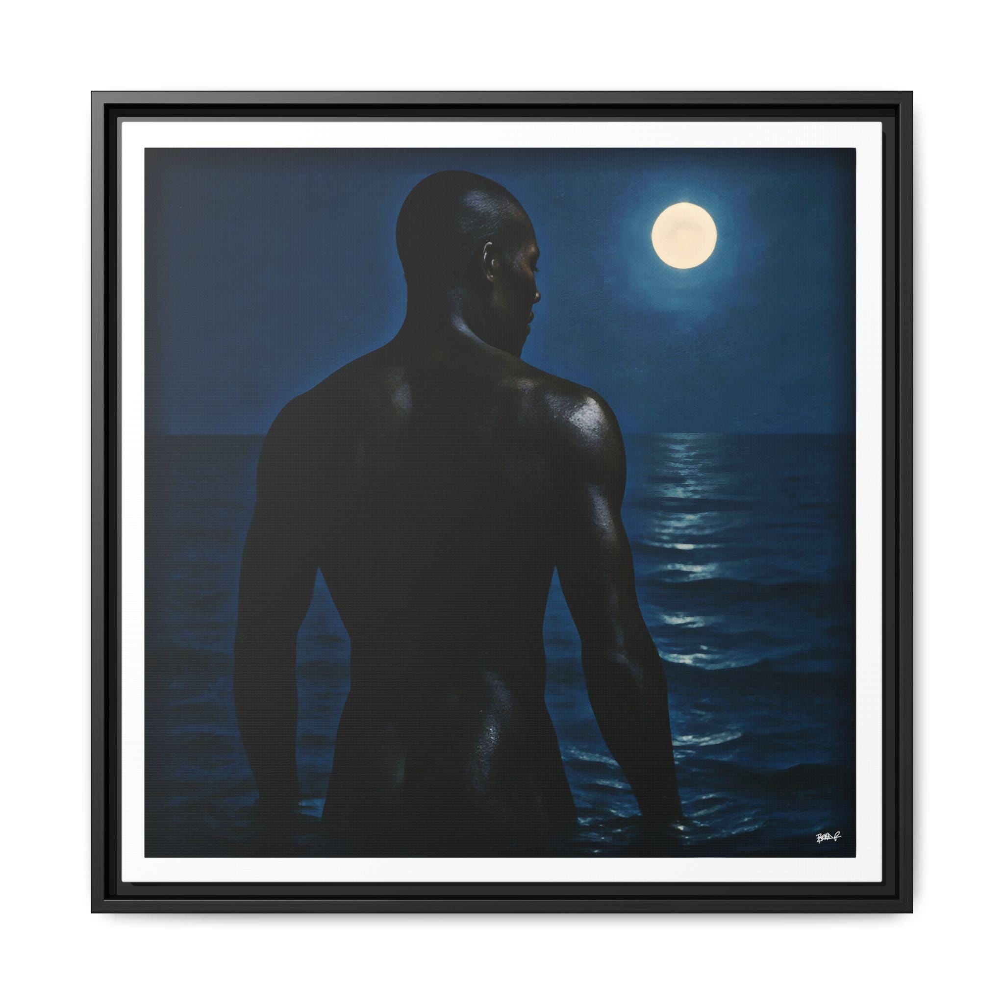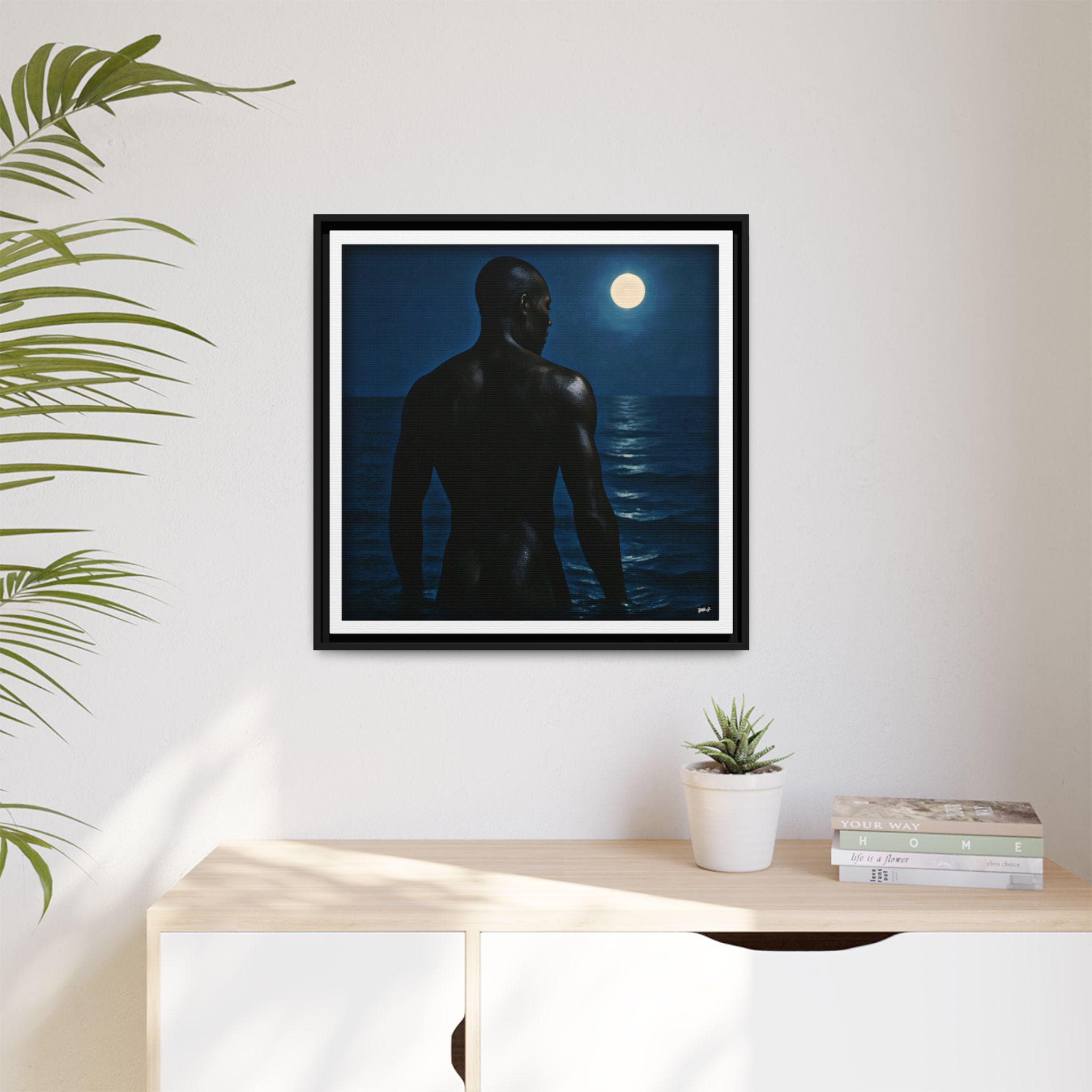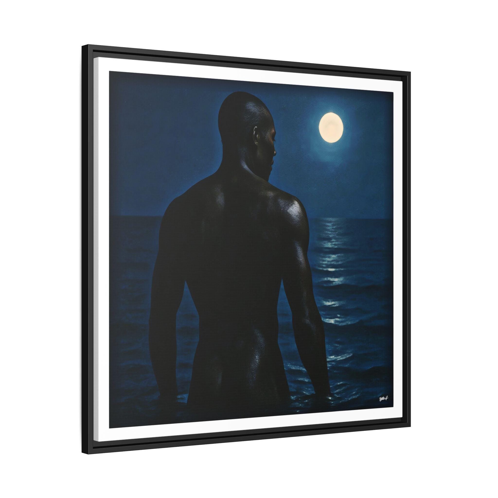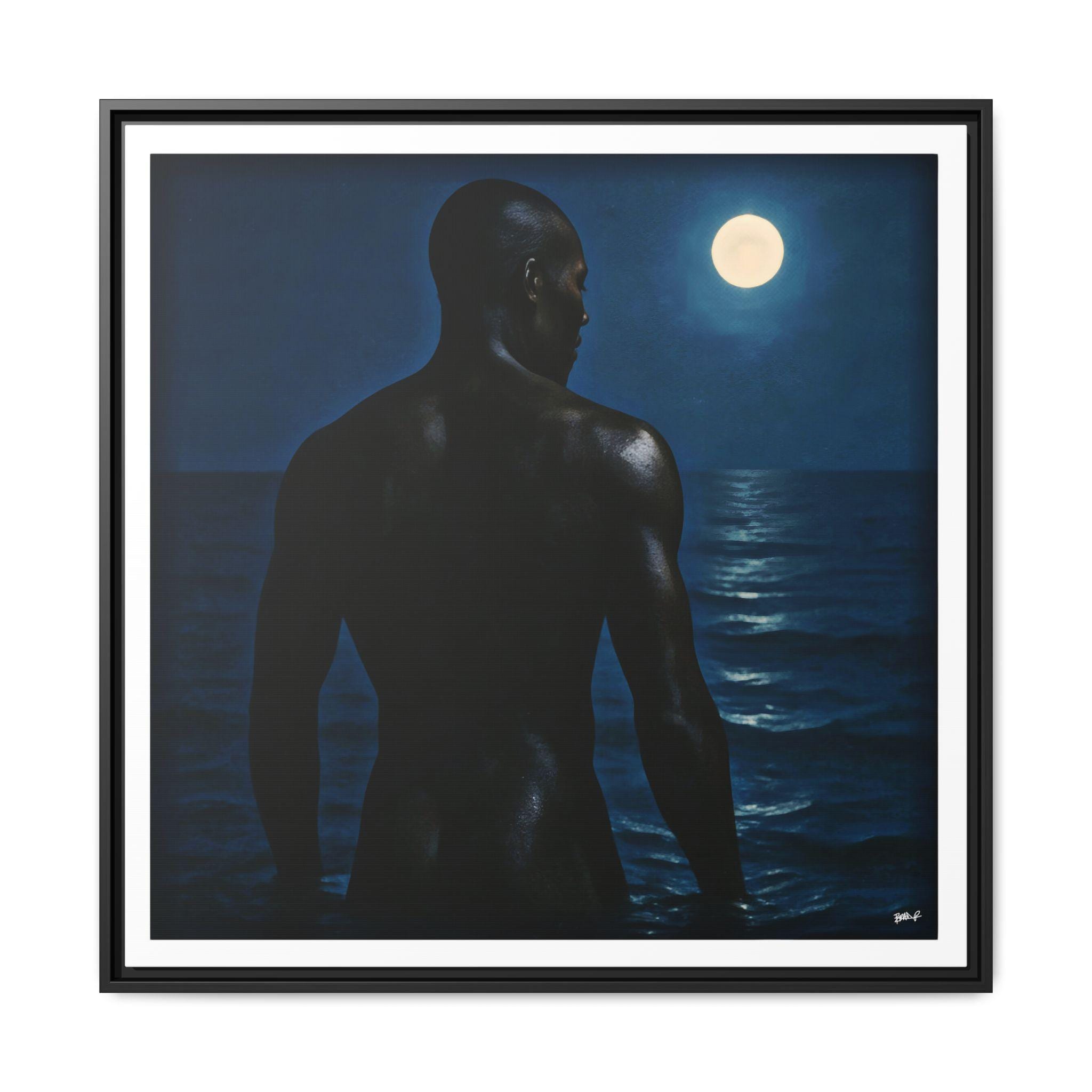 The piece draws from the lineage of Black homoerotic art while resisting spectacle. Instead, the gaze becomes intimate: quiet, lingering, reverent. Every highlight on his skin echoes the moon’s reflection on the waves, blurring the line between flesh and water. In this convergence, the work suggests cleansing, rebirth, longing, and the magnetic pull of queer solitude.