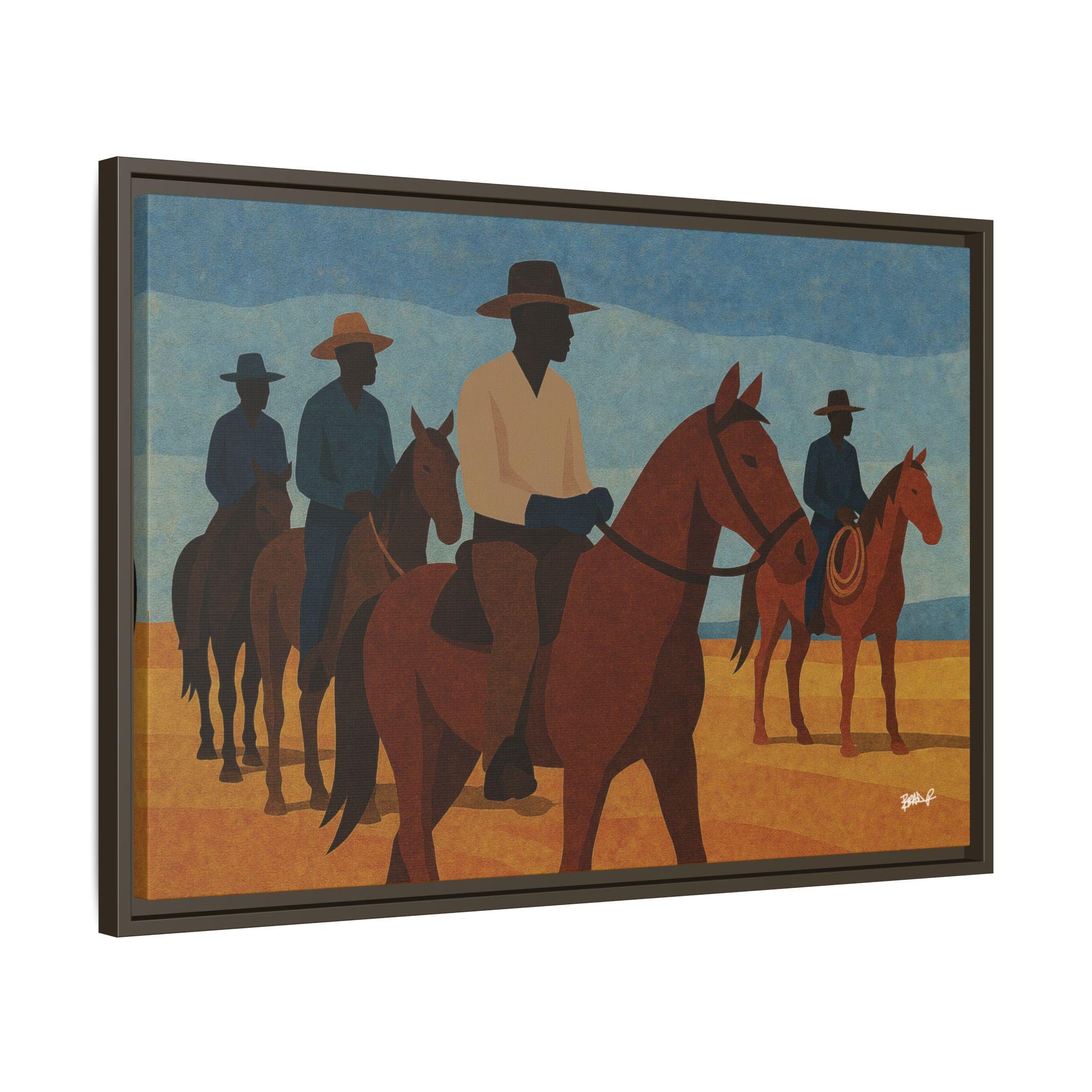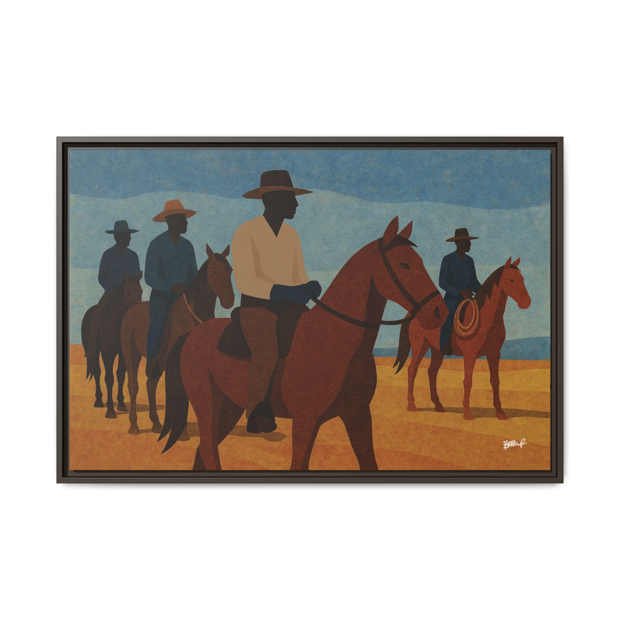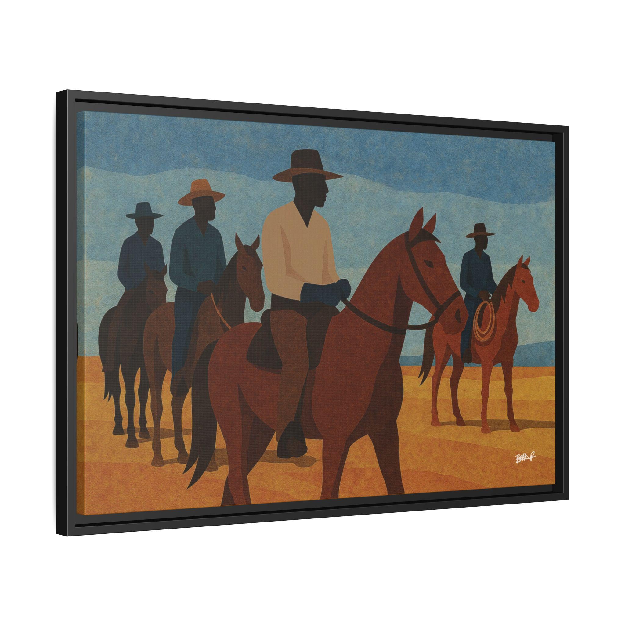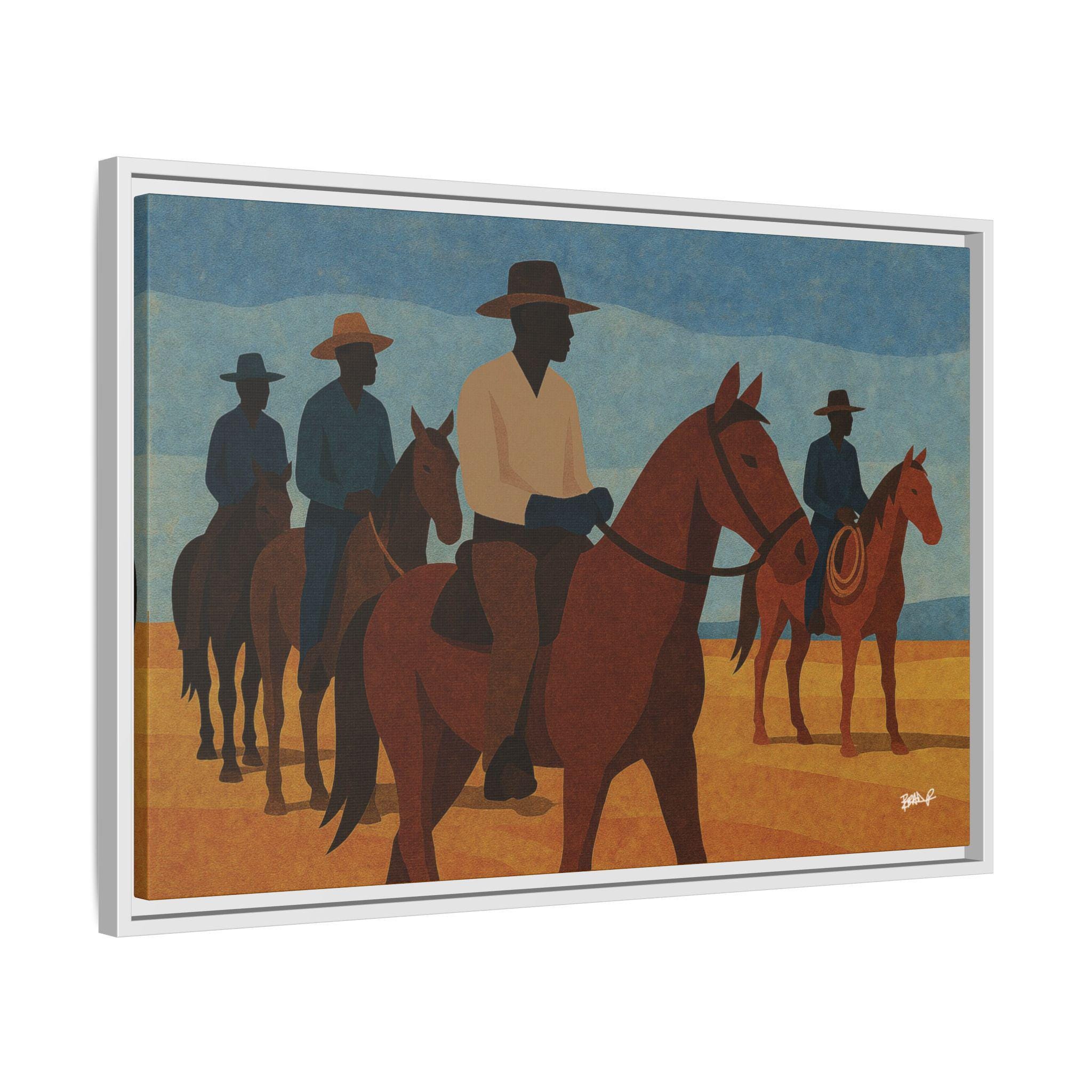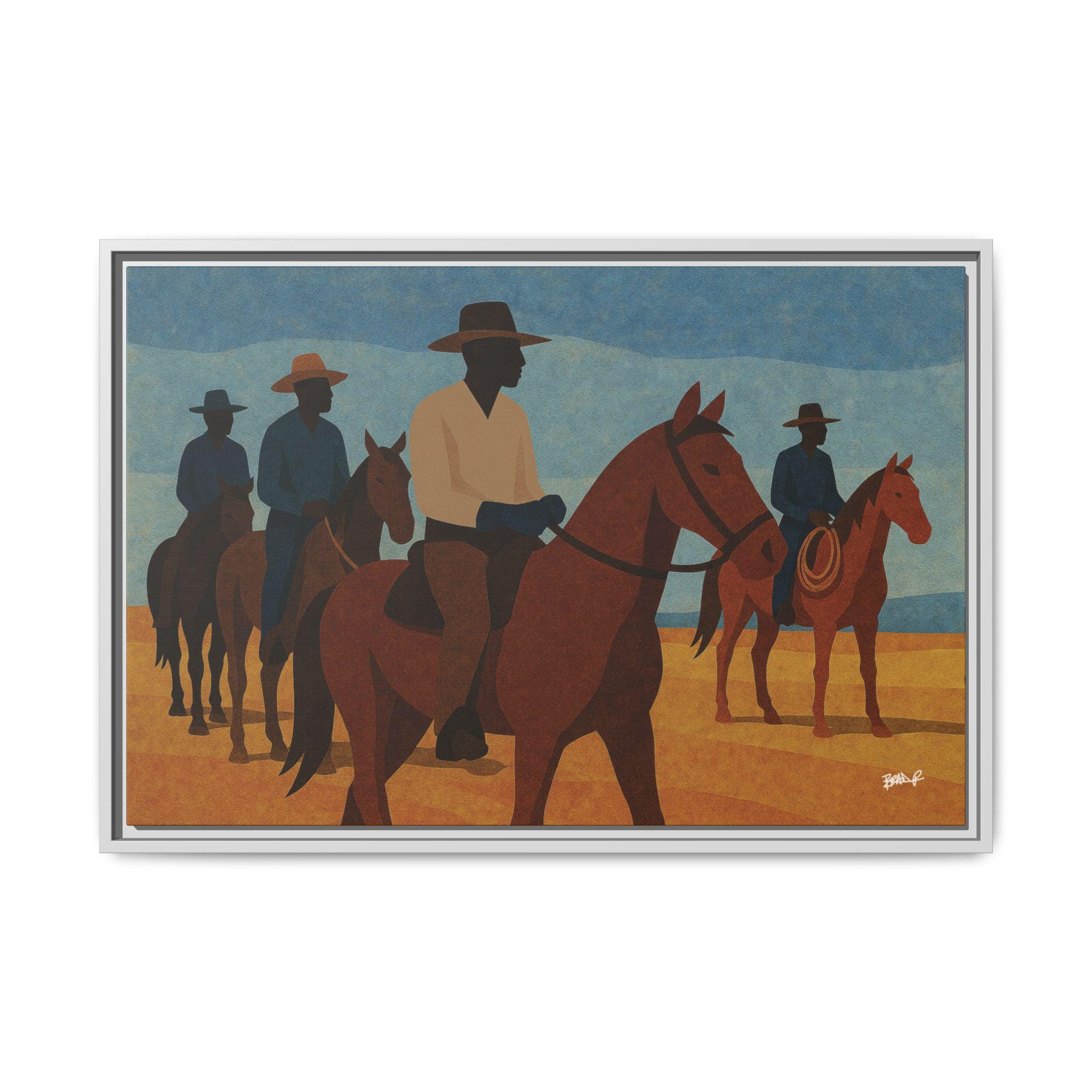 A line of mounted cowboys moves across a sunlit plain, their forms simplified into bold geometric planes. The palette — blues, golds, deep browns — evokes a serene clarity, the quiet moments between journeys. This work foregrounds community and presence: Black riders traveling together, shaping their landscape and claiming space in a history that rarely preserved their likeness. Their silhouettes, strong and confident, assert a narrative long overdue.