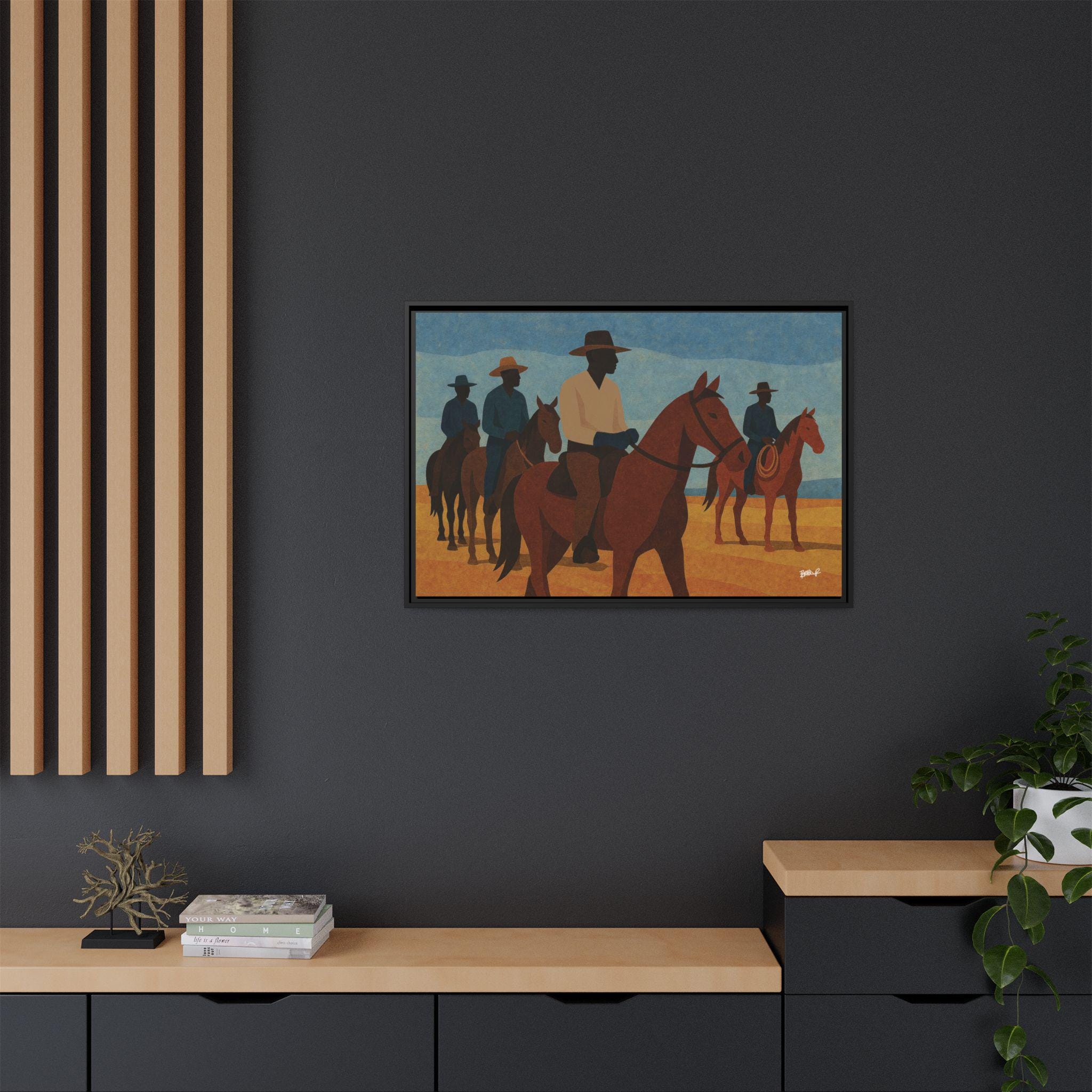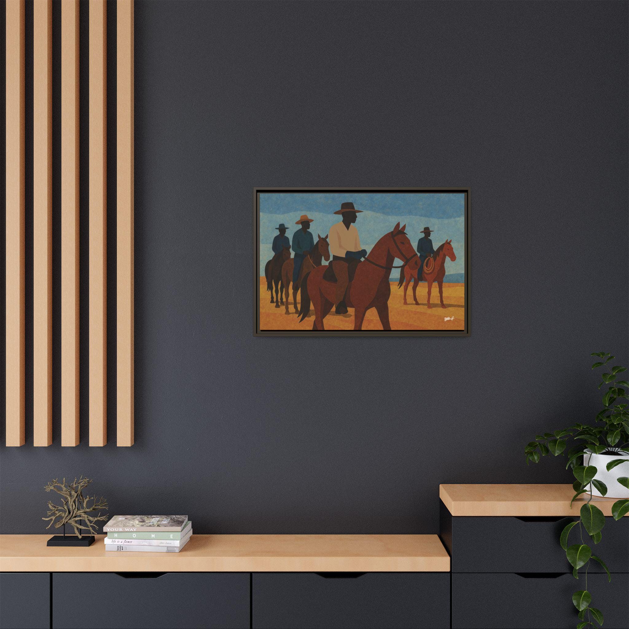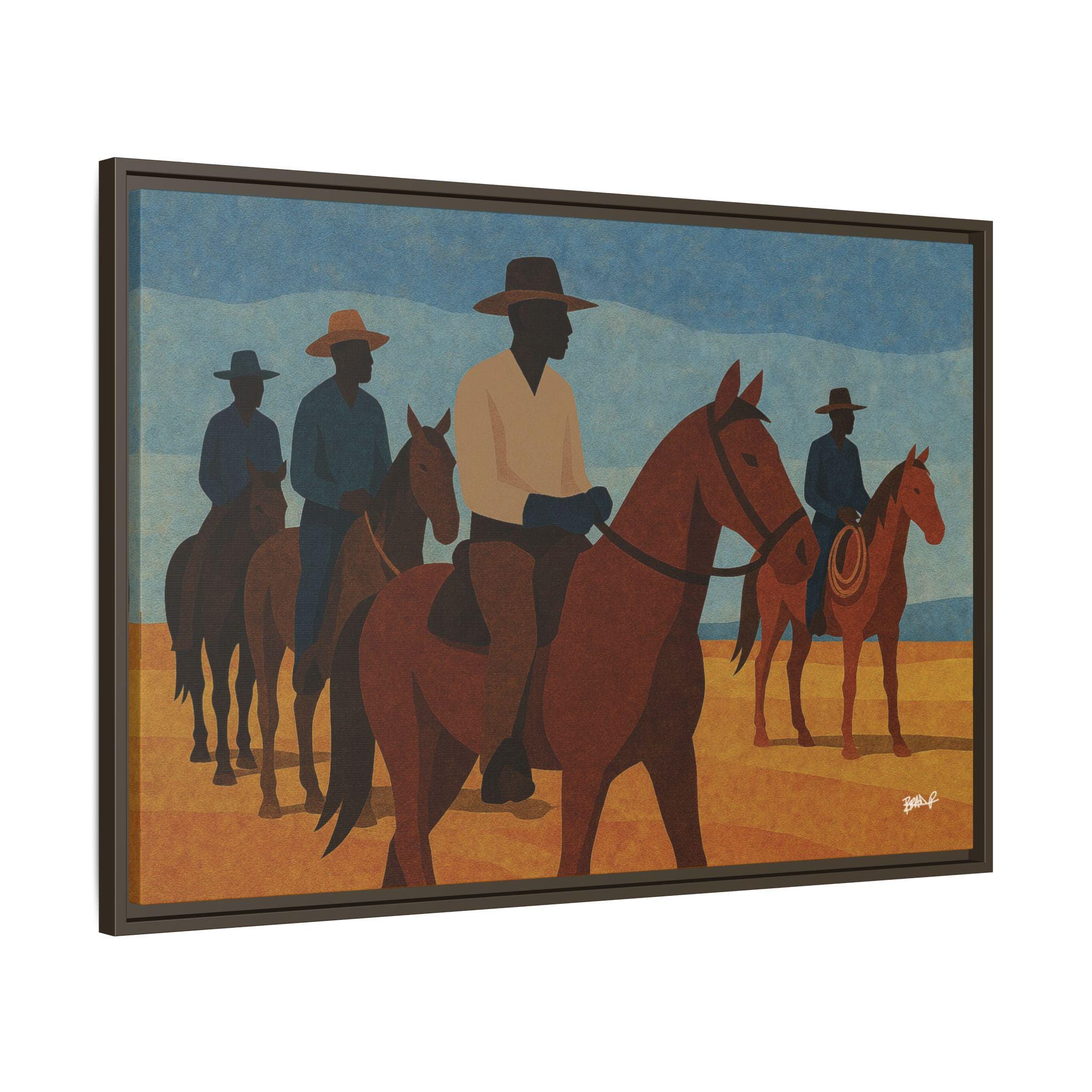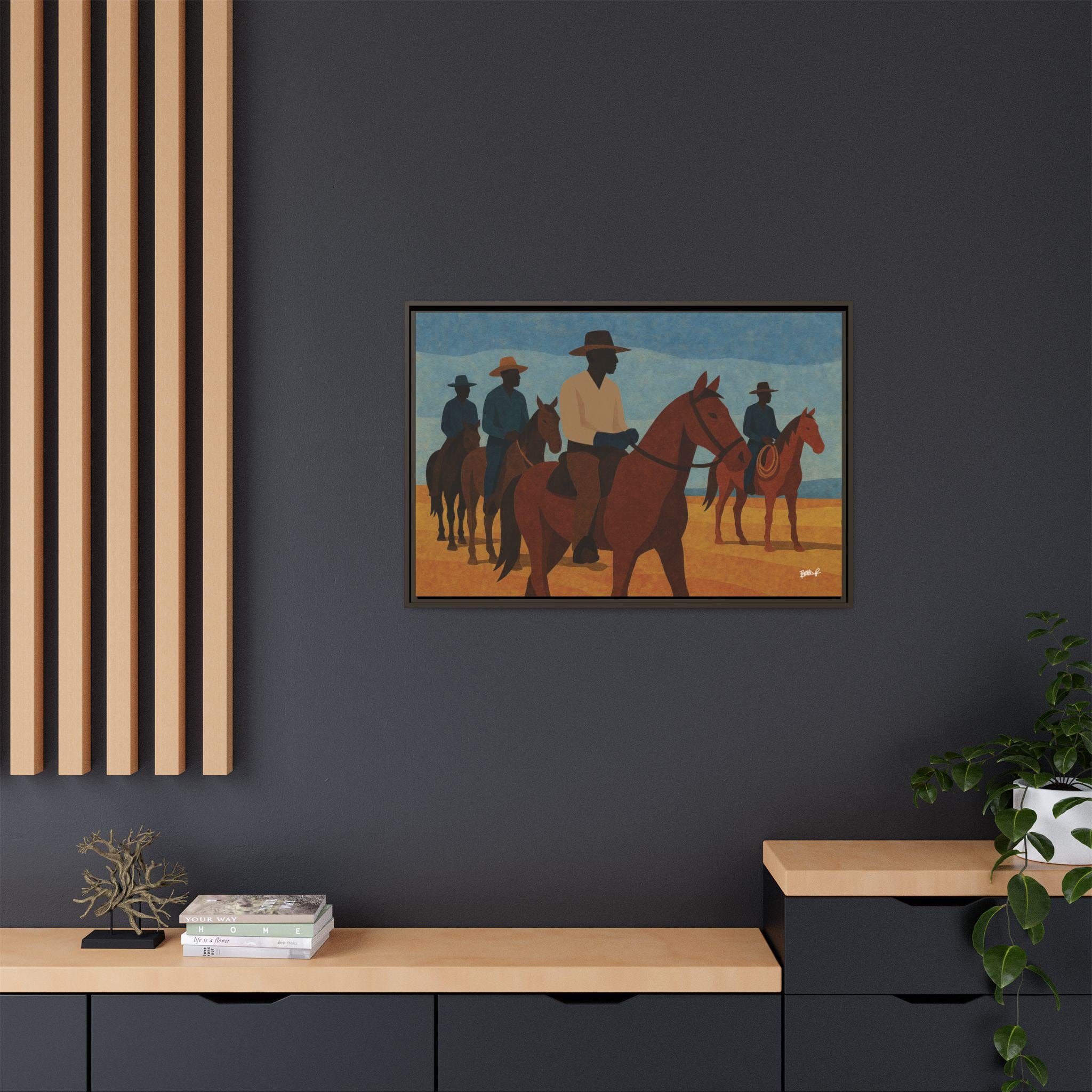 A line of mounted cowboys moves across a sunlit plain, their forms simplified into bold geometric planes. The palette — blues, golds, deep browns — evokes a serene clarity, the quiet moments between journeys. This work foregrounds community and presence: Black riders traveling together, shaping their landscape and claiming space in a history that rarely preserved their likeness. Their silhouettes, strong and confident, assert a narrative long overdue.