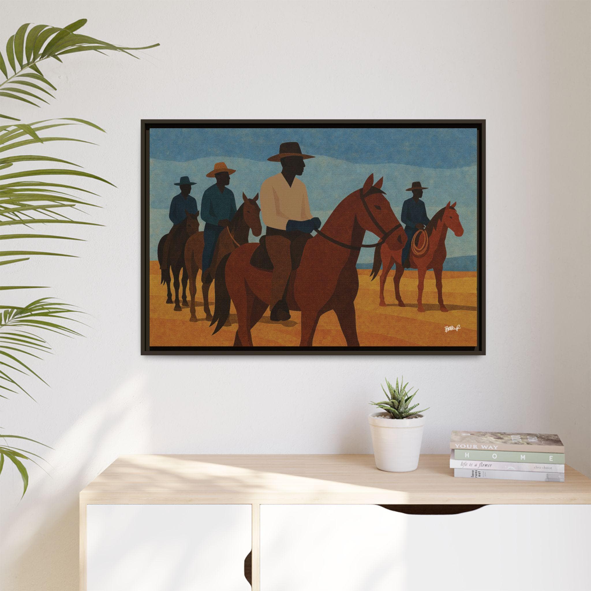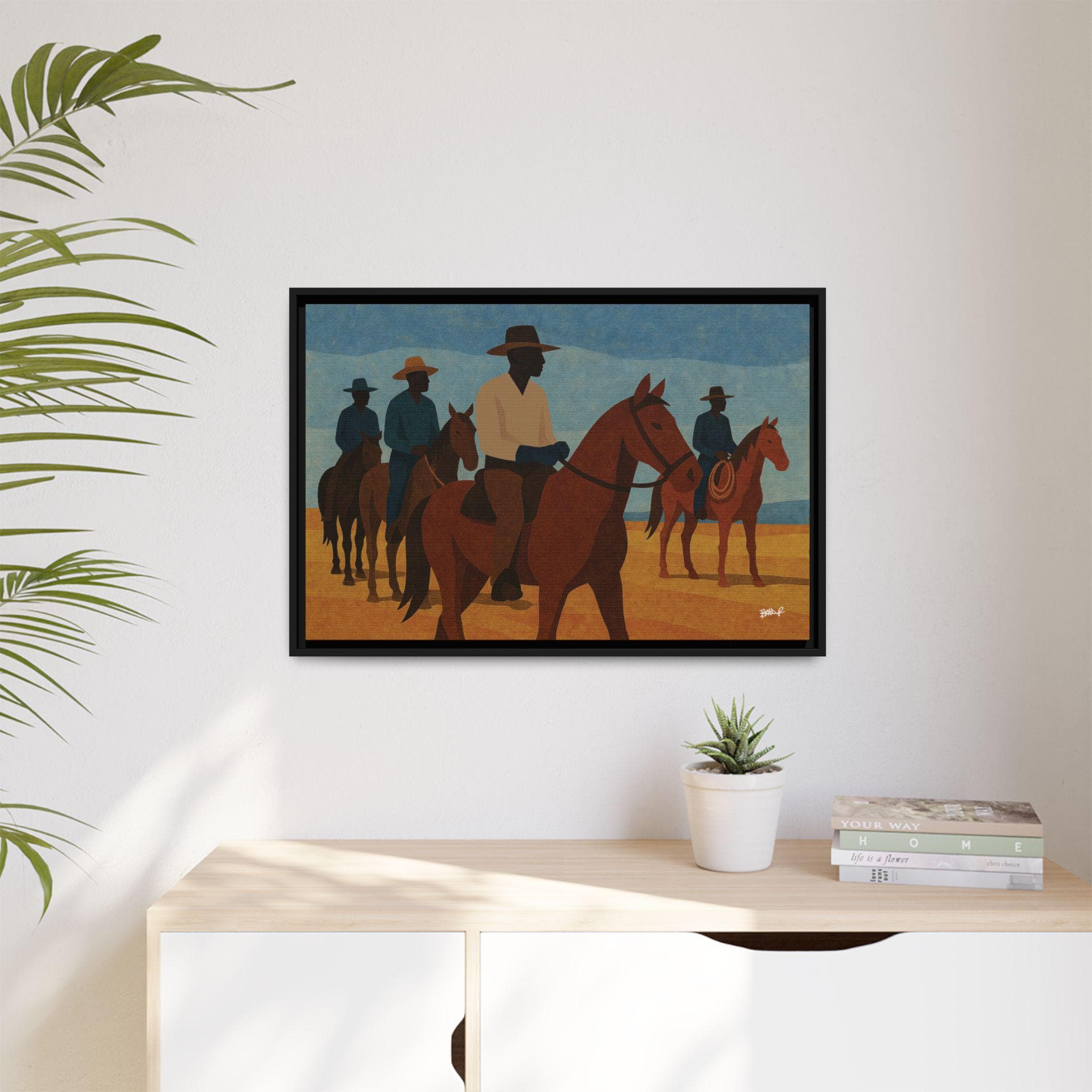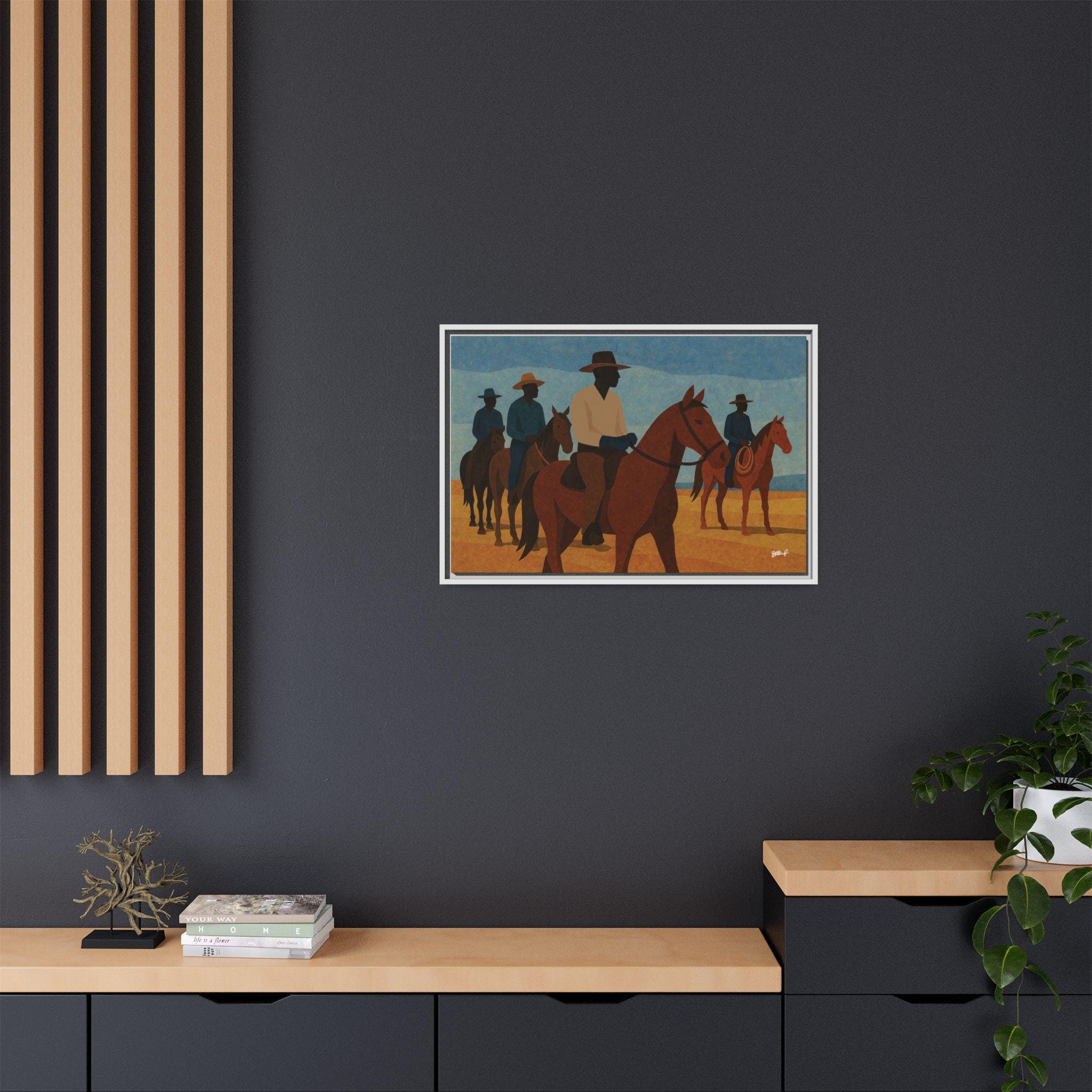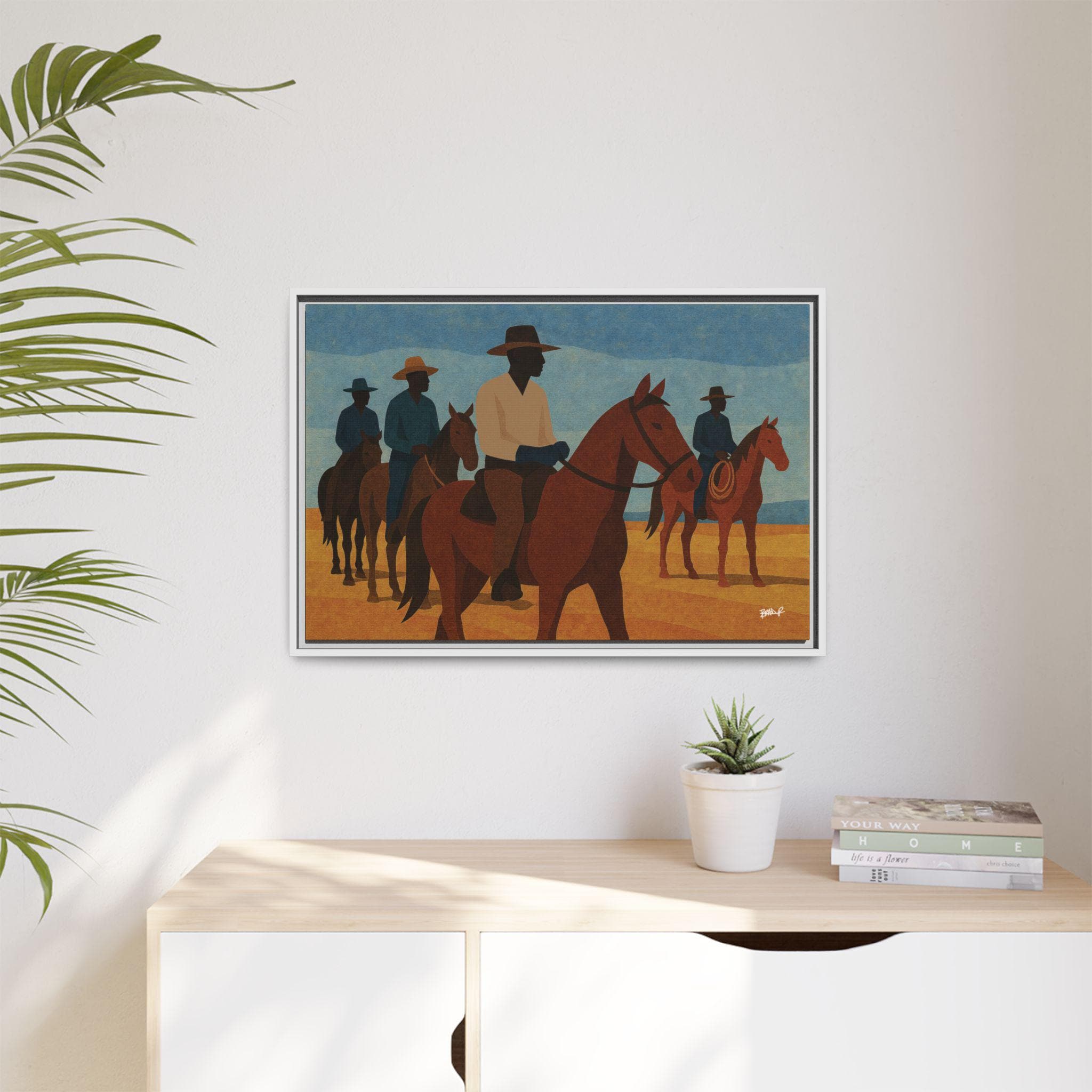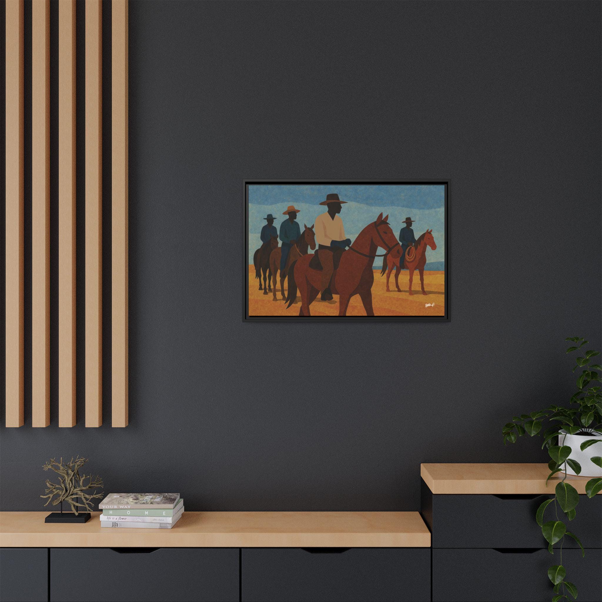 A line of mounted cowboys moves across a sunlit plain, their forms simplified into bold geometric planes. The palette — blues, golds, deep browns — evokes a serene clarity, the quiet moments between journeys. This work foregrounds community and presence: Black riders traveling together, shaping their landscape and claiming space in a history that rarely preserved their likeness. Their silhouettes, strong and confident, assert a narrative long overdue.