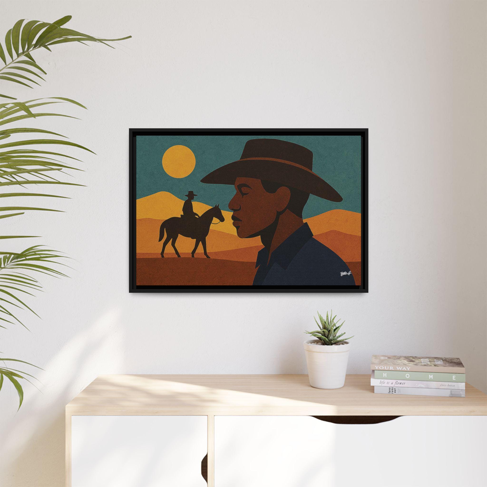 A close-up profile dominates the foreground, carved in warm tones against rolling hills and a rising sun. Behind him, another rider crosses the horizon, linking individual identity to a collective legacy. The composition echoes Aaron Douglas’s iconic use of layered distance and symbolic silhouettes, suggesting memory, ancestry, and unbroken lineage. It’s both introspective and expansive — a portrait of a people whose stories stretch as wide as the plains themselves.