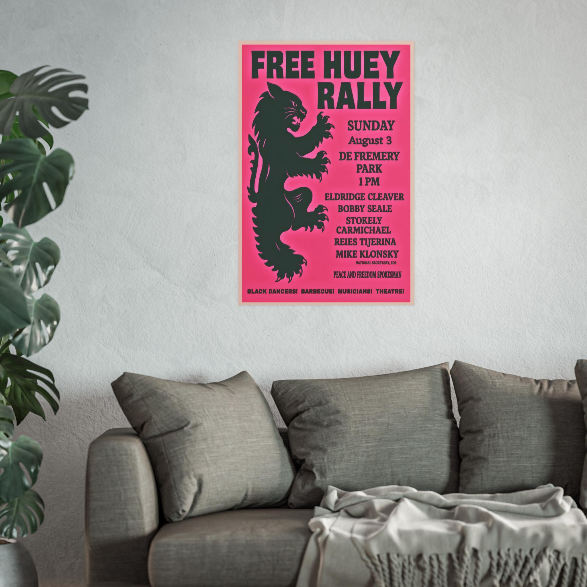 This digital poster channels the graphic urgency of late-1960s political print culture, announcing the Free Huey rally as both protest and public gathering. Dominated by bold typography and a silhouetted panther in motion, the composition transforms political resistance into visual force—direct, confrontational, and impossible to ignore.