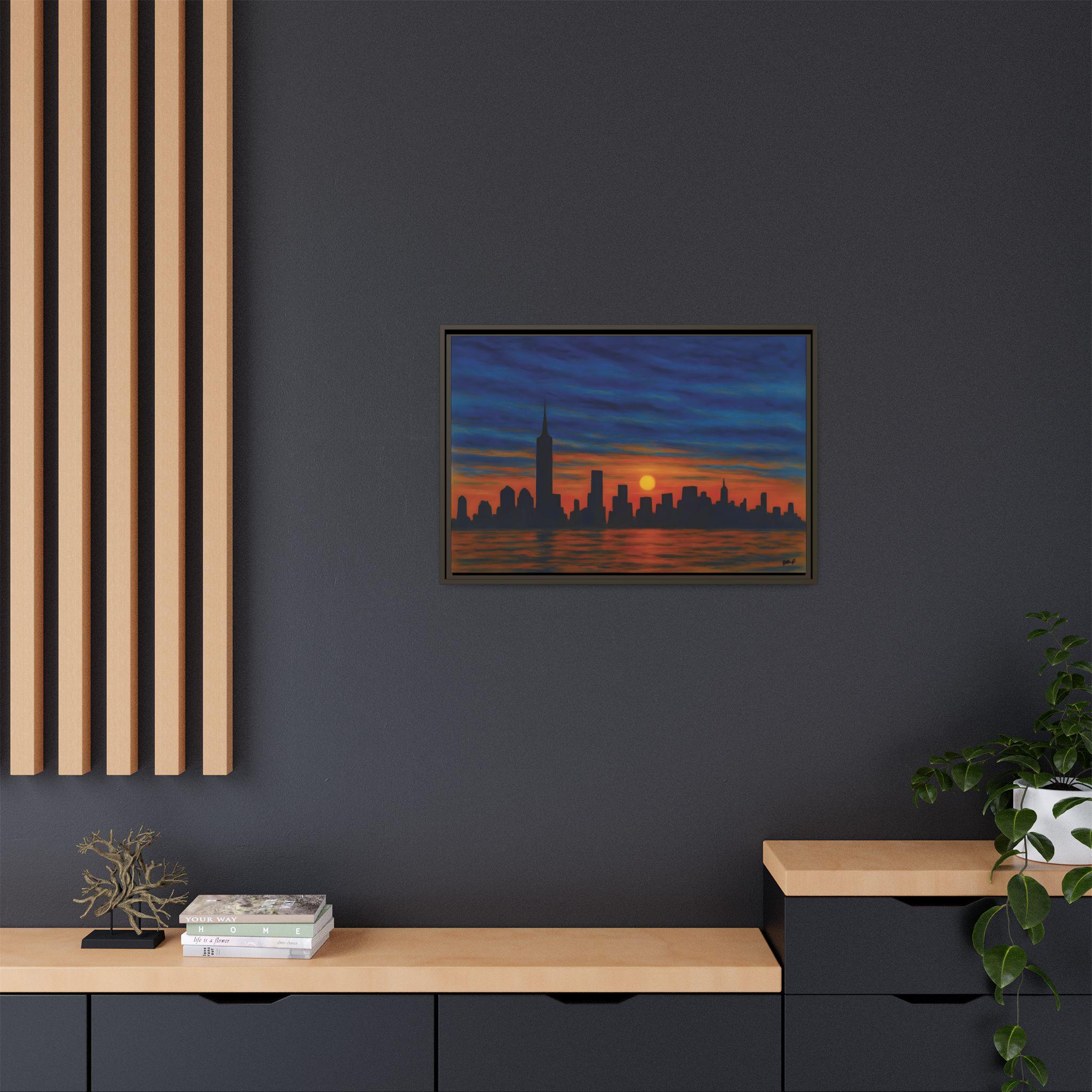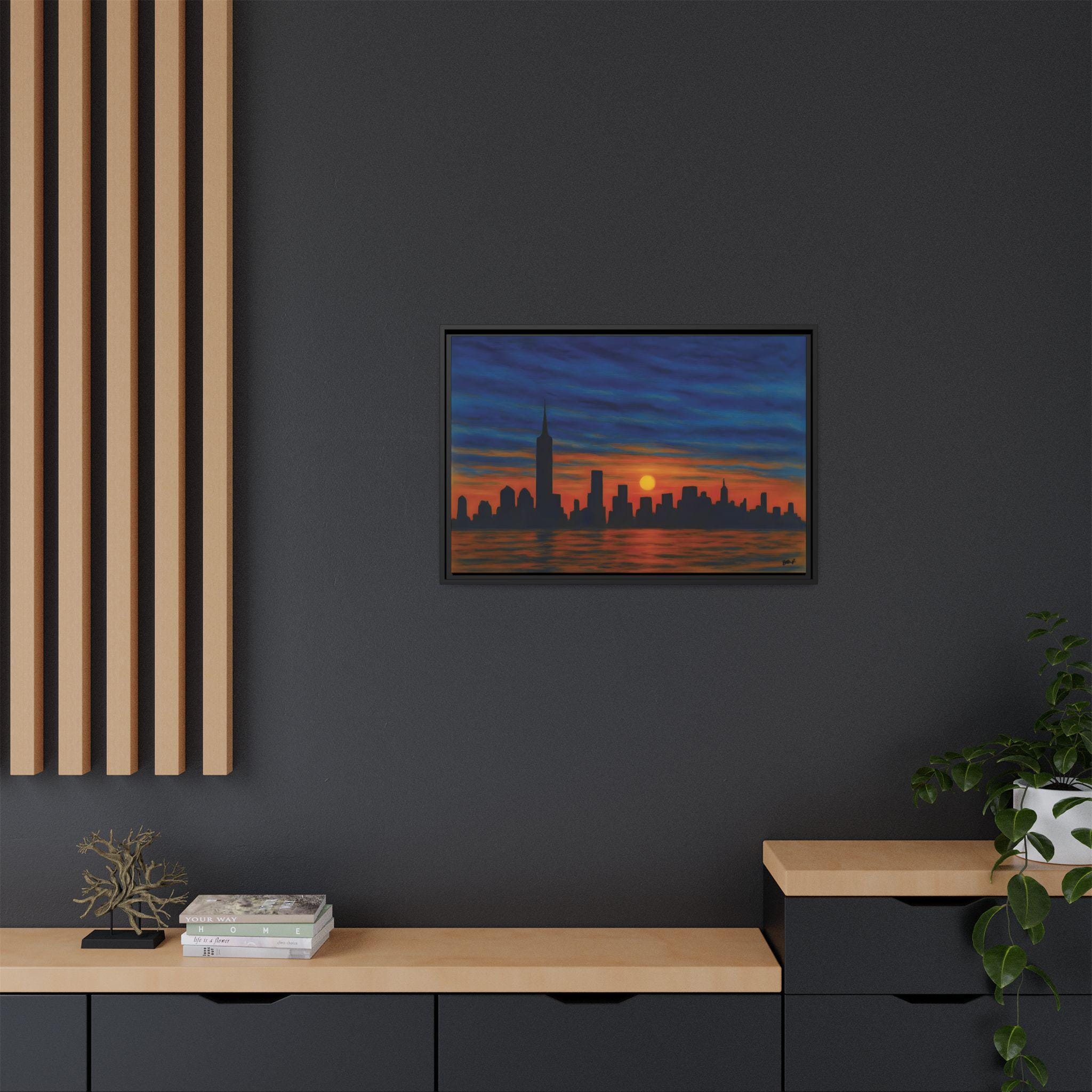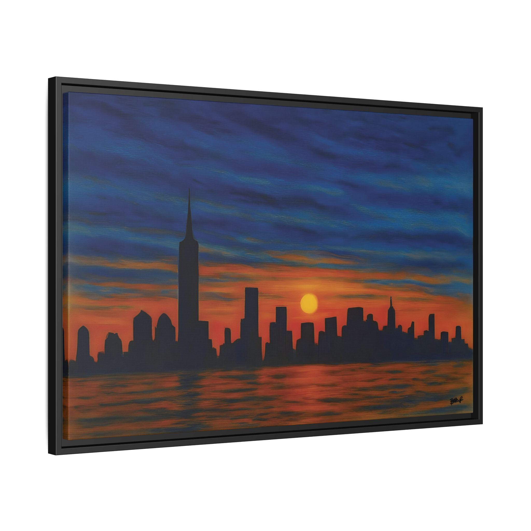 Blue Hour, New York captures the city in a rare moment of calm—when the day releases its grip and the skyline settles into stillness. Rendered in deep blues and warm amber tones, this painterly interpretation of New York City evokes the quiet transition between sunset and night.