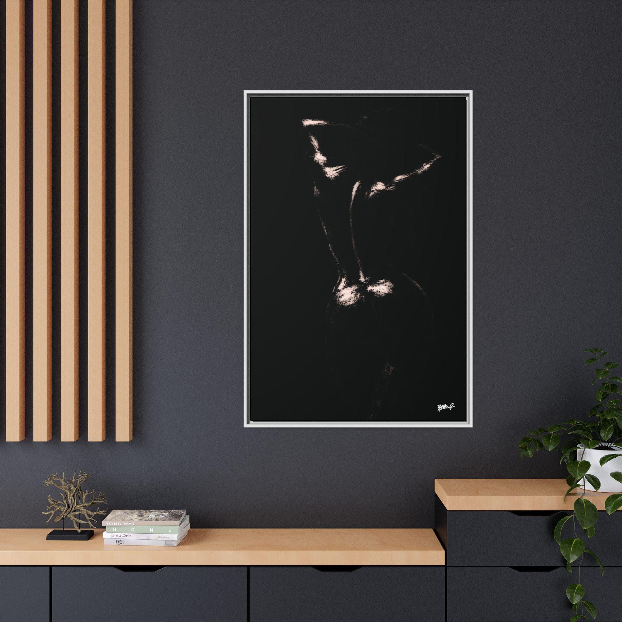 "Contour" is a study in restraint—where form emerges through light rather than outline. The body is suggested, not declared, shaped by highlights that trace presence without spectacle. Against a field of deep black, the figure exists in quiet authority, neither hidden nor exposed, but held in balance. Framed in white, the work invites stillness, asking the viewer to slow down and see what remains when excess is removed.