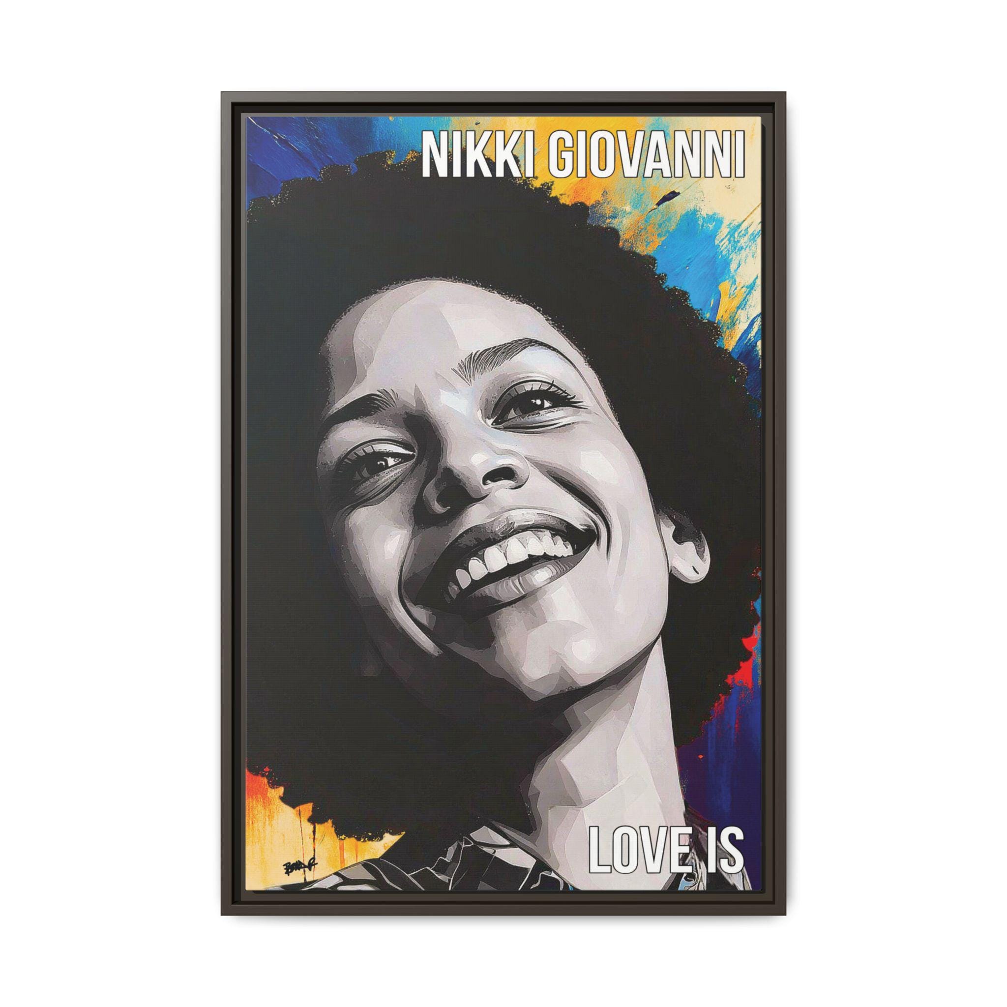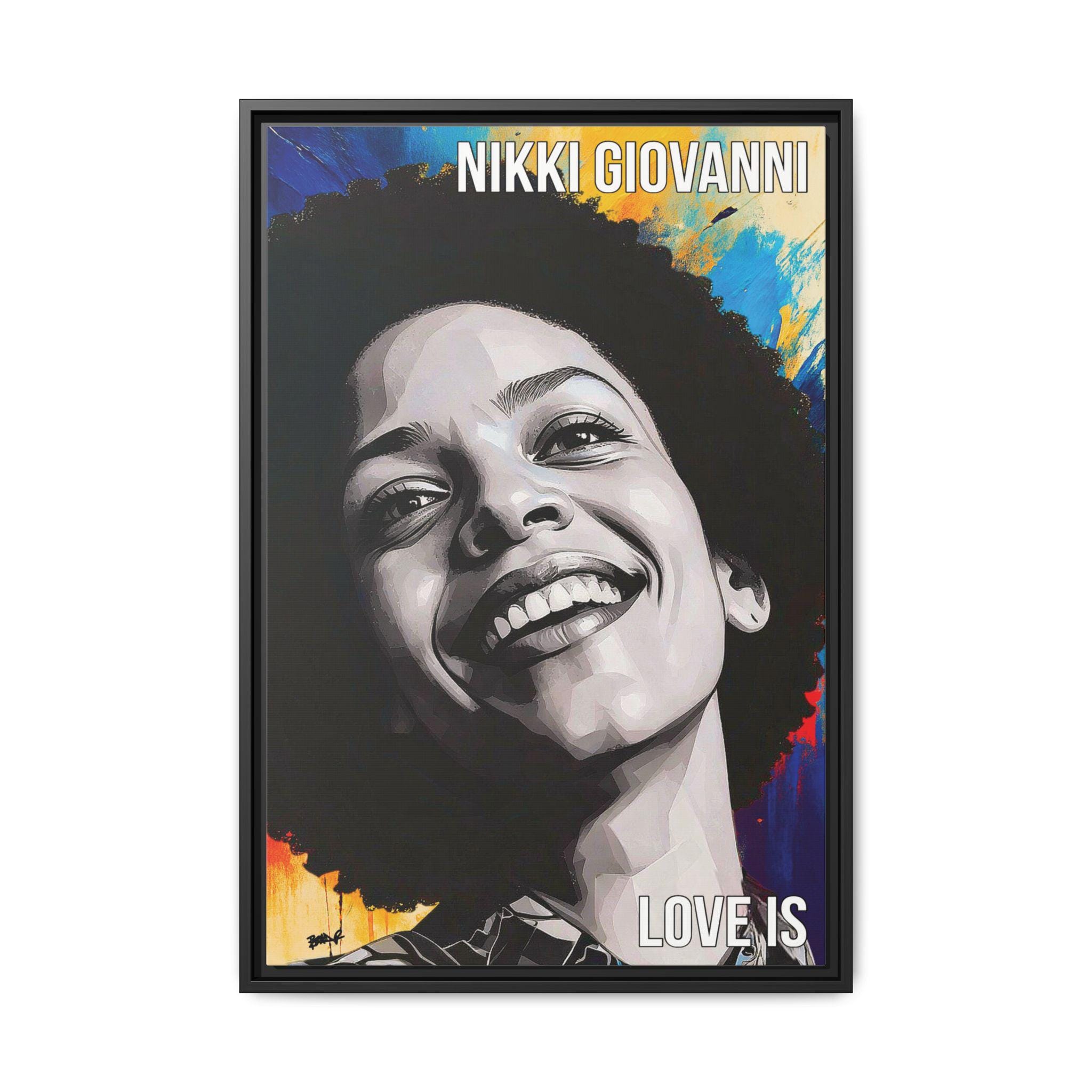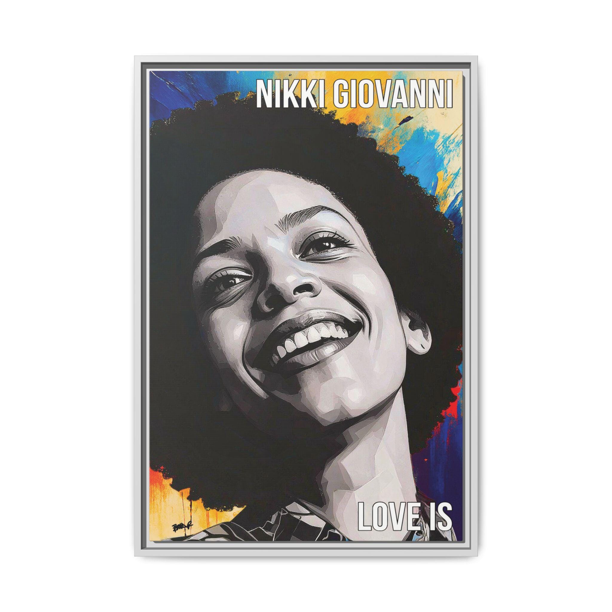 "Nikki’s Sunburst Smile" captures poet Nikki Giovanni as both presence and force, joy rendered with gravity. Her face, sculpted in bold grayscale planes, emerges against a radiant field of color, as if light itself is responding to her expression. The contrast between the restrained portrait and the energetic background mirrors Giovanni’s legacy: clarity of voice paired with emotional expansiveness.
