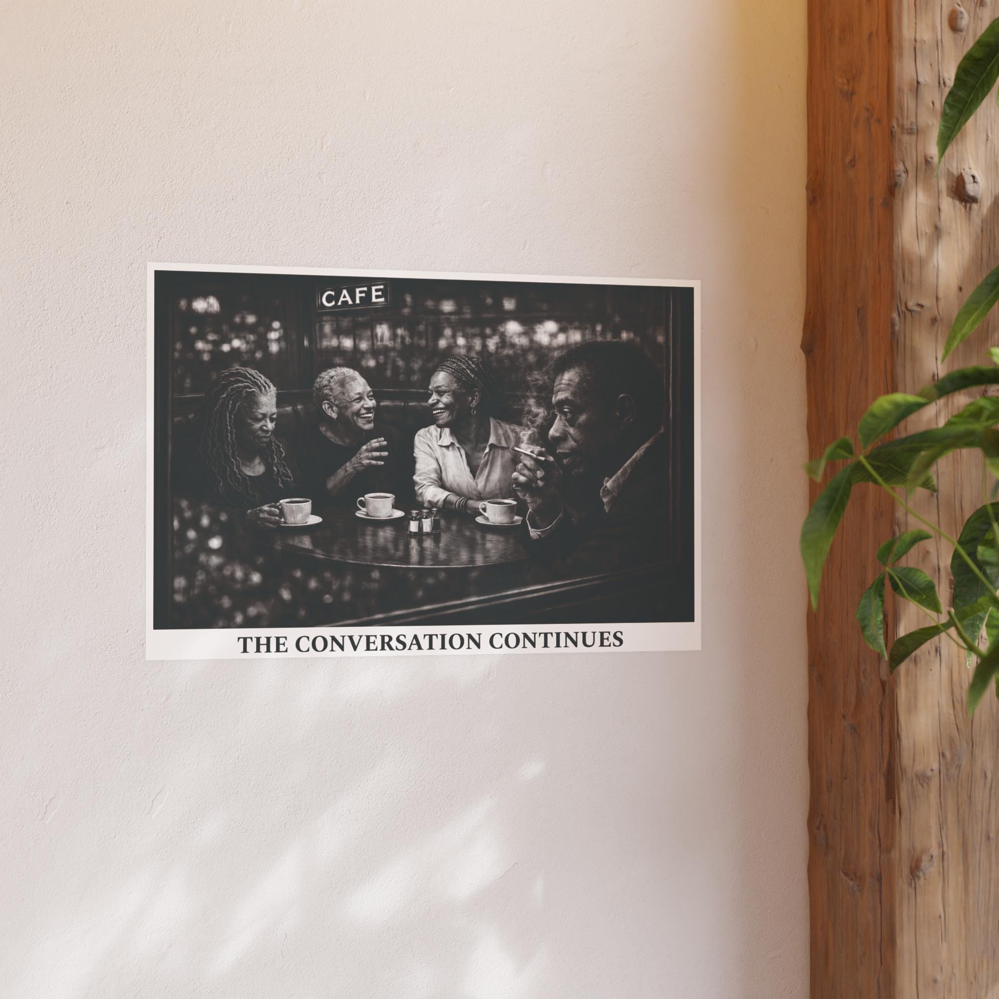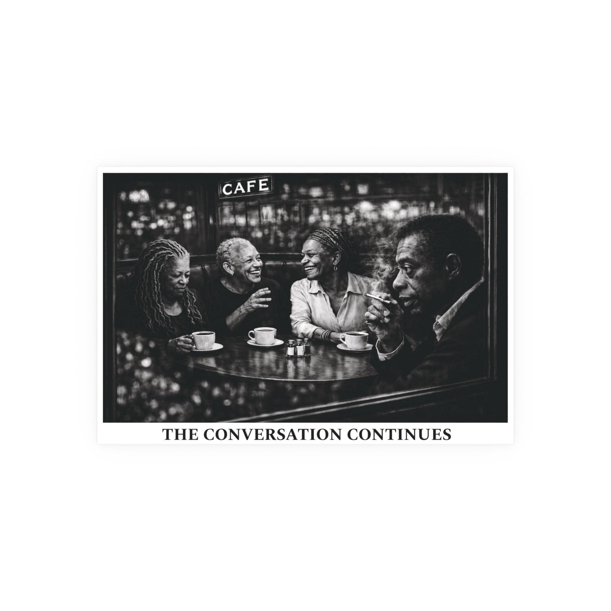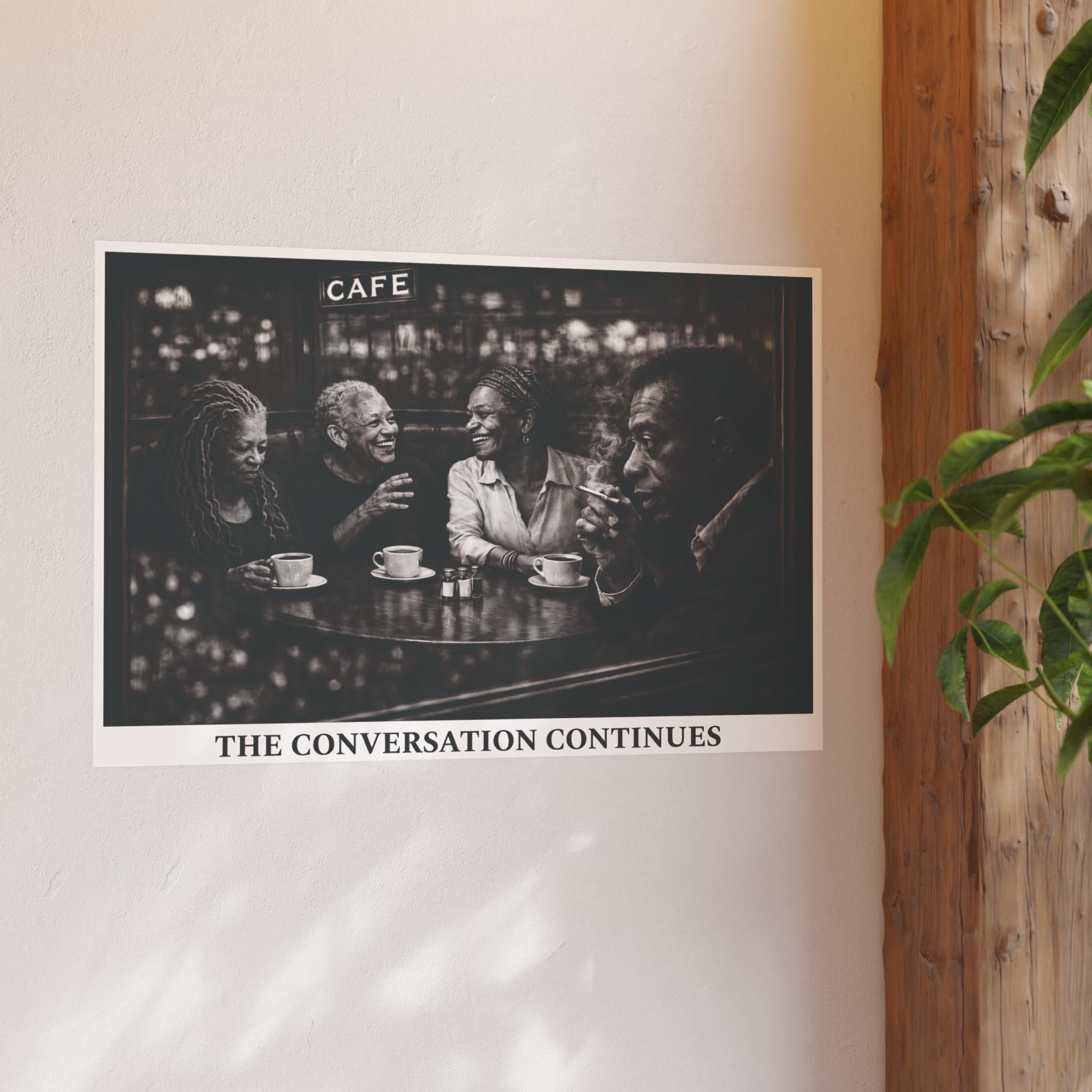 The Conversation Continues is a black-and-white fine art print featuring Toni Morrison, Nikki Giovanni, Maya Angelou, and James Baldwin gathered in a café, mid-conversation. Viewed through a window, the scene invites the viewer to witness an intimate moment of laughter, listening, and shared thought.