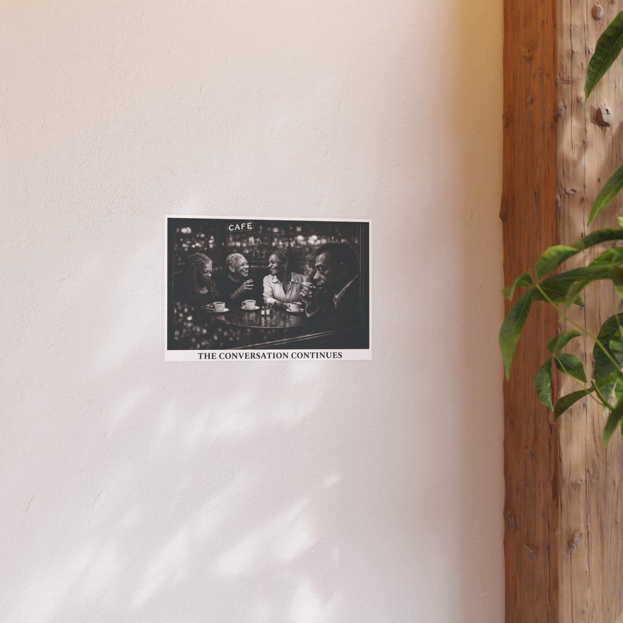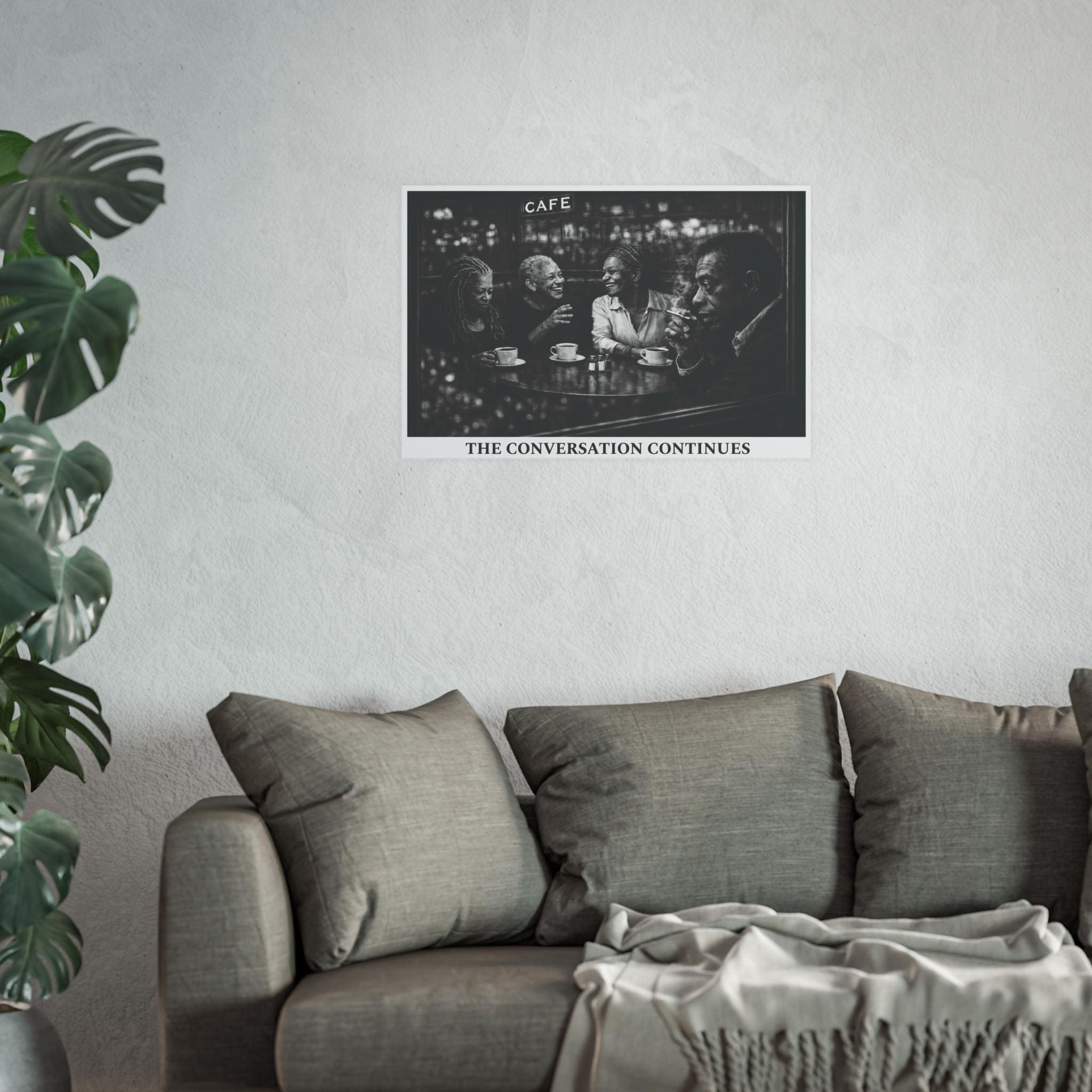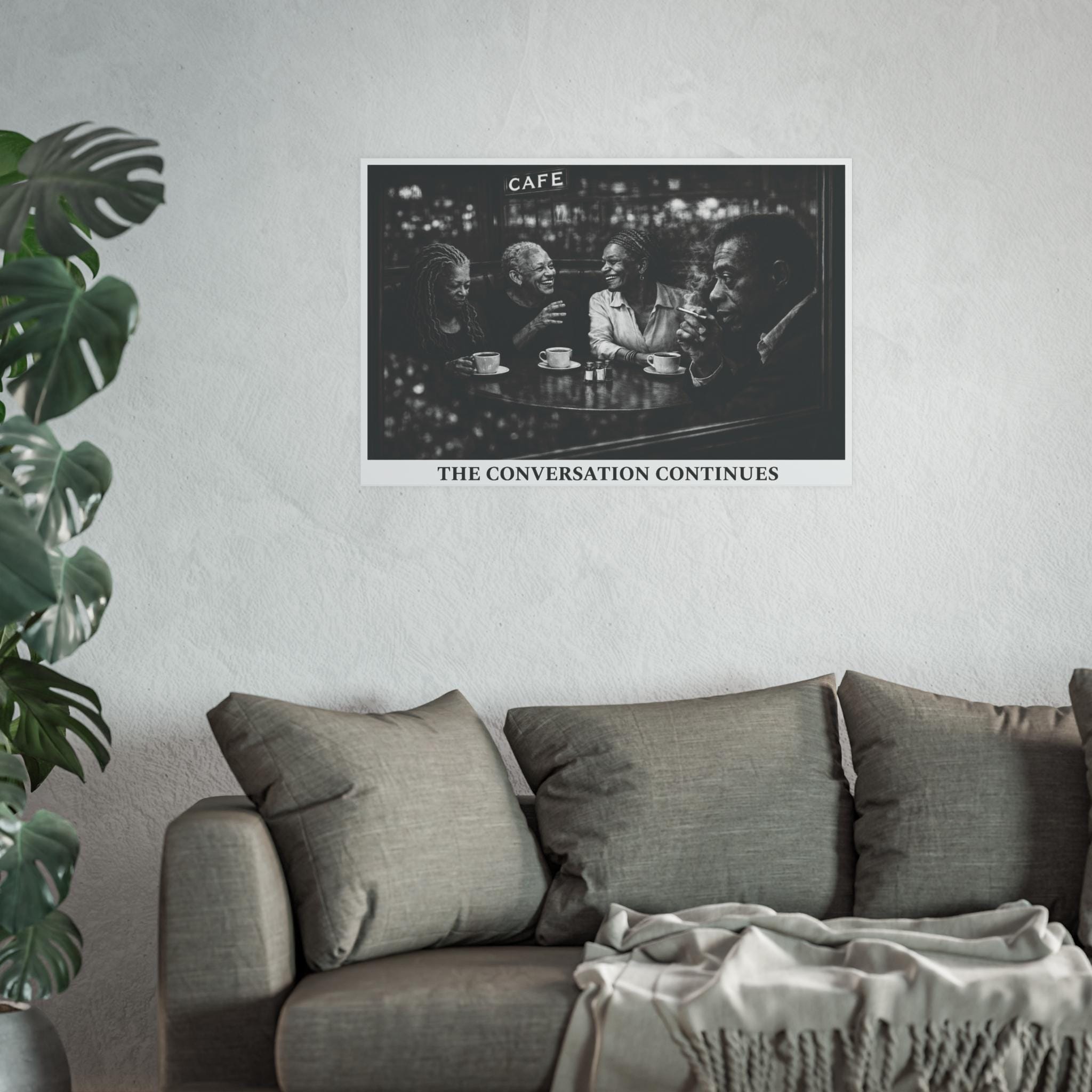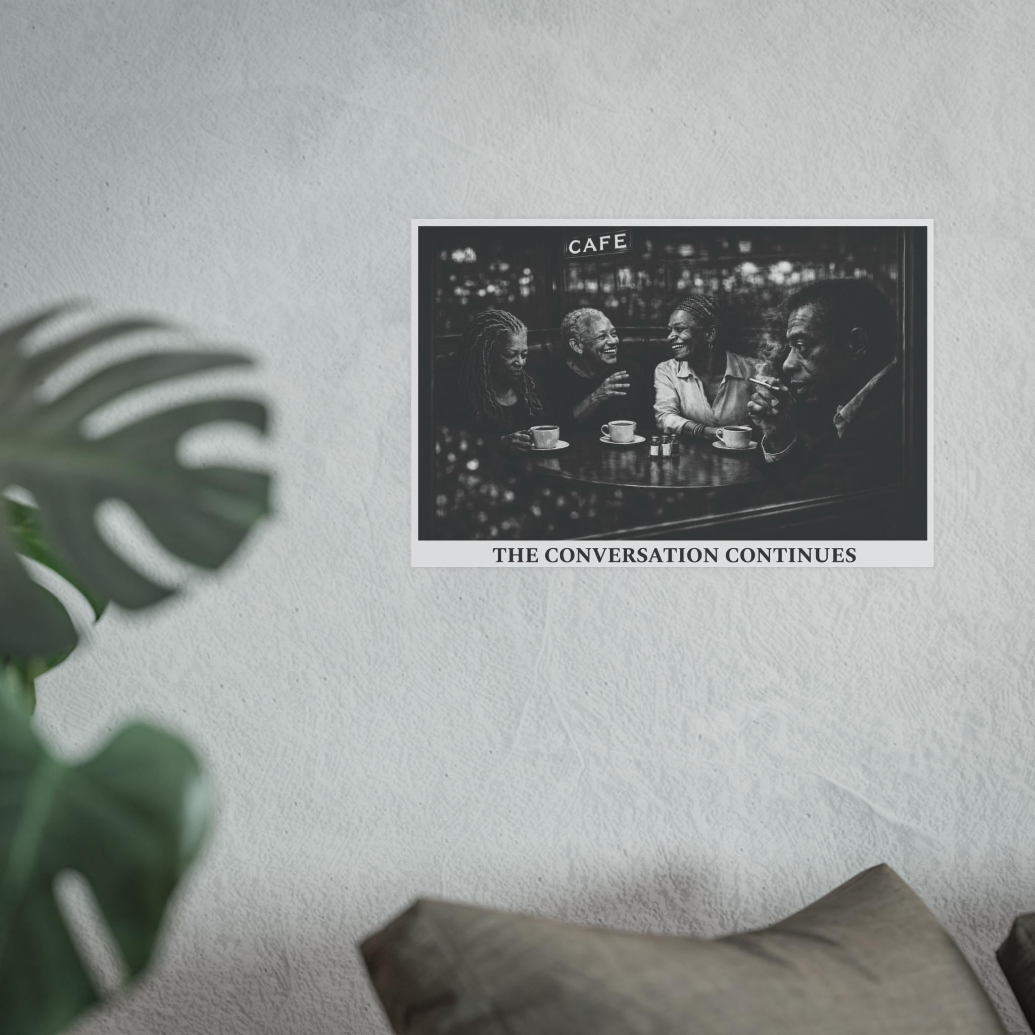 The Conversation Continues is a black-and-white fine art print featuring Toni Morrison, Nikki Giovanni, Maya Angelou, and James Baldwin gathered in a café, mid-conversation. Viewed through a window, the scene invites the viewer to witness an intimate moment of laughter, listening, and shared thought.