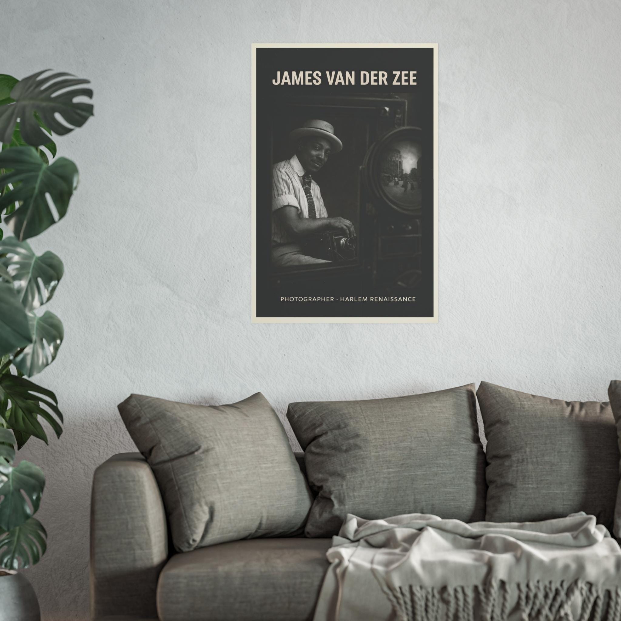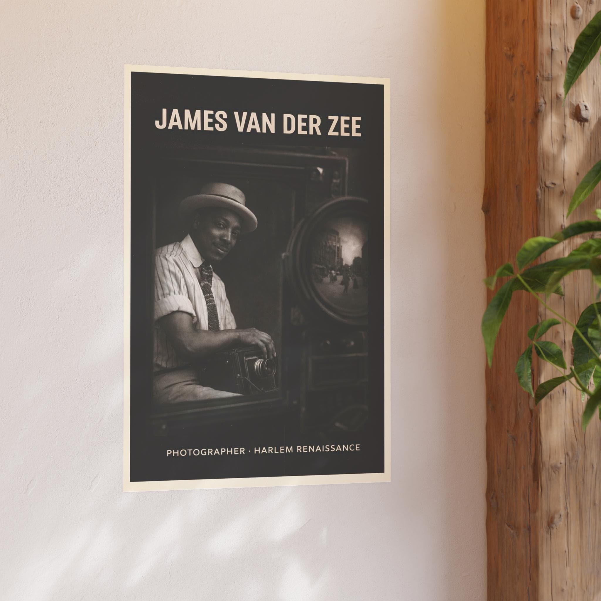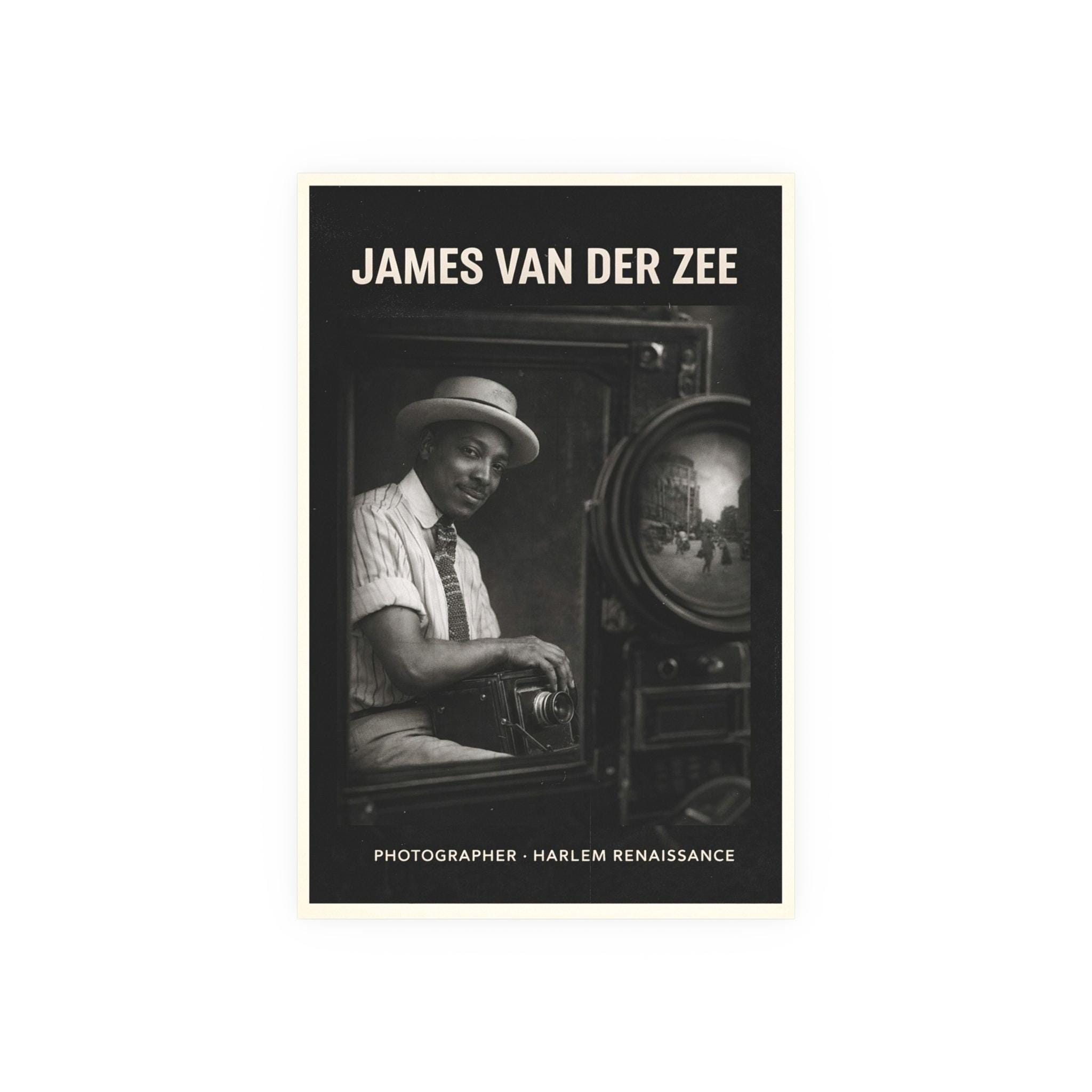 This poster honors James Van Der Zee, the master photographer who shaped how Black life was seen, remembered, and preserved during the Harlem Renaissance. Framed through the lens of his own camera, Van Der Zee appears not only as an artist but as an architect of memory—documenting elegance, intimacy, ambition, and everyday Black excellence at a time when such images were rarely centered.