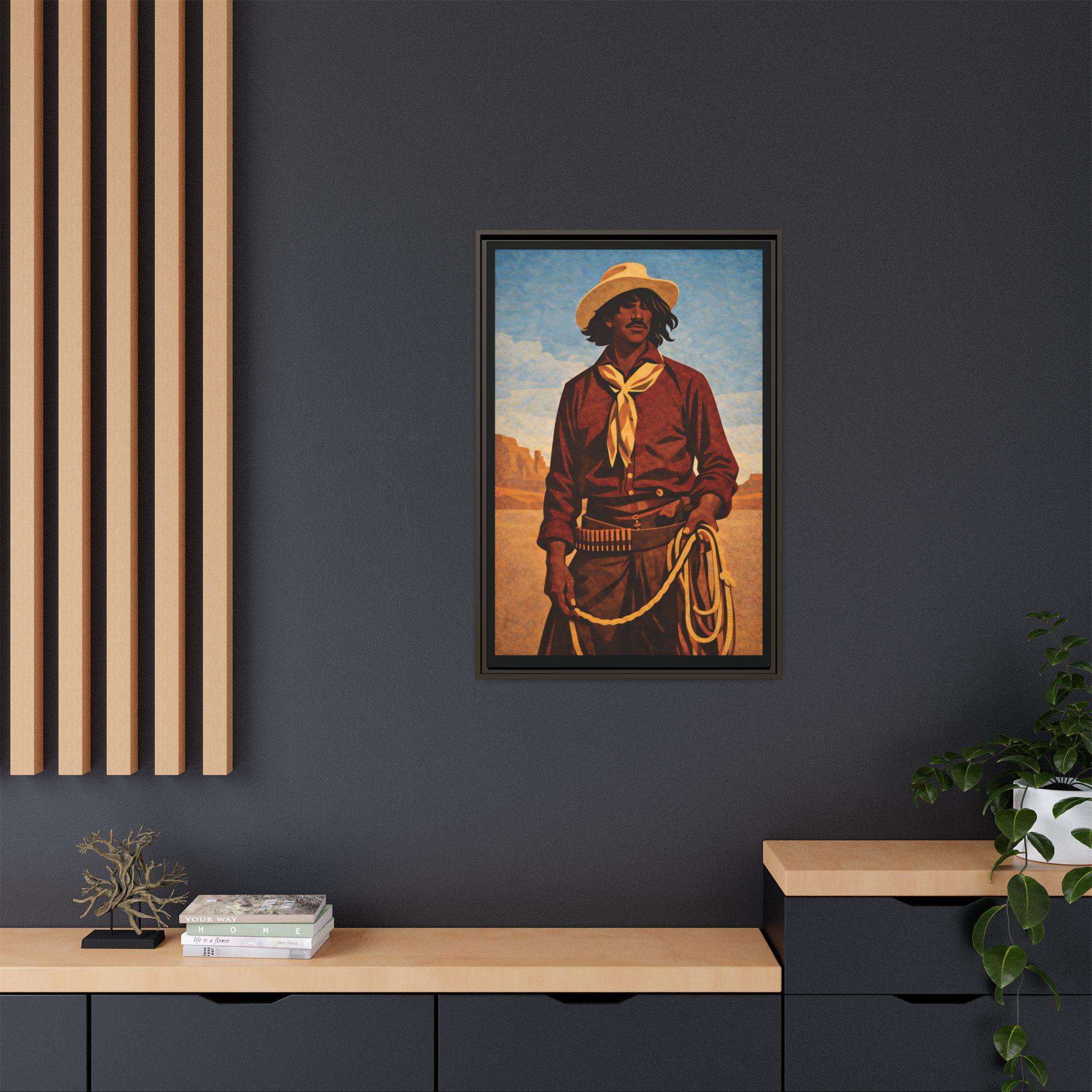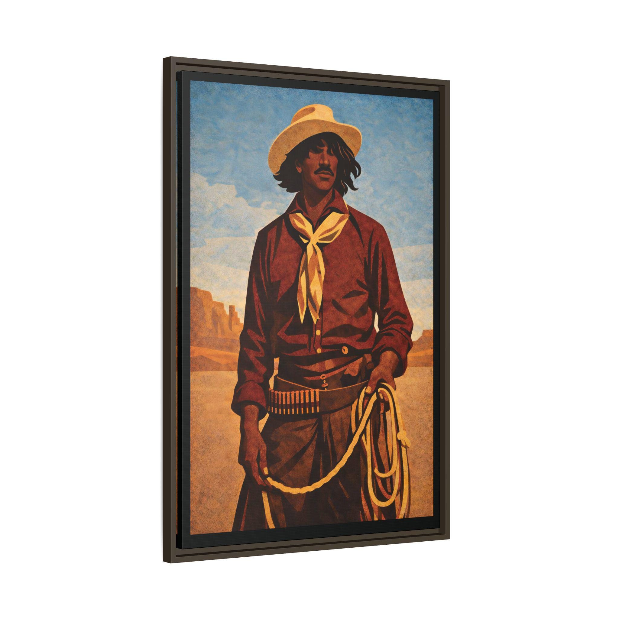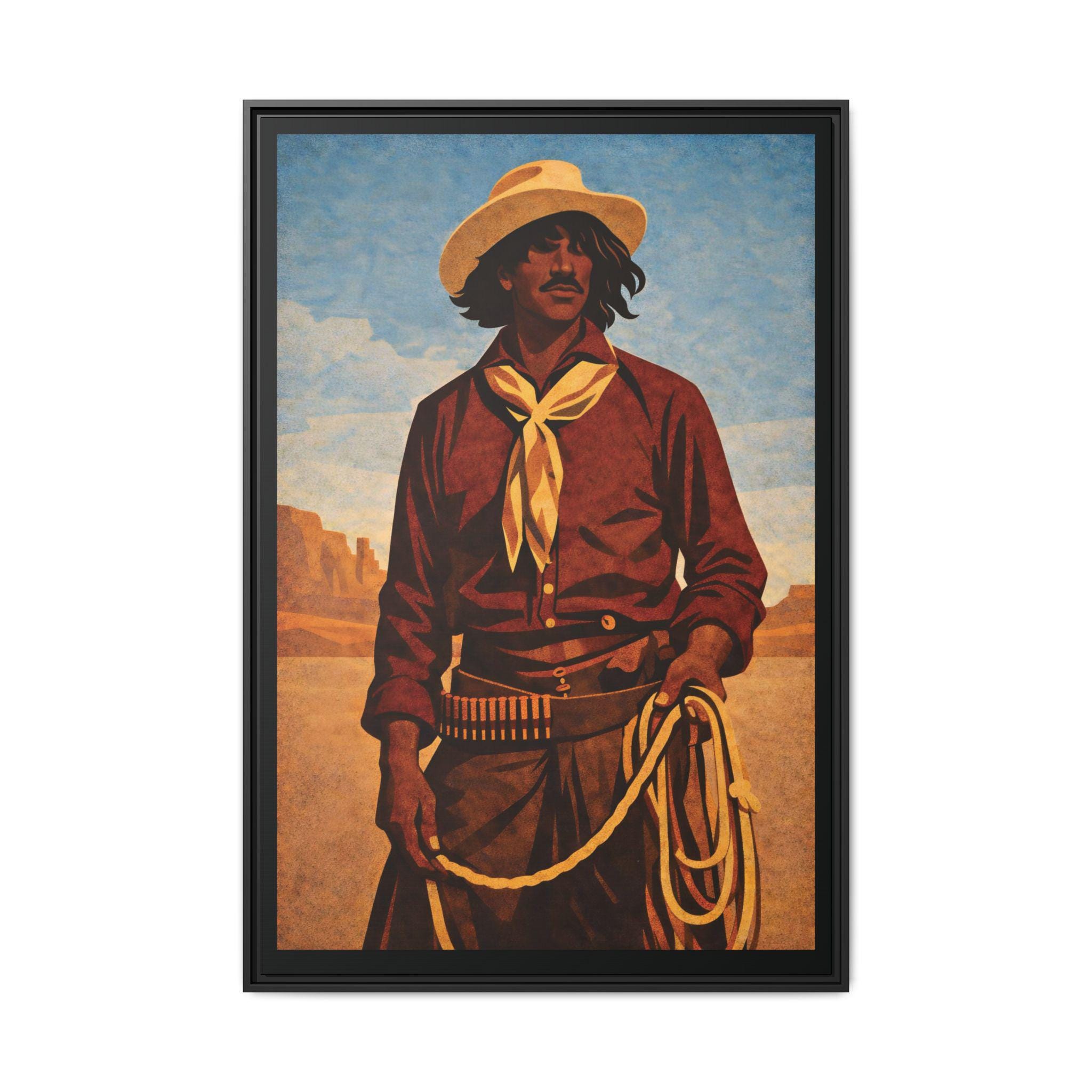 Nat Love is captured in a moment of poised motion, his coiled rope suggesting both skill and readiness. The composition balances movement with stillness, allowing his figure to command the space without exaggeration. His clothing and posture speak to expertise earned through repetition and survival, while the softened landscape recedes, refusing to compete for attention. Love’s presence reframes the cowboy not as folklore, but as a disciplined professional whose mastery shaped the terrain he moved through.