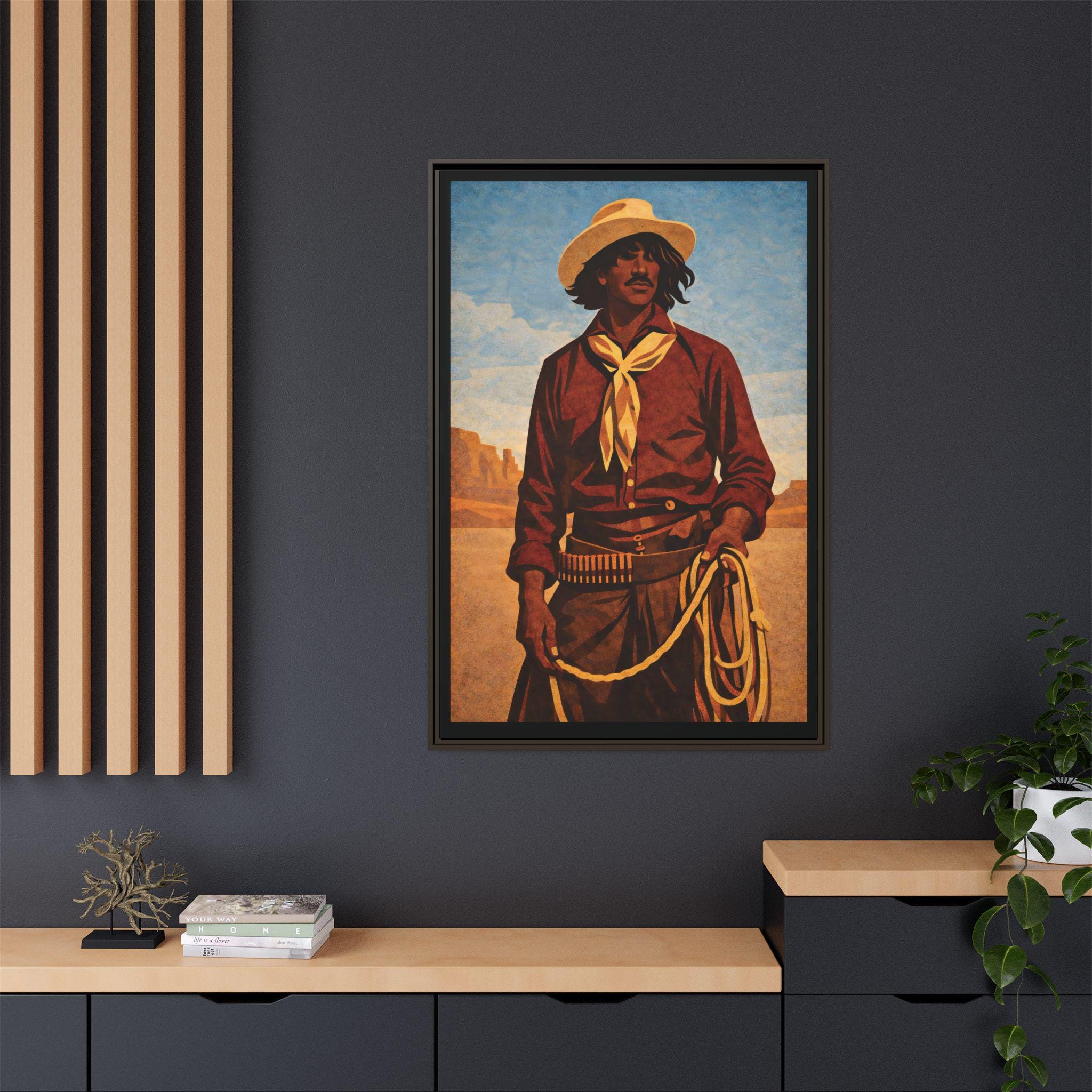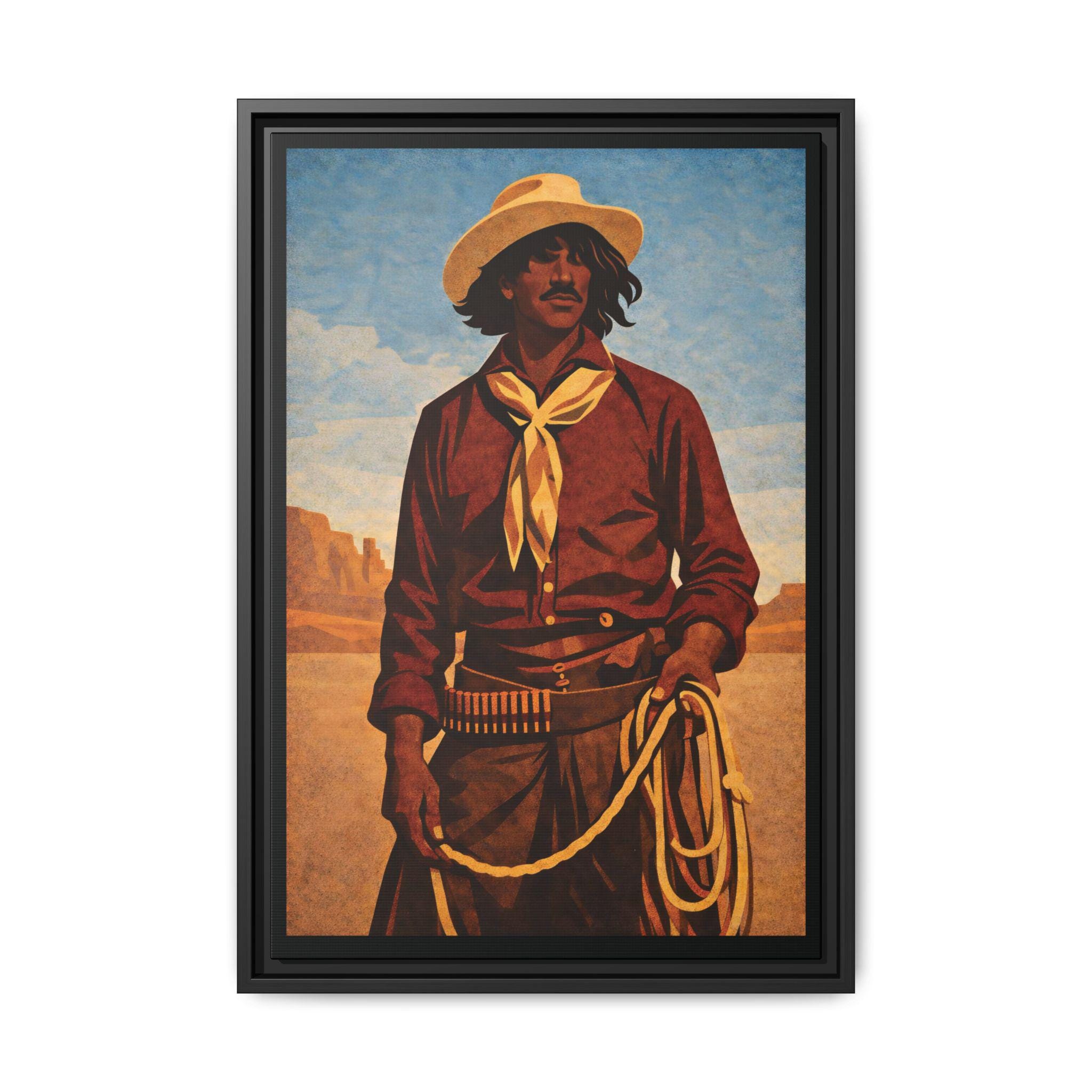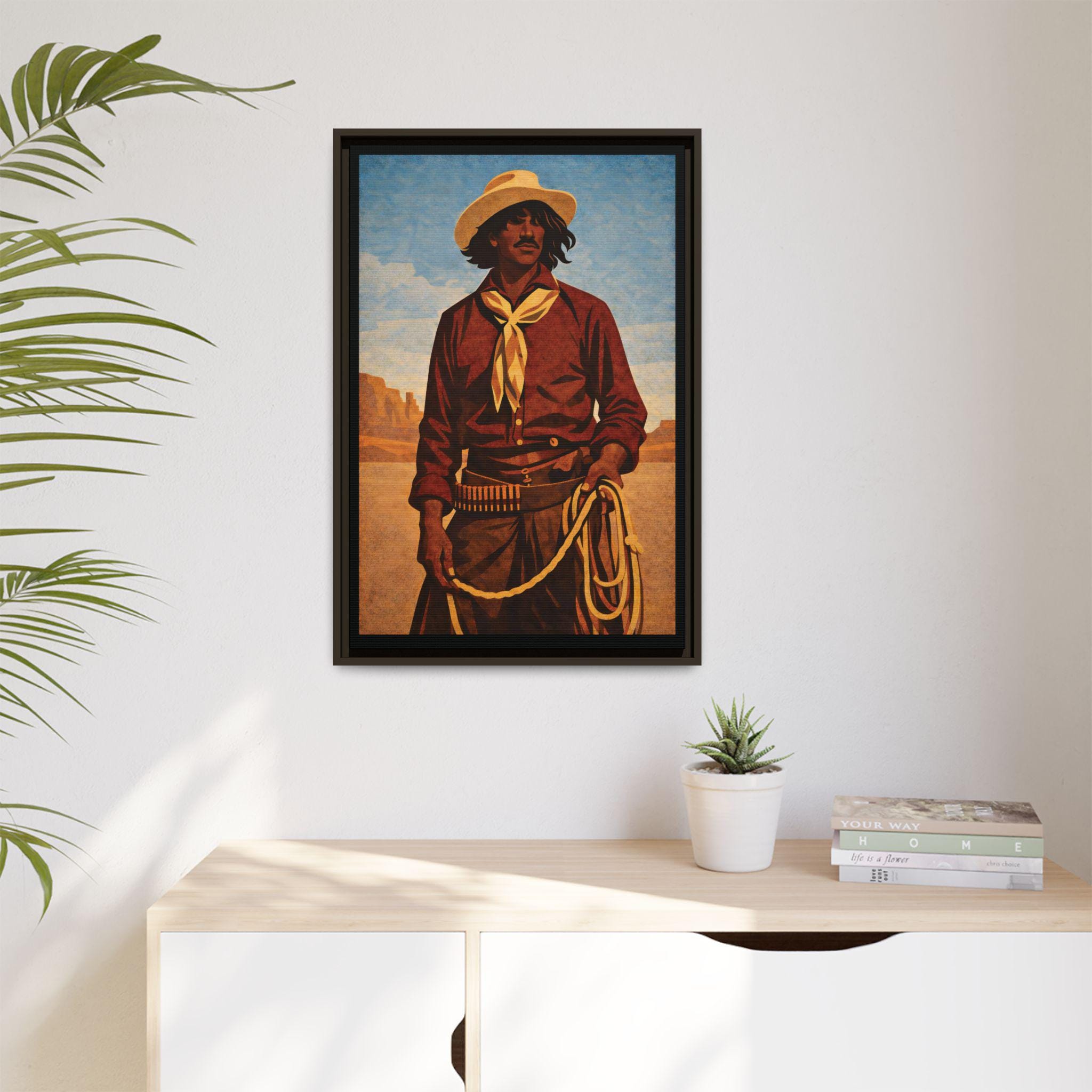 Nat Love is captured in a moment of poised motion, his coiled rope suggesting both skill and readiness. The composition balances movement with stillness, allowing his figure to command the space without exaggeration. His clothing and posture speak to expertise earned through repetition and survival, while the softened landscape recedes, refusing to compete for attention. Love’s presence reframes the cowboy not as folklore, but as a disciplined professional whose mastery shaped the terrain he moved through.
