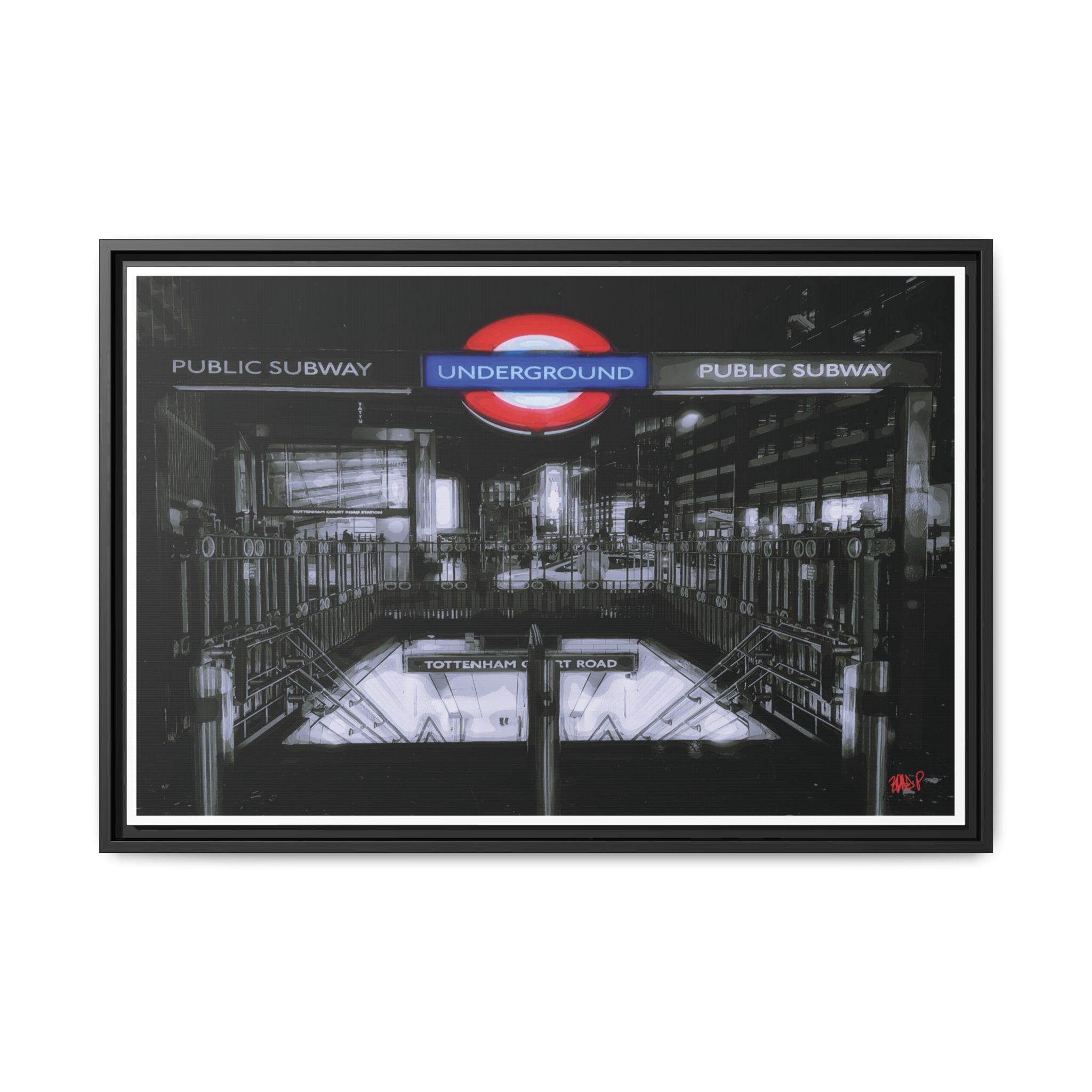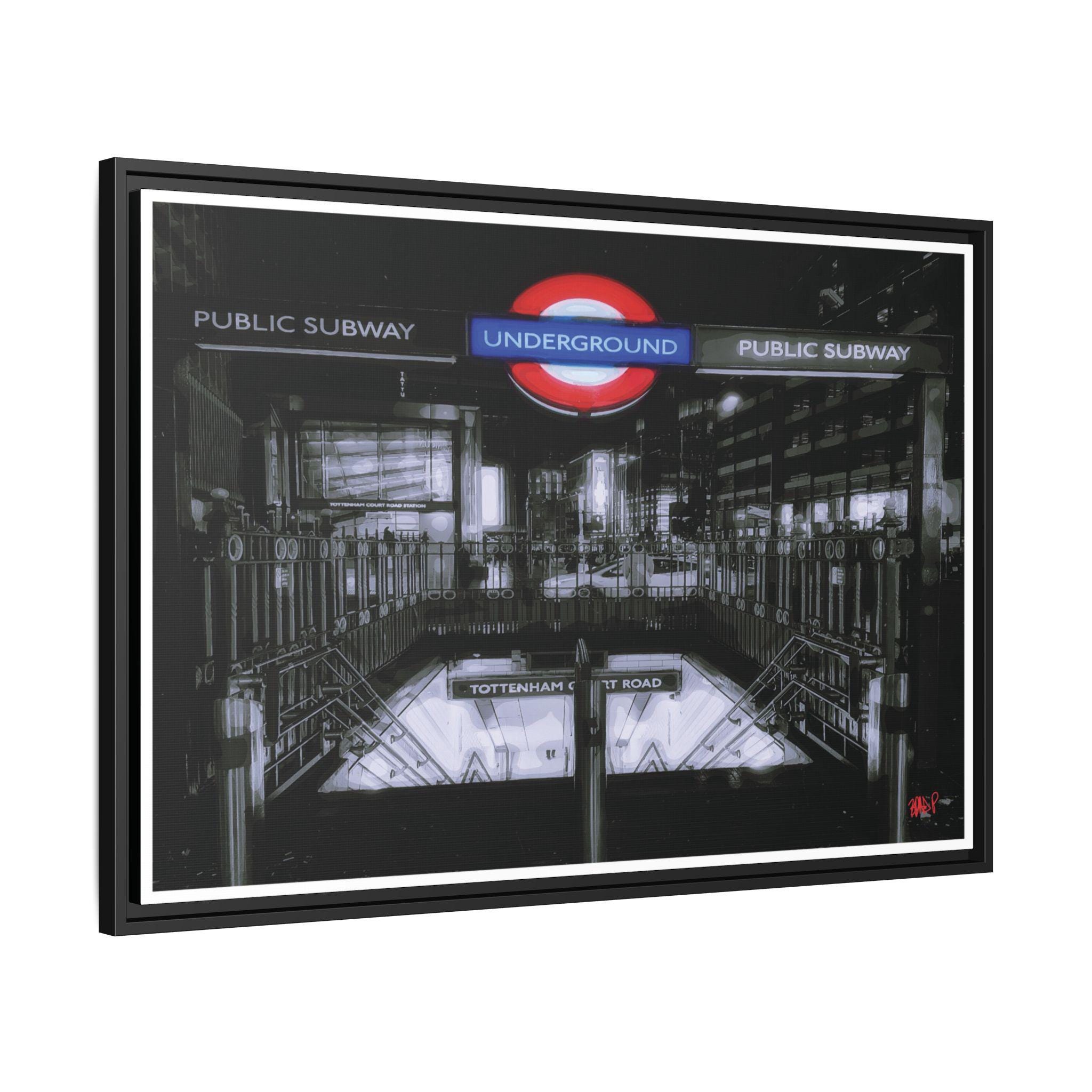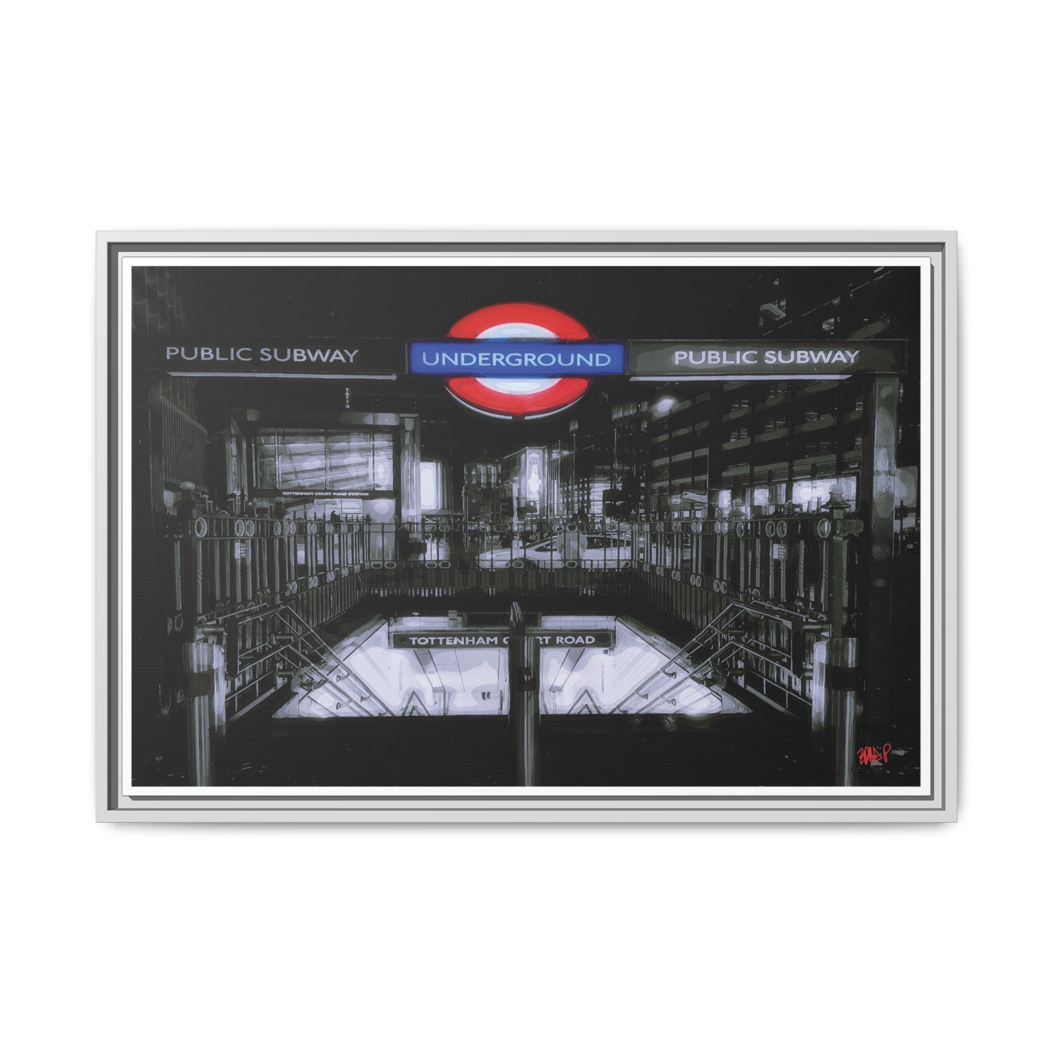 In Underground, the iconic London Tube entrance becomes a meditation on movement, memory, and modern anonymity. Rendered almost entirely in monochrome, the city dissolves into shadow and blur, leaving only the illuminated roundel — red and electric blue — as a pulse of life suspended above the descending stairwell.