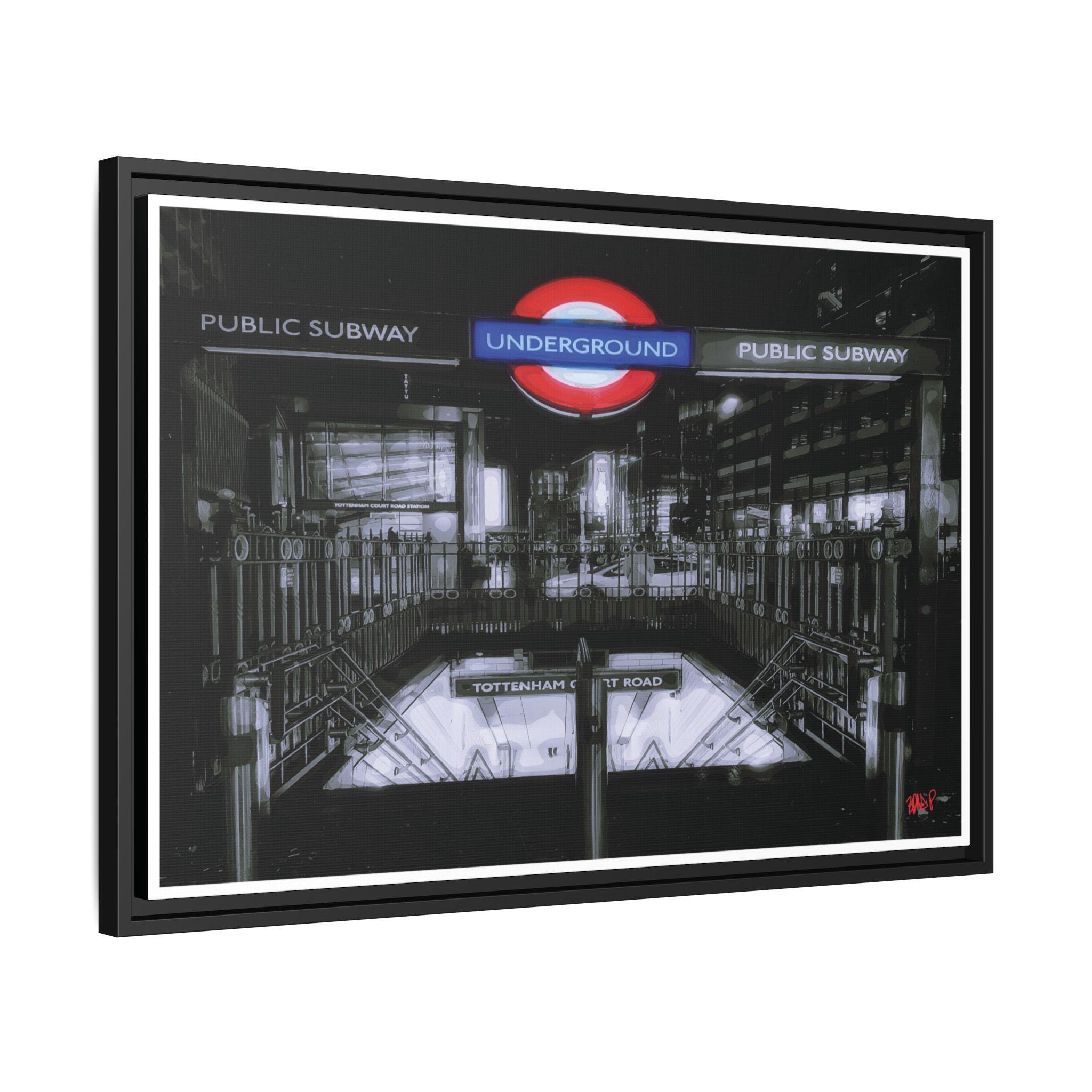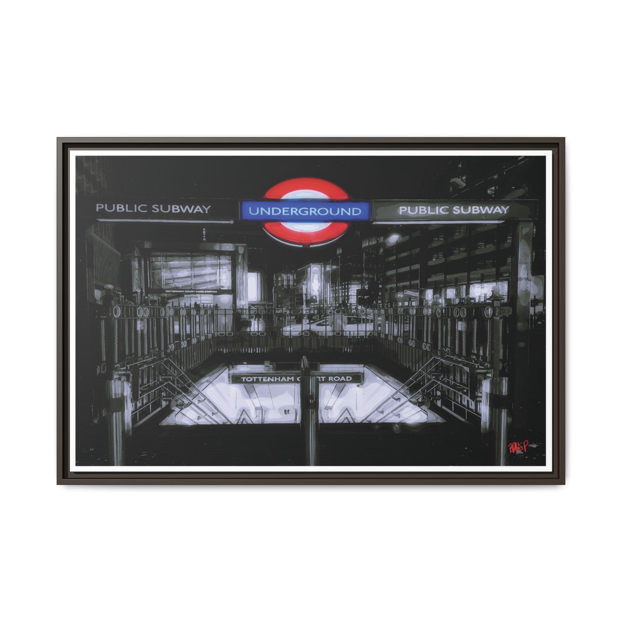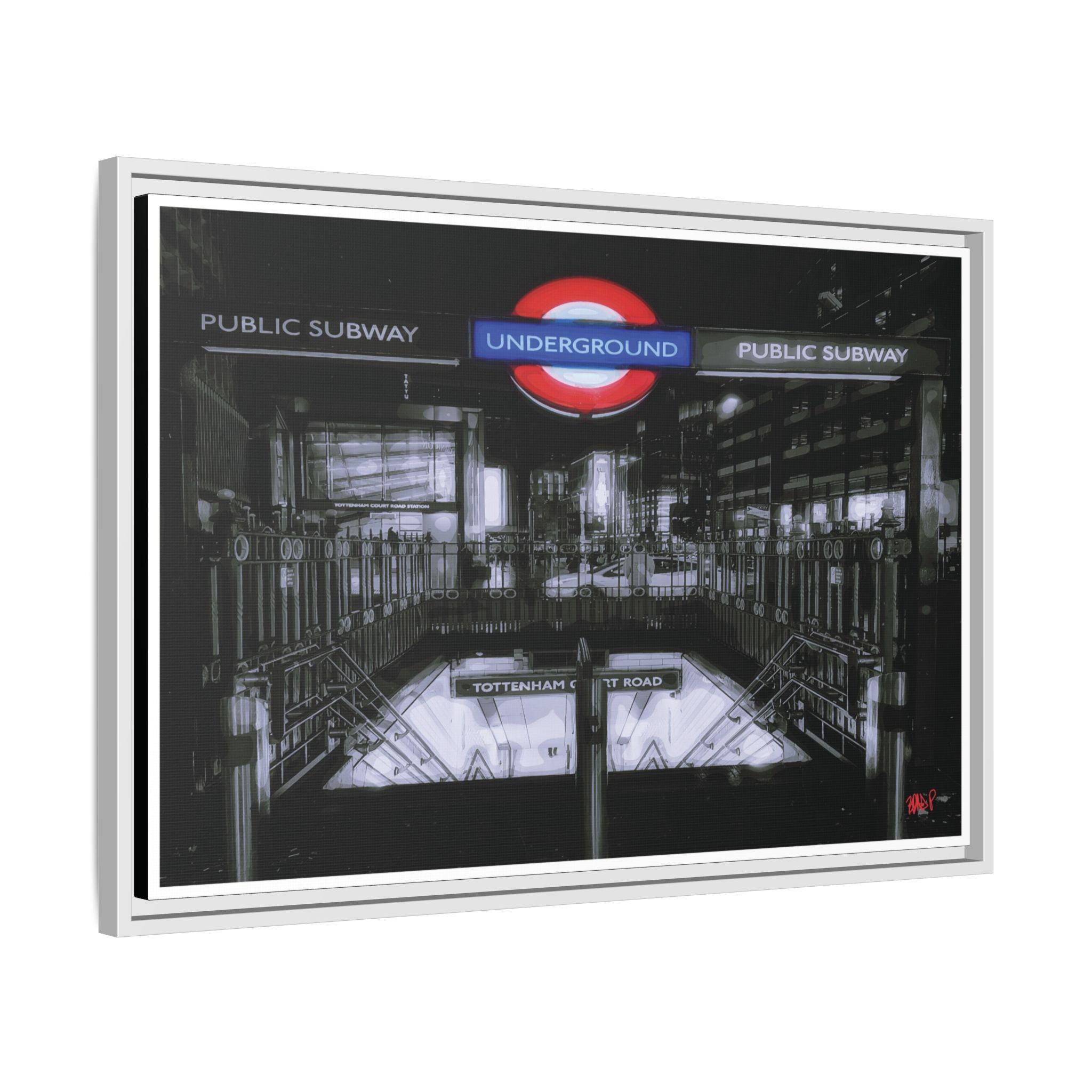 In Underground, the iconic London Tube entrance becomes a meditation on movement, memory, and modern anonymity. Rendered almost entirely in monochrome, the city dissolves into shadow and blur, leaving only the illuminated roundel — red and electric blue — as a pulse of life suspended above the descending stairwell.